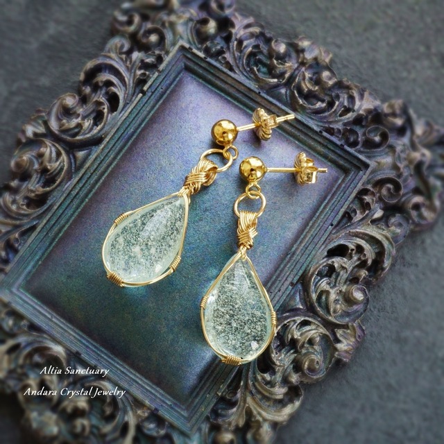 H様 9月のオーダー作品になります。 オーダー頂きありがとうございます。 ラムネソーダのような清涼感と神秘的な癒しのエネルギーを放つ「ブルートパーズ」に「シーフォーム」(海の気泡)入りのアンダラクリスタルです。 今月のお届けは「女神巻き®ピアス(14KGF ポスト&キャッチ式)」になります。 アンダラクリスタルをしずく型の両面カボションに研磨加工し、女神巻き®ピアスに仕立てました。 ----------------------------------------------------- < 商品詳細 > ■アンダラクリスタル ブルートパーズ/シーフォーム (シェラネバダ産) ■Parts: 14金ゴールドフィルドワイヤー・ピアスポスト&キャッチ(14KGF) ■Size(ピアス金具下):H21×W11×D7mm ----------------------------------------------------- <ブルートパーズの特性> ブルートパーズは、存在の純粋さと回復の周波数を表しており、エネルギーフィールドを浄化しながら精神的な体をリフレッシュします。 <シーフォームの特性> シーフォーム(海の泡):私たちの発想の主要な水域を表すこれらのアンダラクリスタルは、可能性として創造の元の青写真に響きます。その沸騰する深さの中で、人は存在の時代を超越したものに運ばれ、無限の可能性と約束があります。 ----------------------------------------------------- < アンダラクリスタルとは > アンダラクリスタルは、アメリカ・シエラネバダ山脈の麓、ネリーランドから採掘される色とりどりの火山性の天然ガラスです。1967年、レディ・ネリー女史により発見され、神聖な石として寺院やピラミッドなどに置かれ、崇められてきました。 アンダラクリスタルは、黒曜石(オブシディアン)に似たガラス質で、ゴールド・シルバー・イリジウム・ロジウム・クロミニウム・プラチナなどの単原子成分が含まれており、レインボーの7色以上の美しいカラーを放つ魅力を持っています。 このエネルギーは非常に高い波動を示し、優れたヒーリング能力を持っています。また、高次の意識との接続を助け、心と体、精神の調和を促します。アンダラの特質は、霊的な成長をサポートし、日常生活における安らぎを与えてくれると言われています。