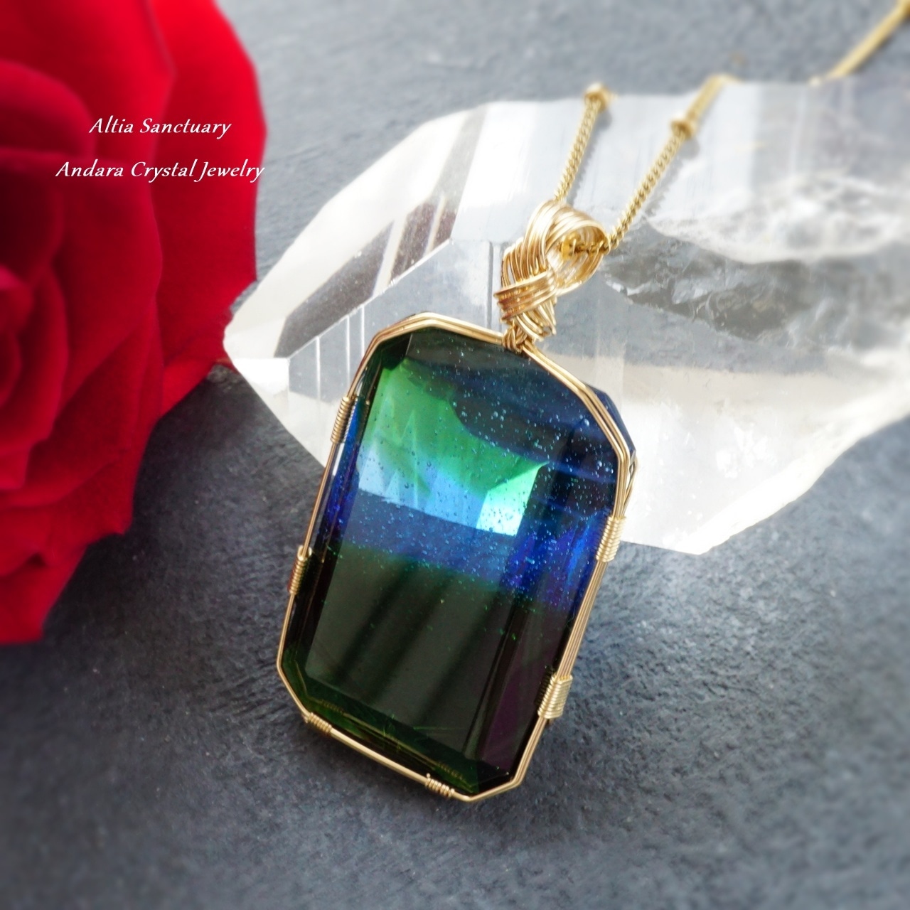 【N様オーダー】超レア!マルチレインボーアンダラクリスタル(エメラルドシフト/エレスチャルサファイア/パステルアイス/アースシャーマン)エメラルドカット女神巻き®ペンダント-やや大きめサイズ-1049