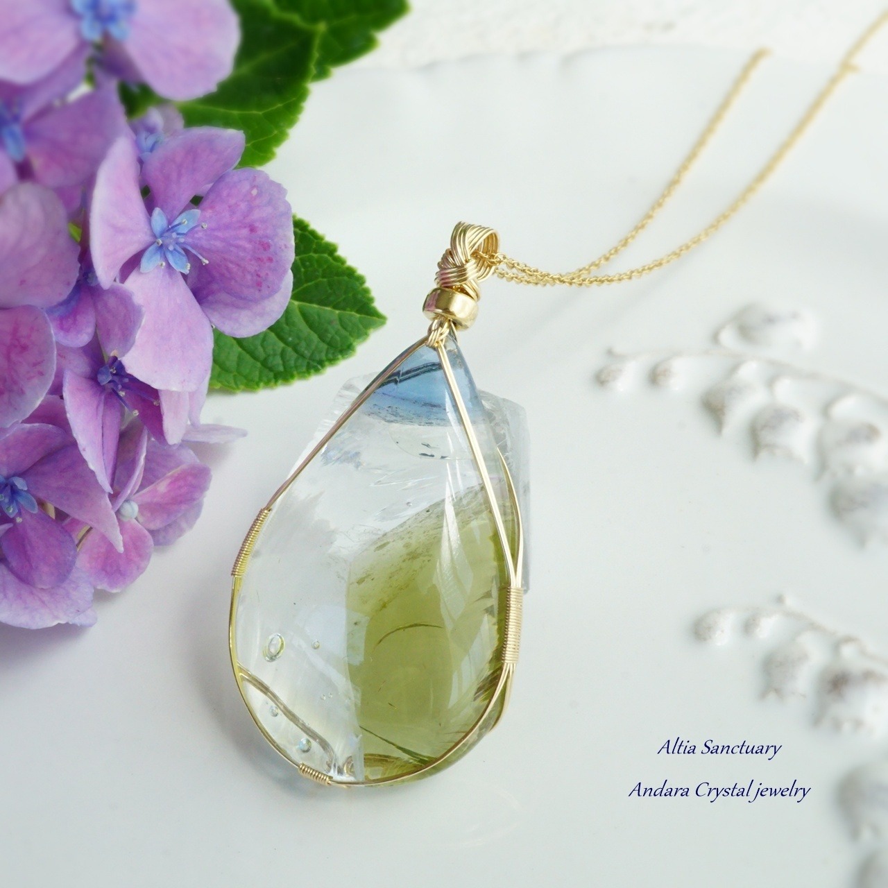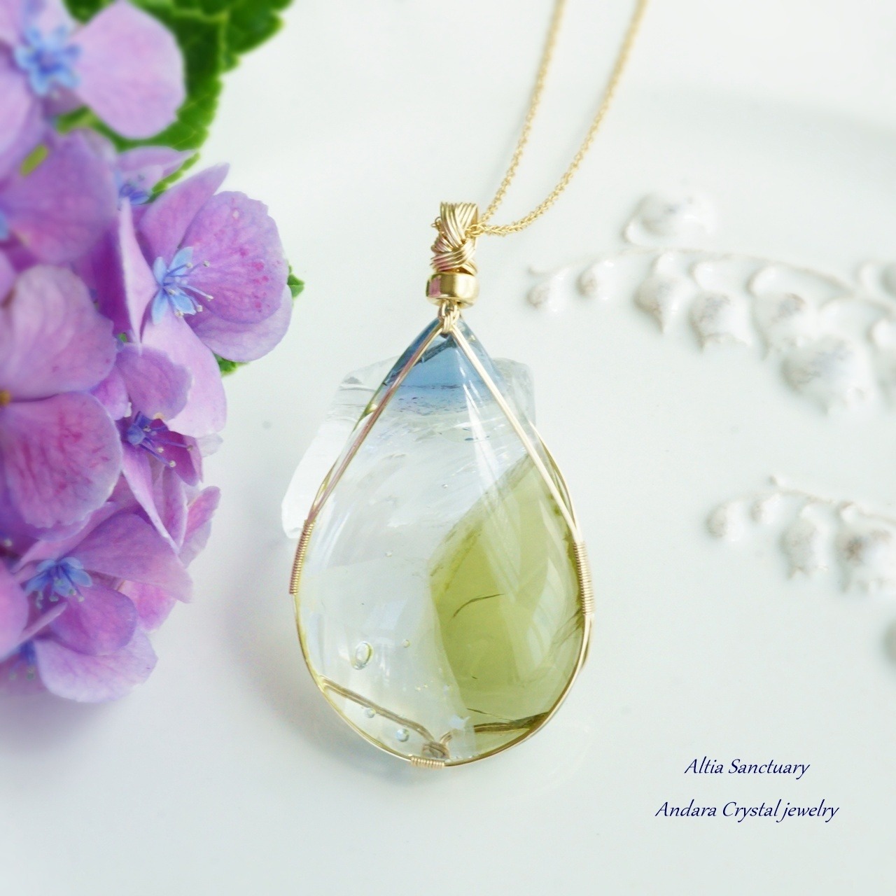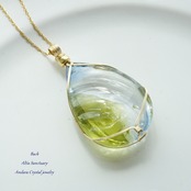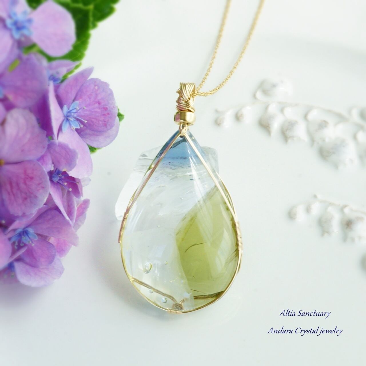 「テラオリーブ」「コスミックアイス」「サファイア」のマルチカラーアンダラクリスタル、大きめ原石(26g)をしずく形に研磨し、ロンデル付きの女神巻き®ペンダントトップに仕立てました。