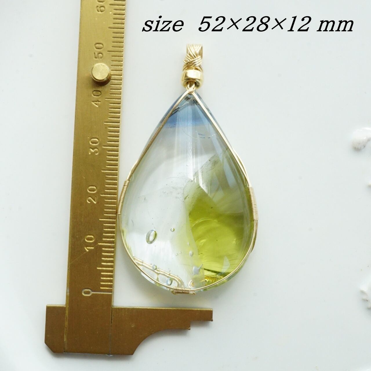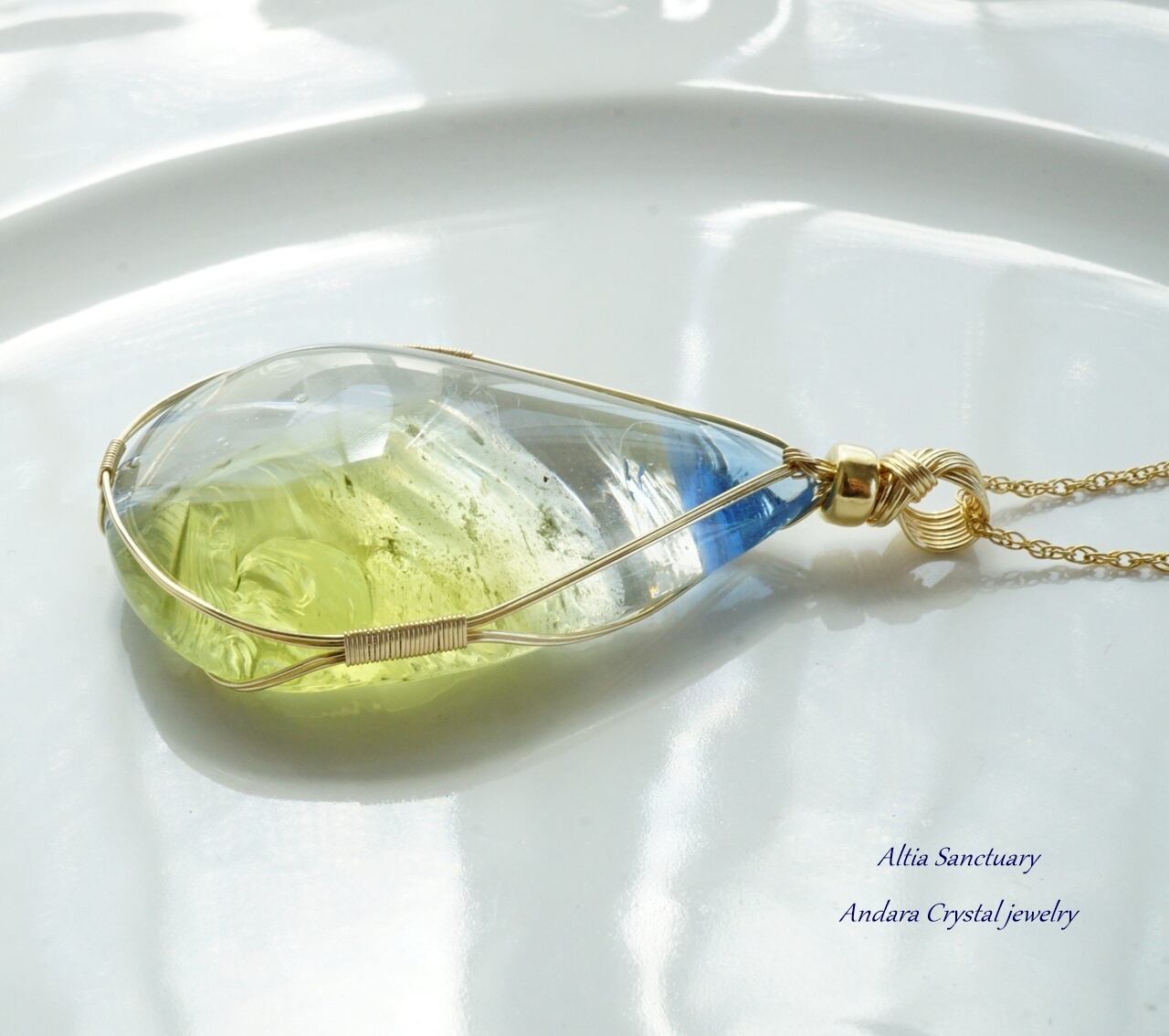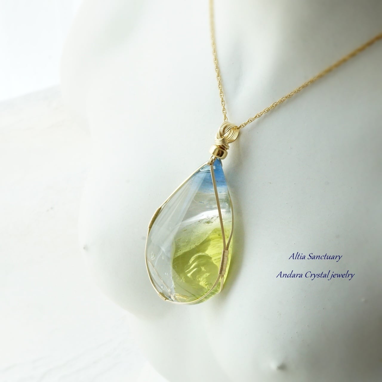 「テラオリーブ」「コスミックアイス」「サファイア」のマルチカラーアンダラクリスタル、大きめ原石(26g)をしずく形に研磨し、ロンデル付きの女神巻き®ペンダントトップに仕立てました。