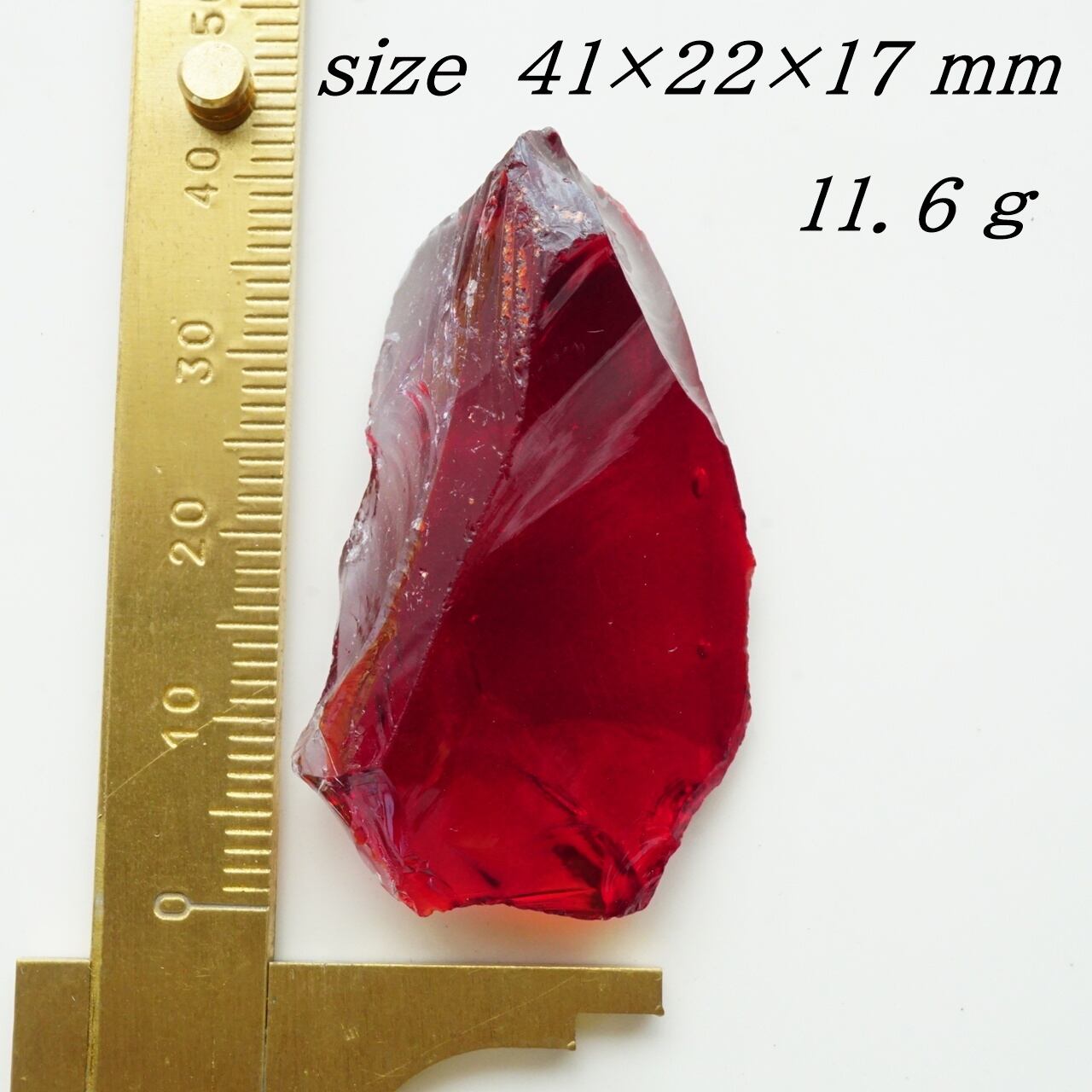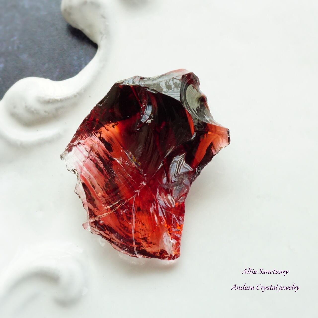 上の石は、オレンジと深い赤が組み合わさった「ハーツエッセンス」にレッド系のアンダラクリスタルが混ざりあったマルチレインボーアンダラクリスタルです。ラフにダイヤ型に研磨しました。