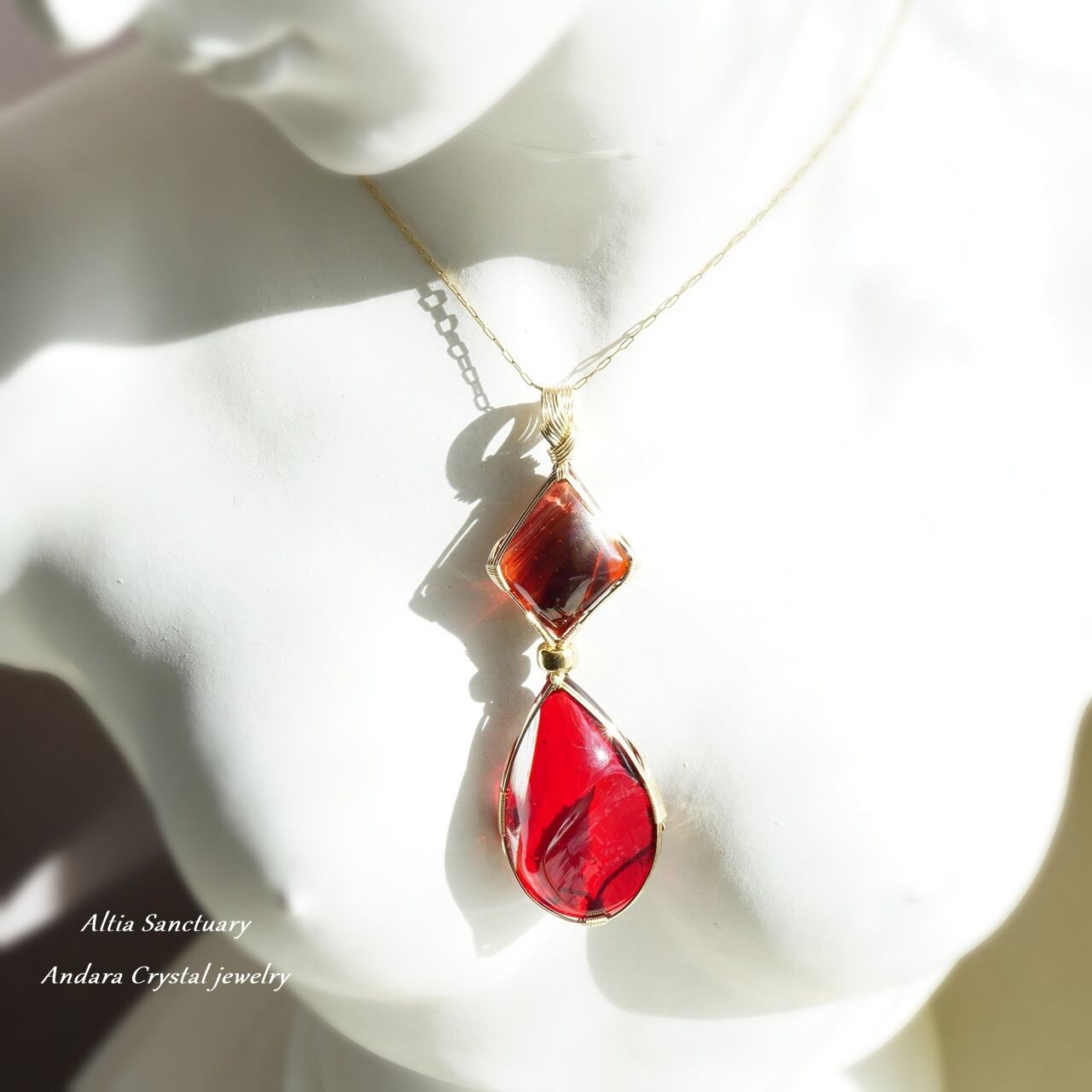 【W様オーダー】レア!アンダラクリスタル(マルチレインボー×スカーレットシフト)ラフ研磨加工の女神巻き®ツインペンダントトップ