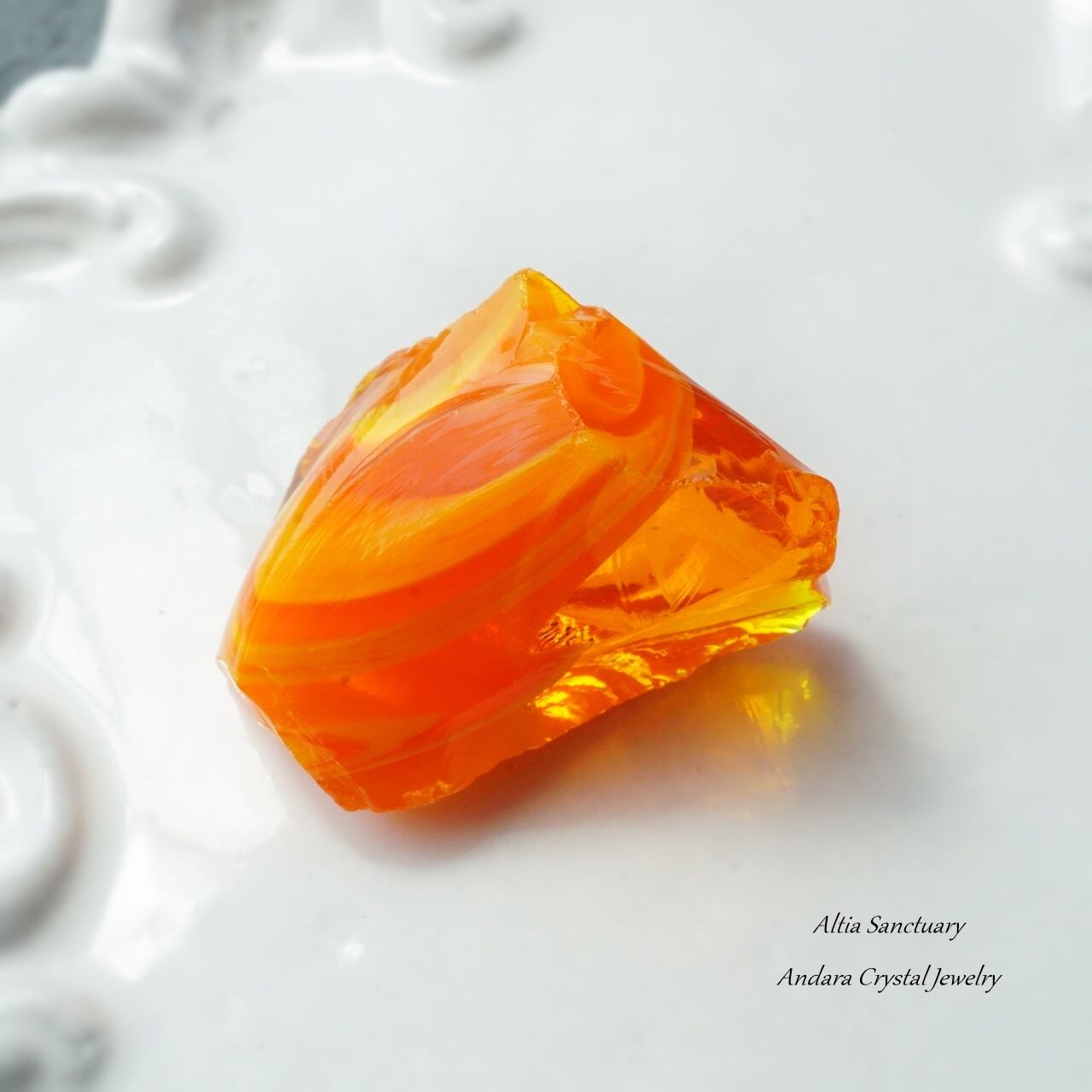透明のファイヤーオパールや半透明のファイヤーオパール、パステルイエローのソラリスなどがマーブル状に内包された明るいオレンジカラーのアンダラクリスタルです。