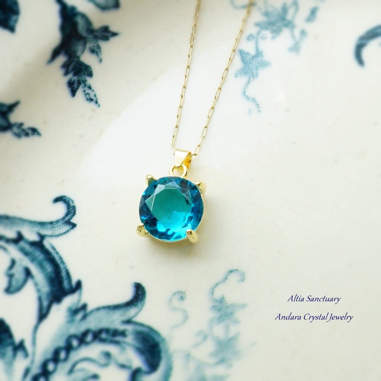 深く広い海を思わせるブルーの色合いが魅力的なアンダラクリスタルです。10ミリの小さなダイヤモンドカット(ファセットカット)に研磨加工し、Silver925製・18KGP仕上げのペンダント枠にセットいたしました。