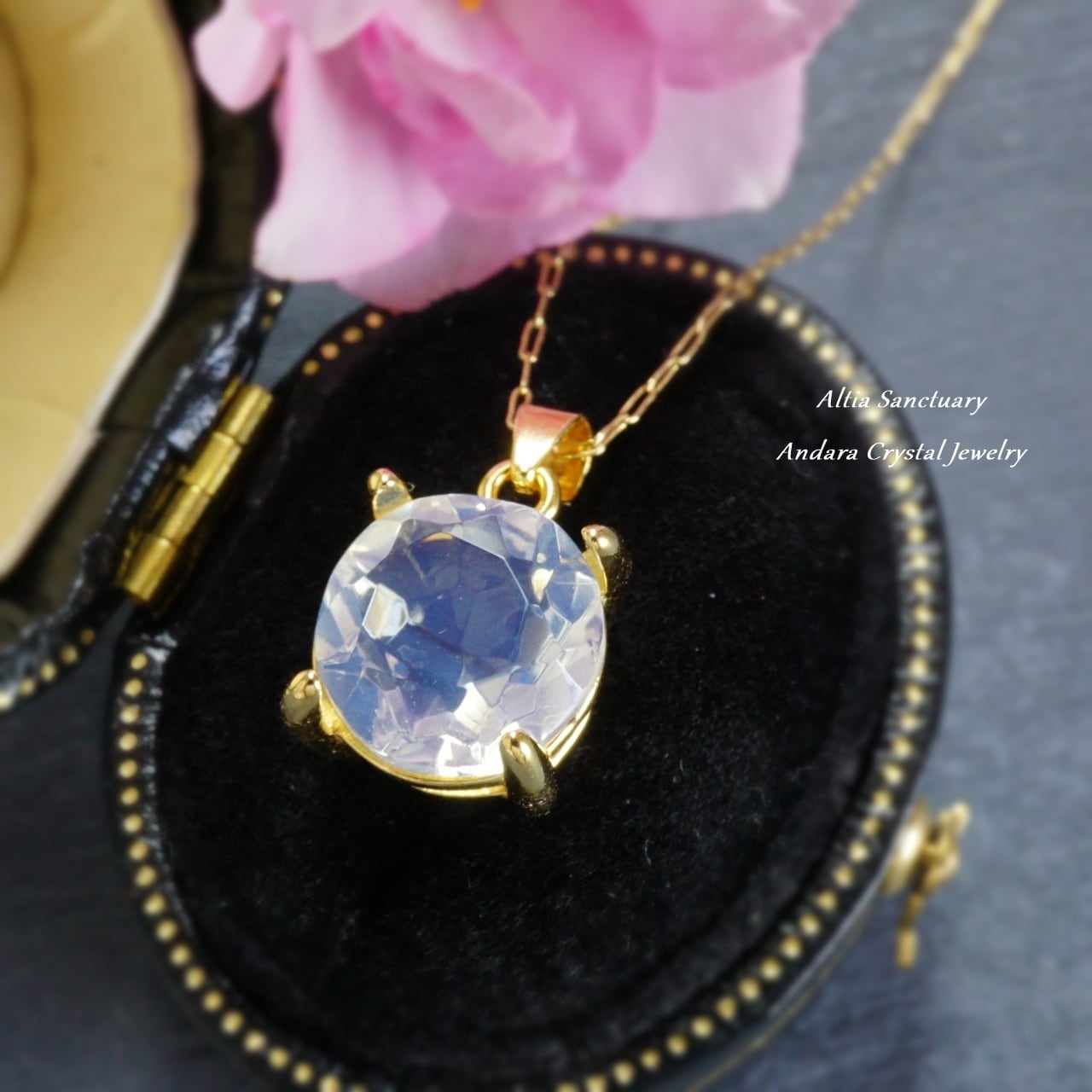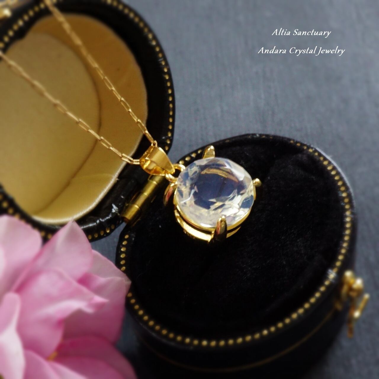 乳白色の中にも淡くブルーやイエローやピンクなどミルキーで神秘的な輝きを放つ「エンジェル―ラ/コスミックアイス」を、10ミリの小さなダイヤモンドカット(ファセットカット)に研磨加工し、Silver925製・18KGP仕上げのペンダント枠にセットいたしました。