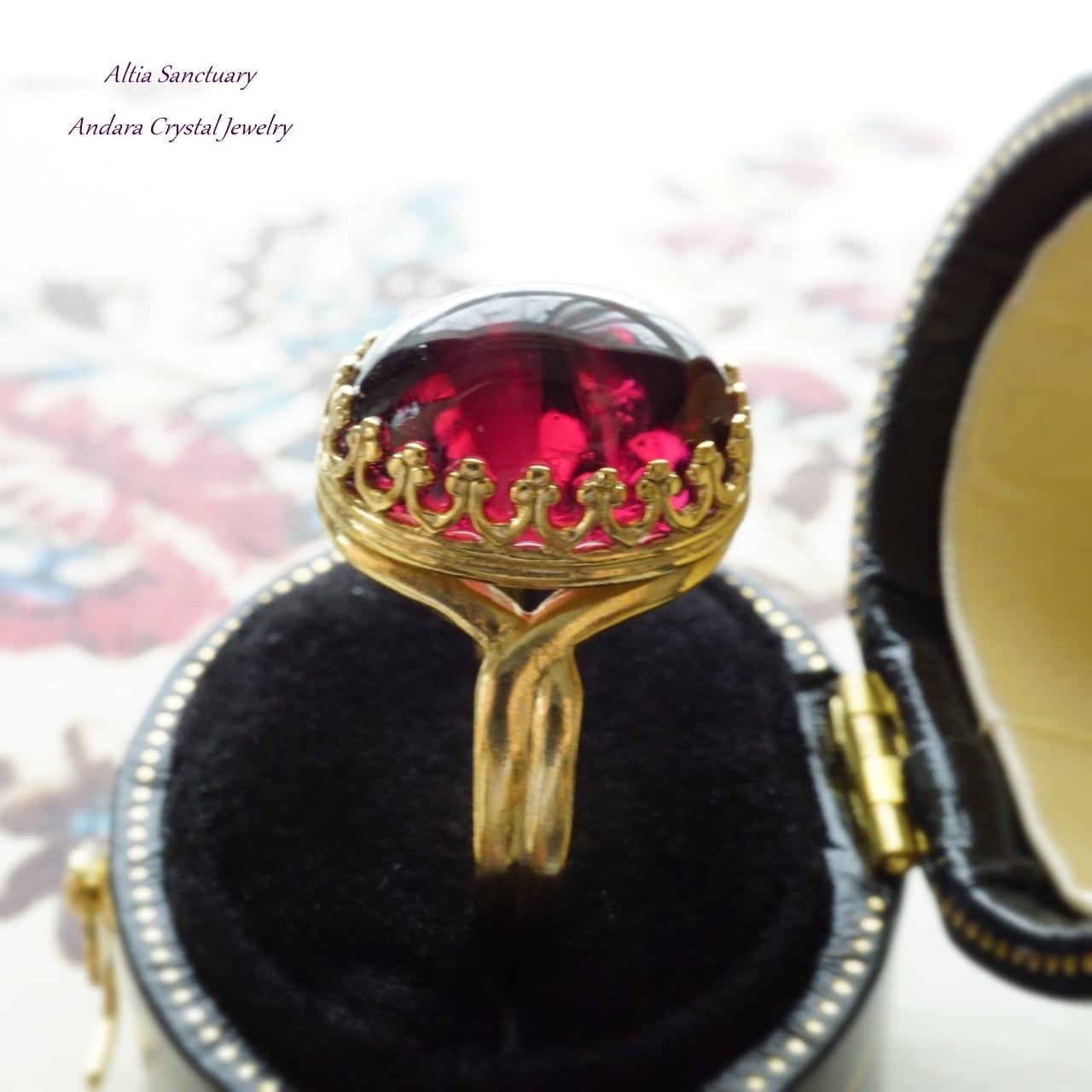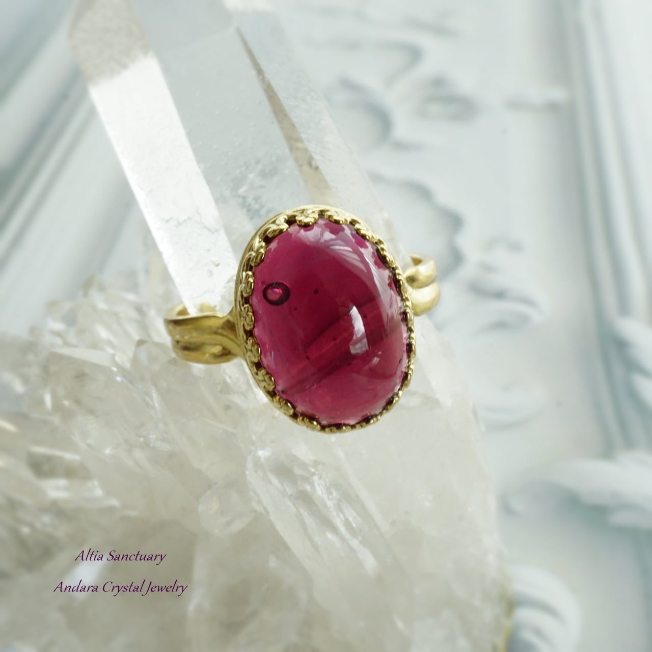 アンダラクリスタル(ラズベリーレゾナンス)のオーバルカボションのクラウン(王冠)リングです。深いワインレッド色でアンティークな雰囲気漂うリングになります。