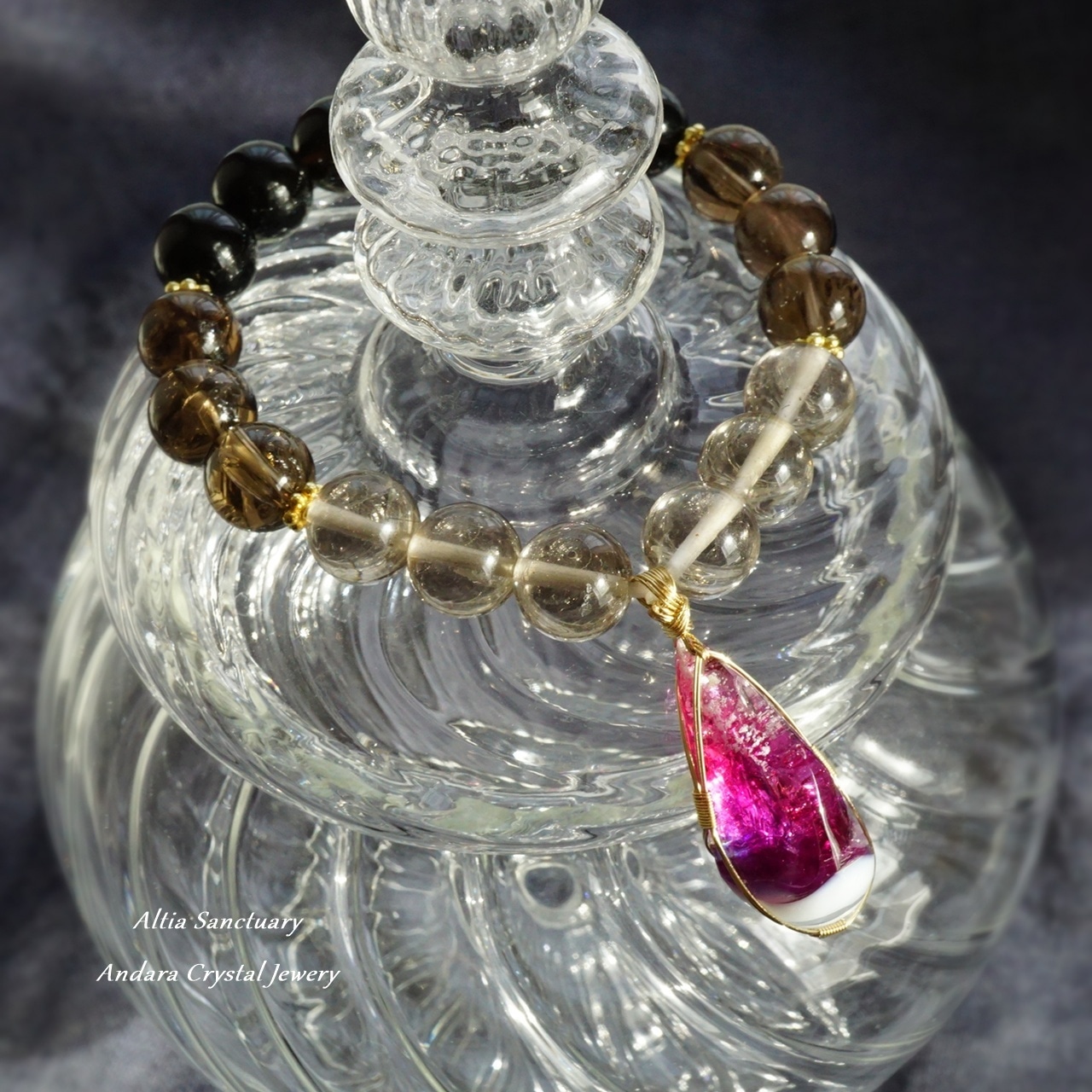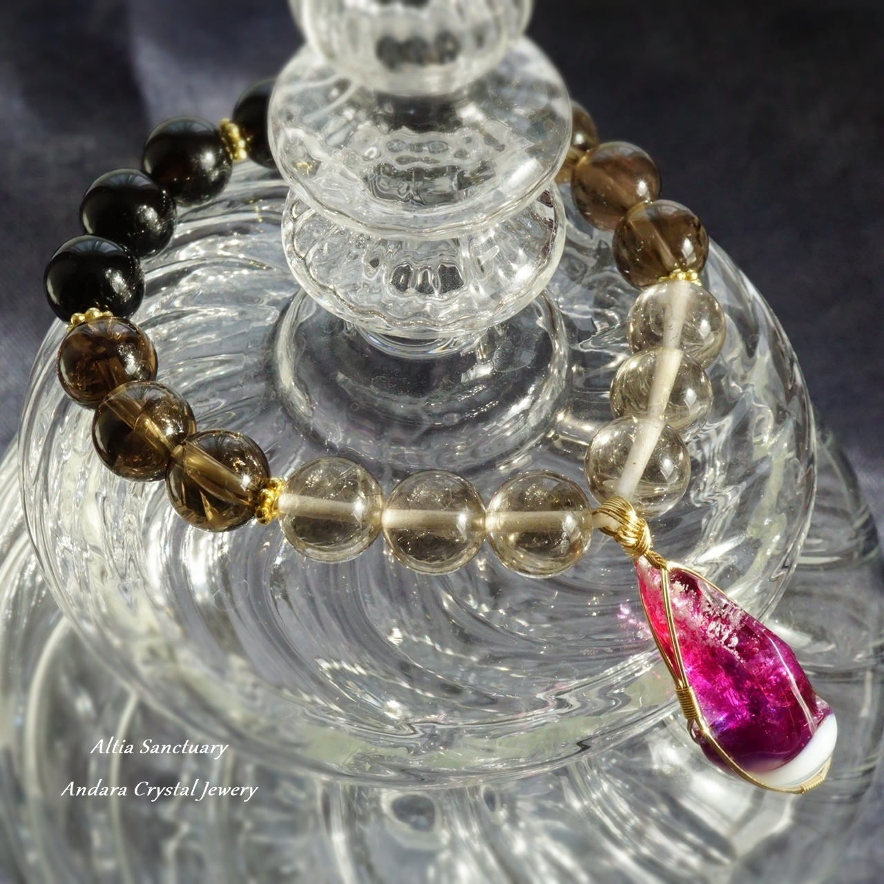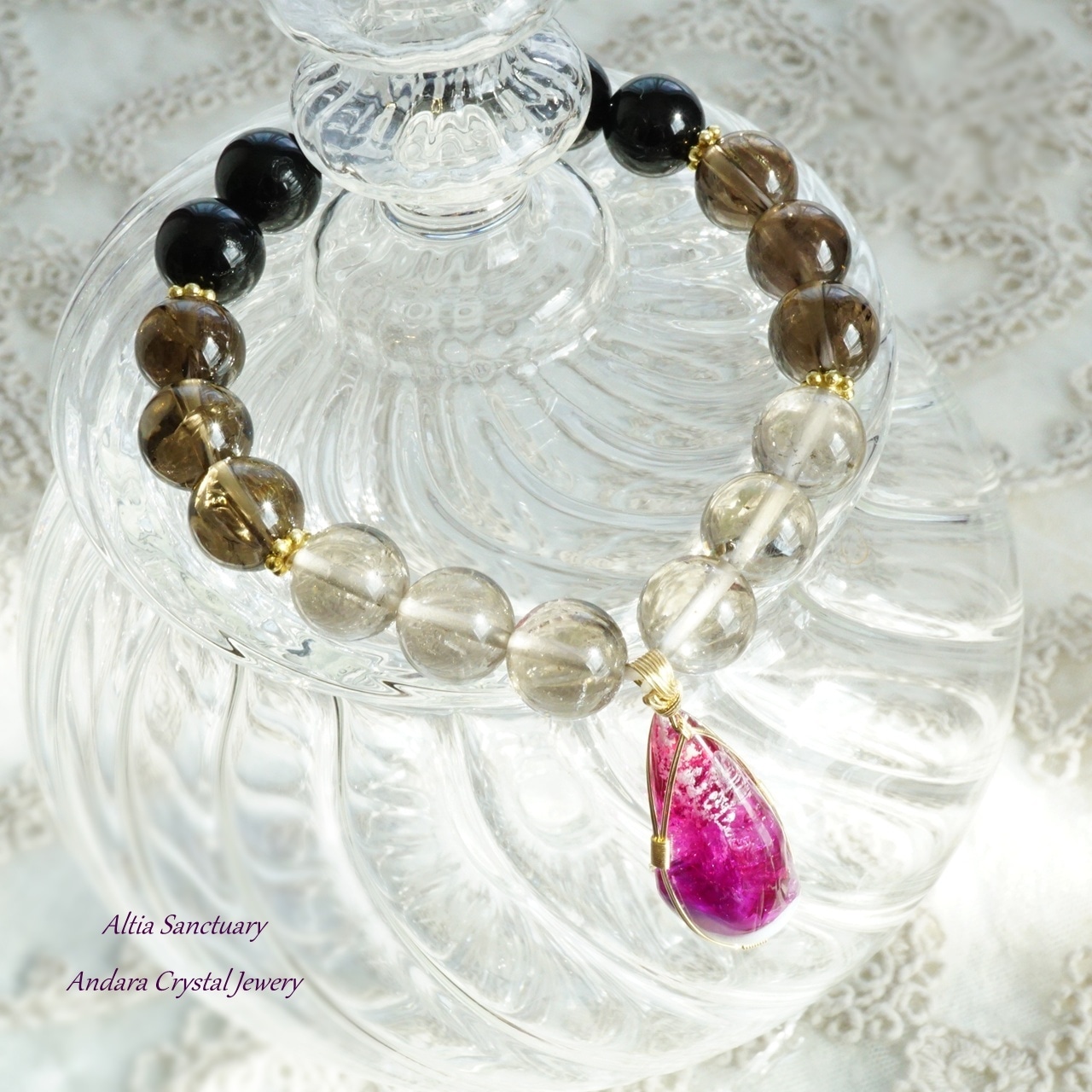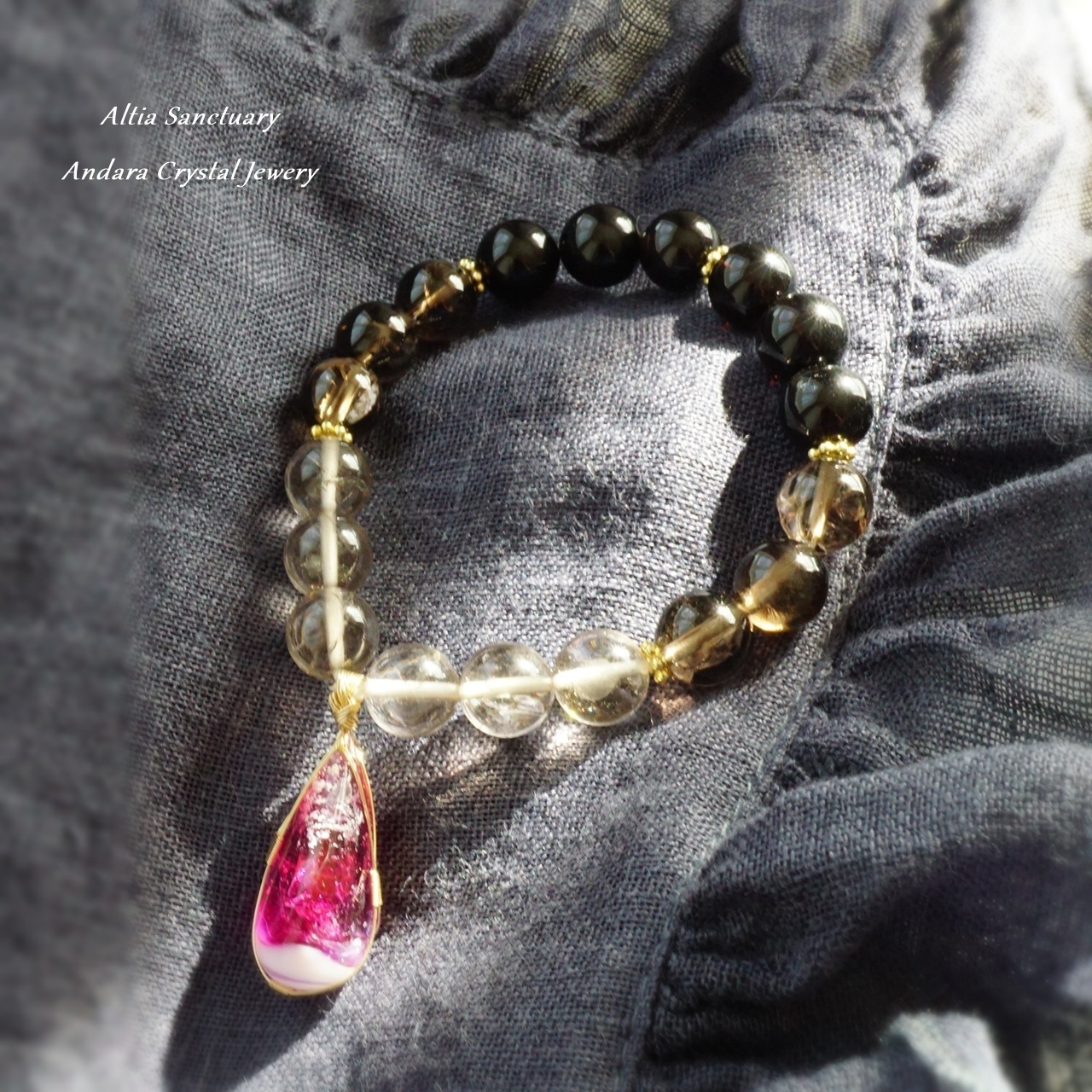 マルチレインボーアンダラクリスタルのブレスレットをオーダー頂きました。ブレスレットには天然石のモリオン、スモーキークォーツをリクエスト。マルチレインボーは複雑な形でしたので、ラフ研磨で磨き、女神巻き®を作り、天然石ブレスレットに装着いたしました。