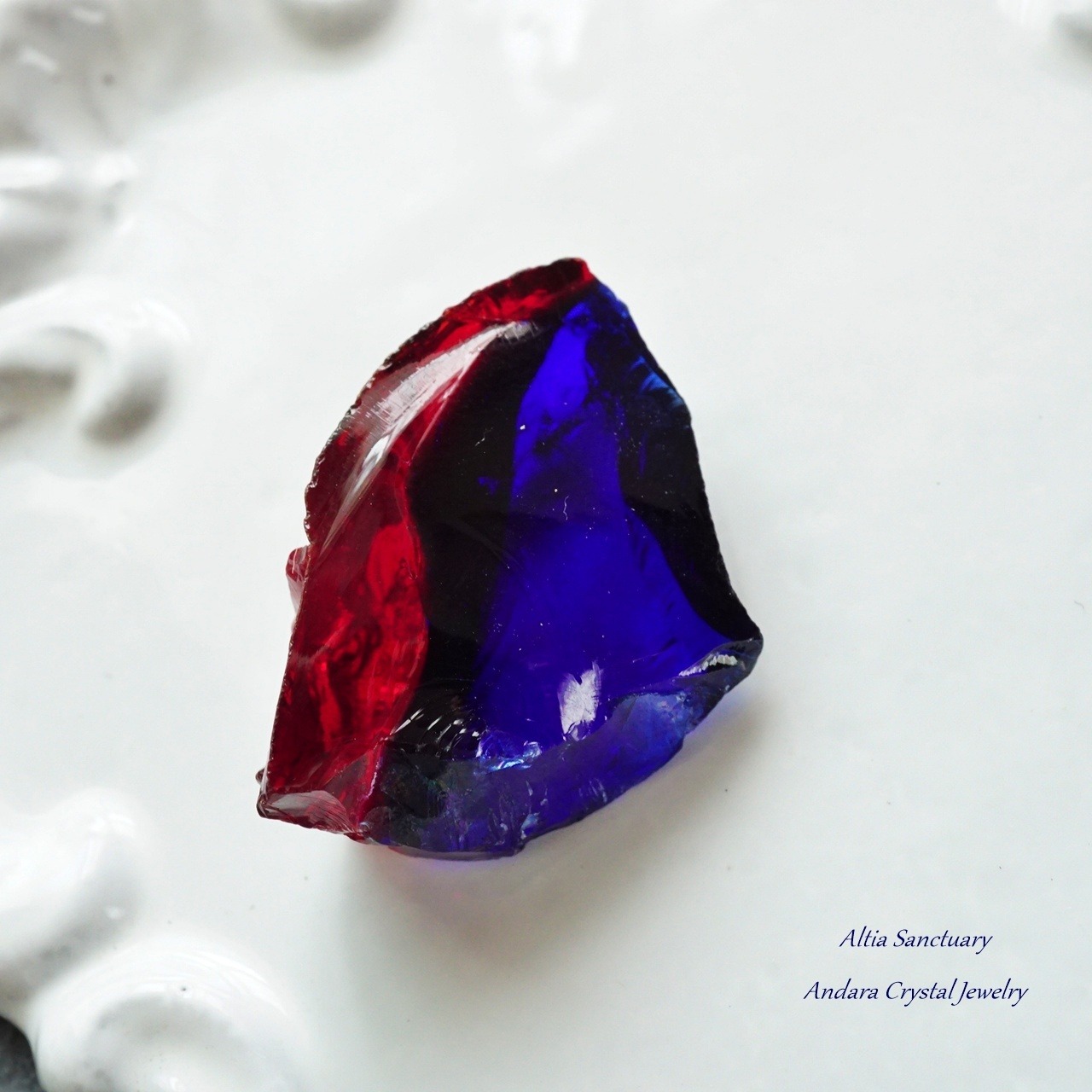 紫の光が内側から輝く「タンザナイトファイヤー」に「スカーレット」が付いたレアなバイカラーアンダラクリスタルです。