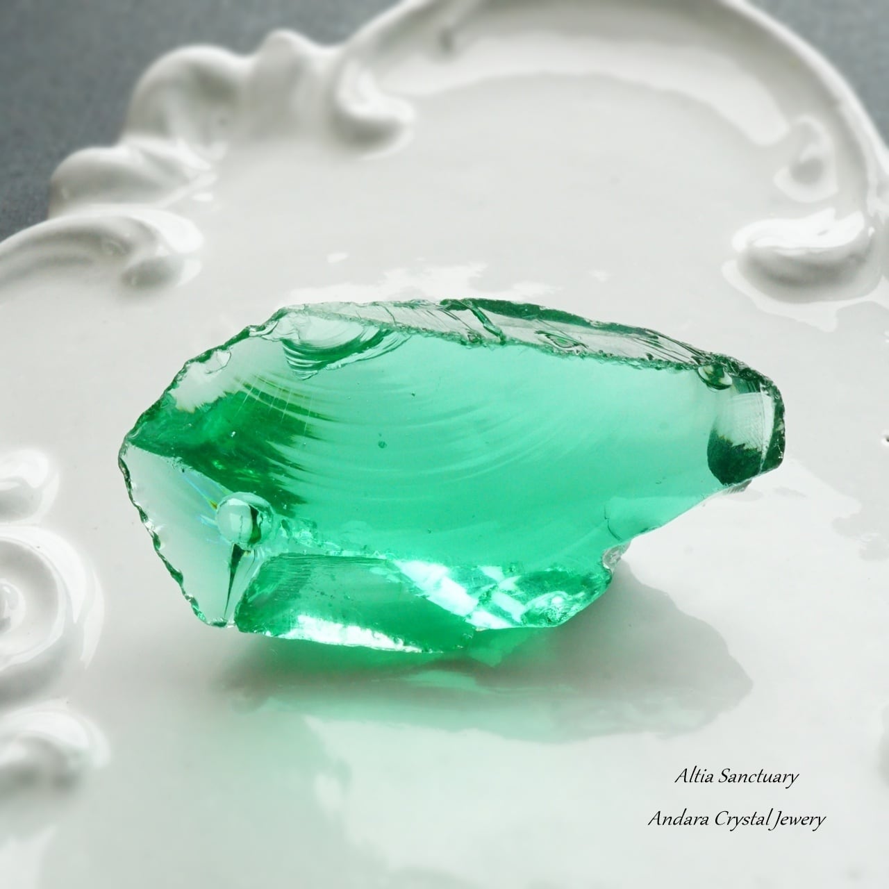 明るいエメラルドグリーンは、穏やかなエネルギーを放つ「ブルー/グリーンエメラルドシフト」です。波紋の広がりと気泡が2粒見られます。