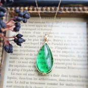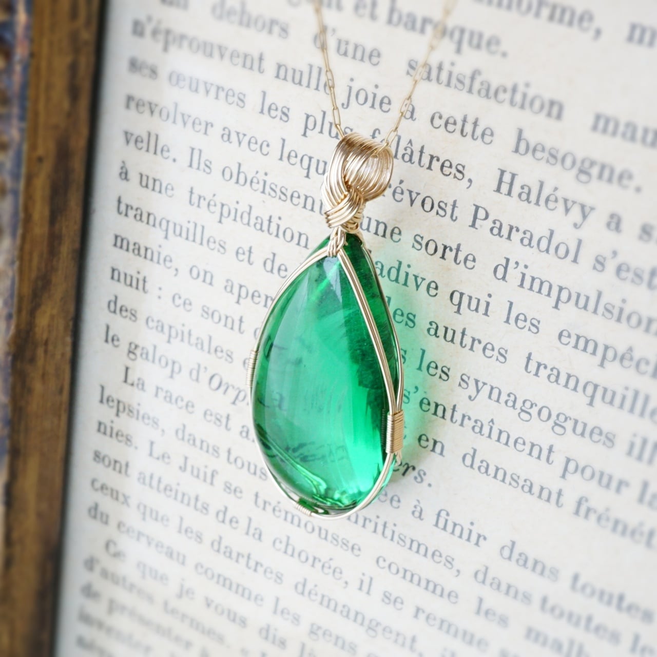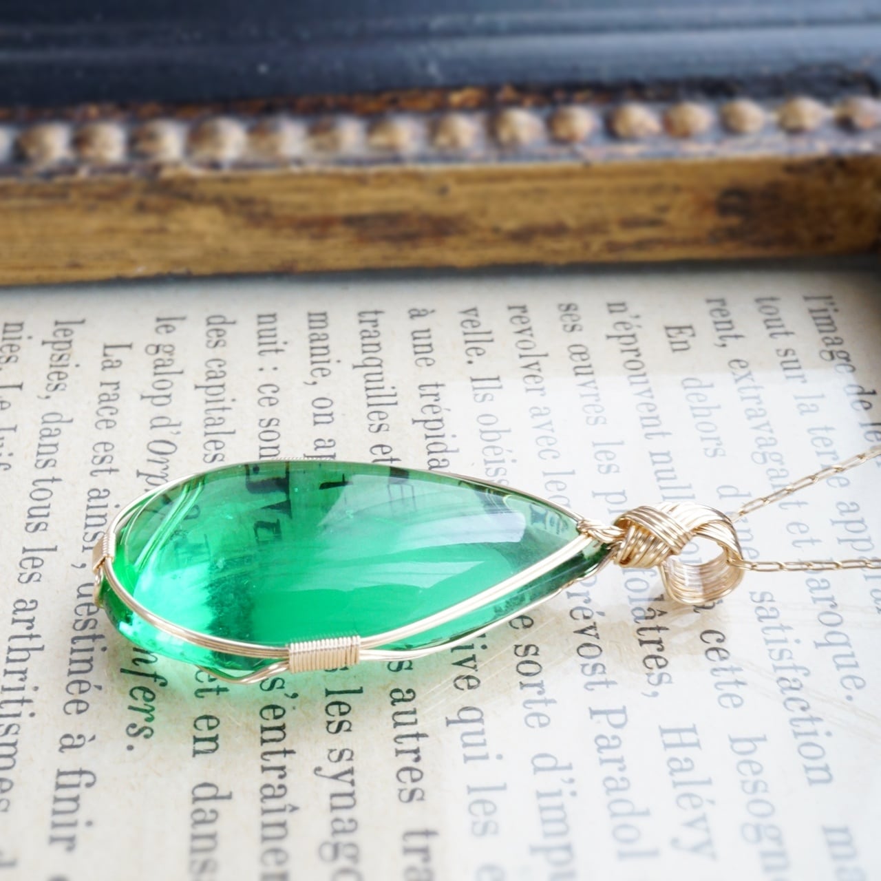 ブルーグリーンエメラルドシフト原石をしずく型カボションに研磨し、女神巻き®ペンダントに仕立てました。裏面はそのまま波紋模様を残しています。
