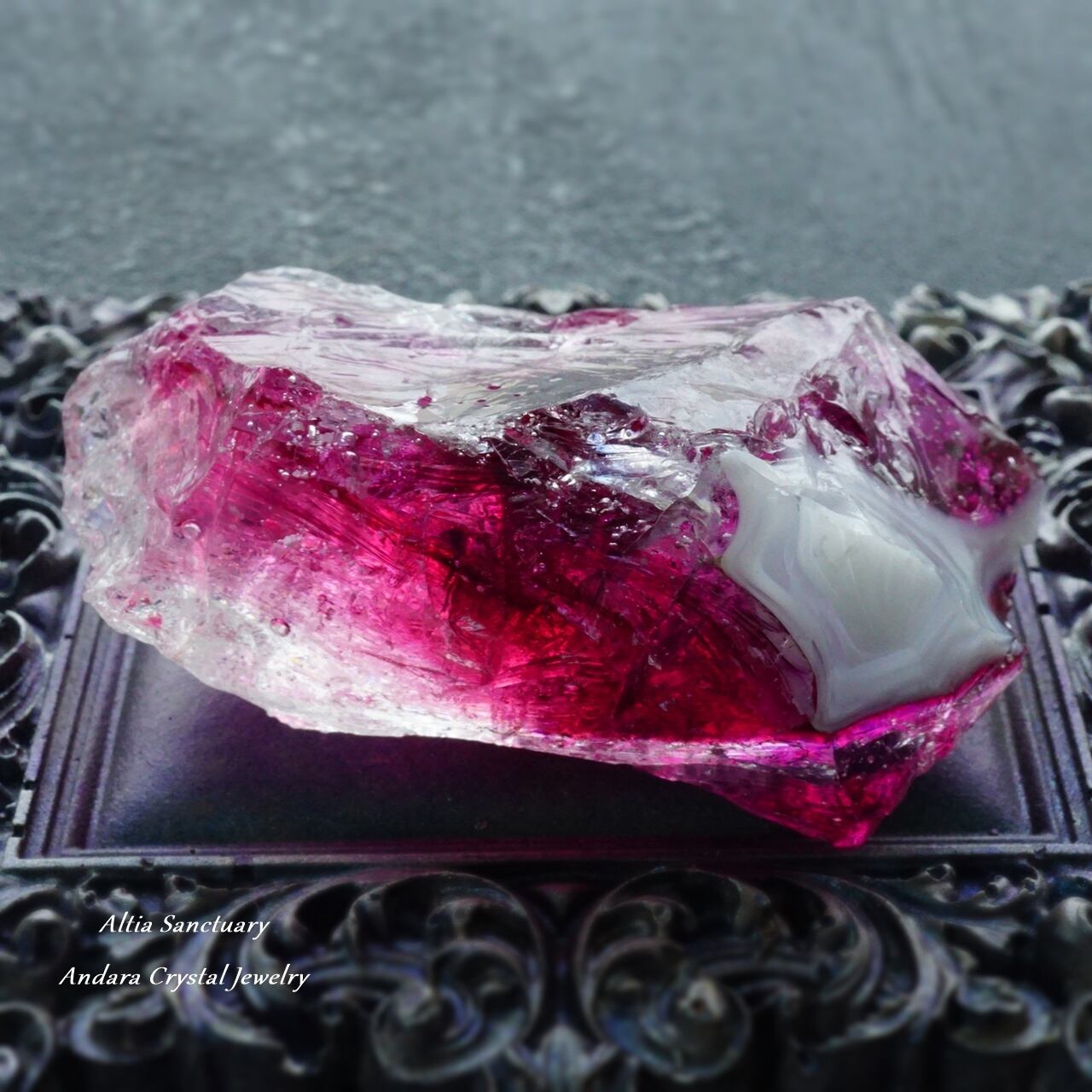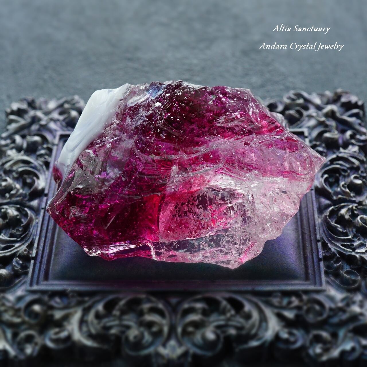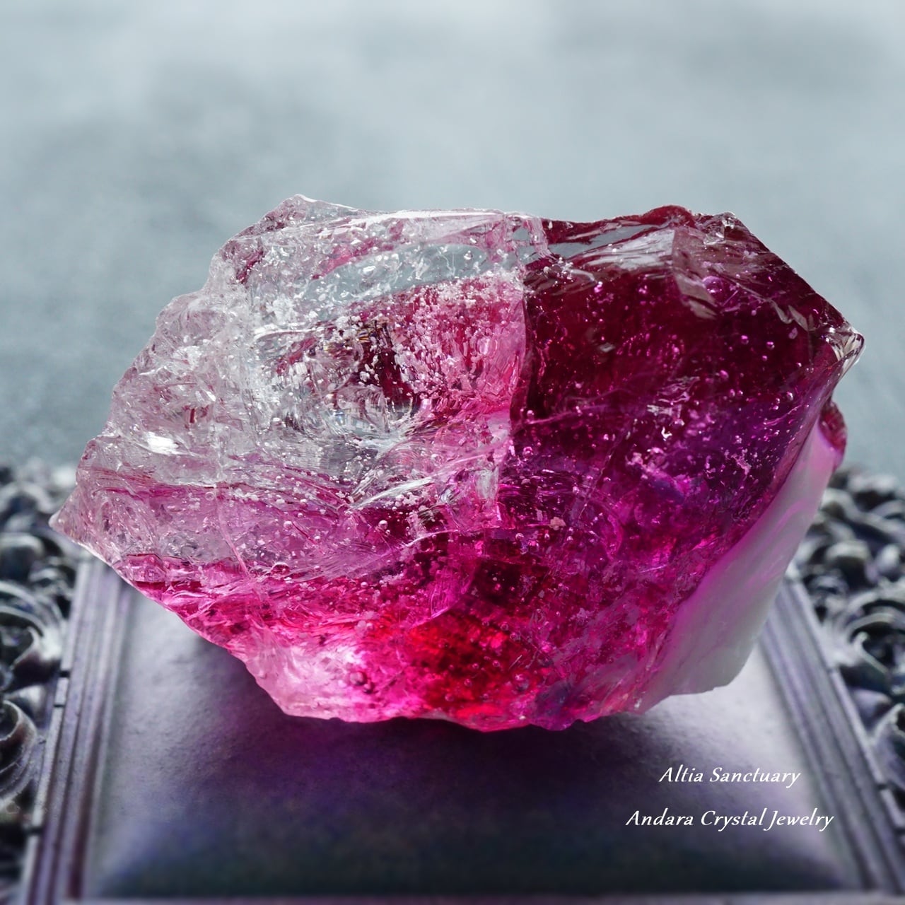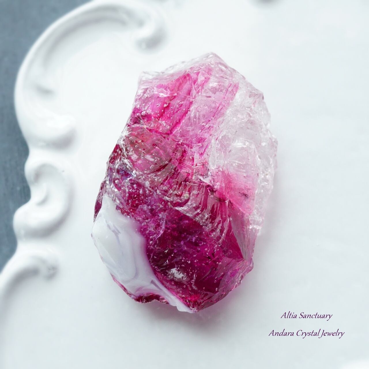 シーフォーム(海の気泡)入りの美しいアンダラクリスタルは、ピンクの色調「ソフィア」「ラズベリー」、パープルの色調「ヴァイオレットアメジスト」、クリアな「コスミックアイス」が1つの宝石になったマルチレインボーカラーのアンダラクリスタルになります。