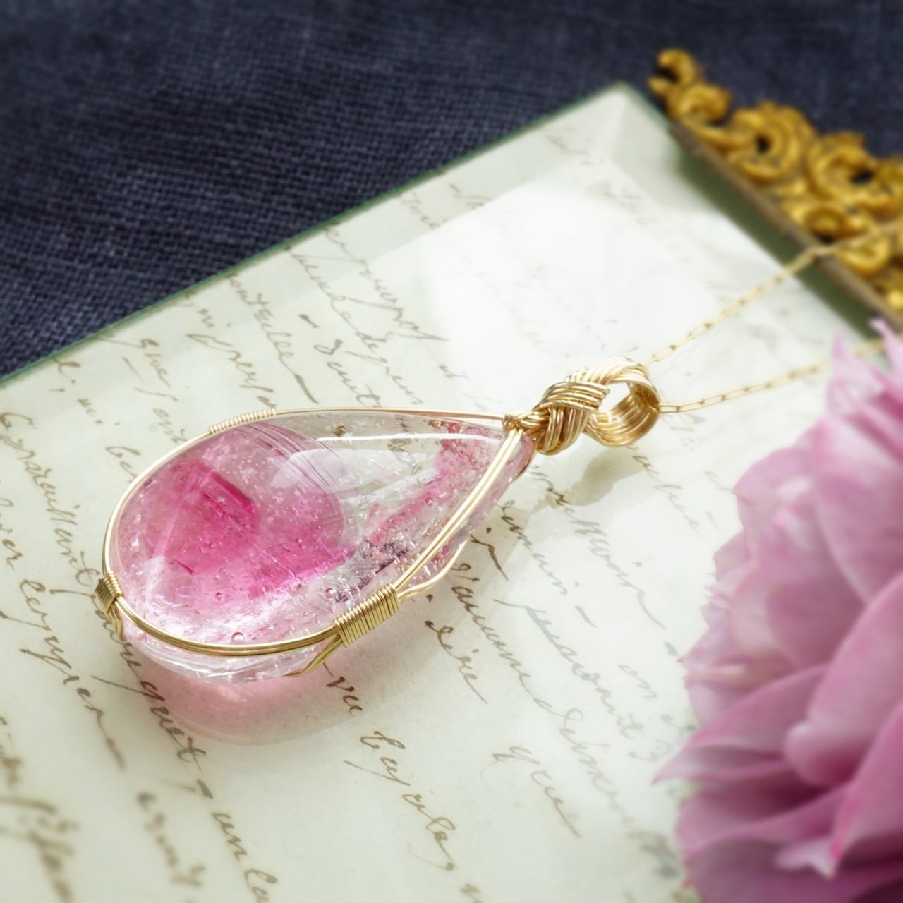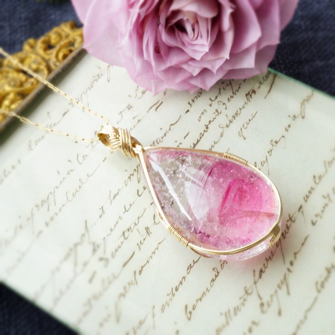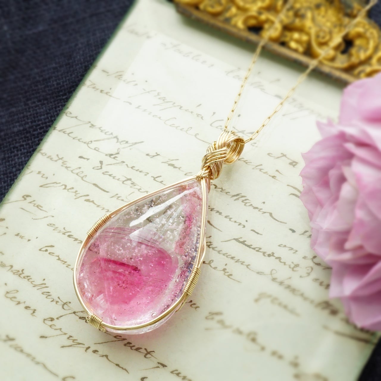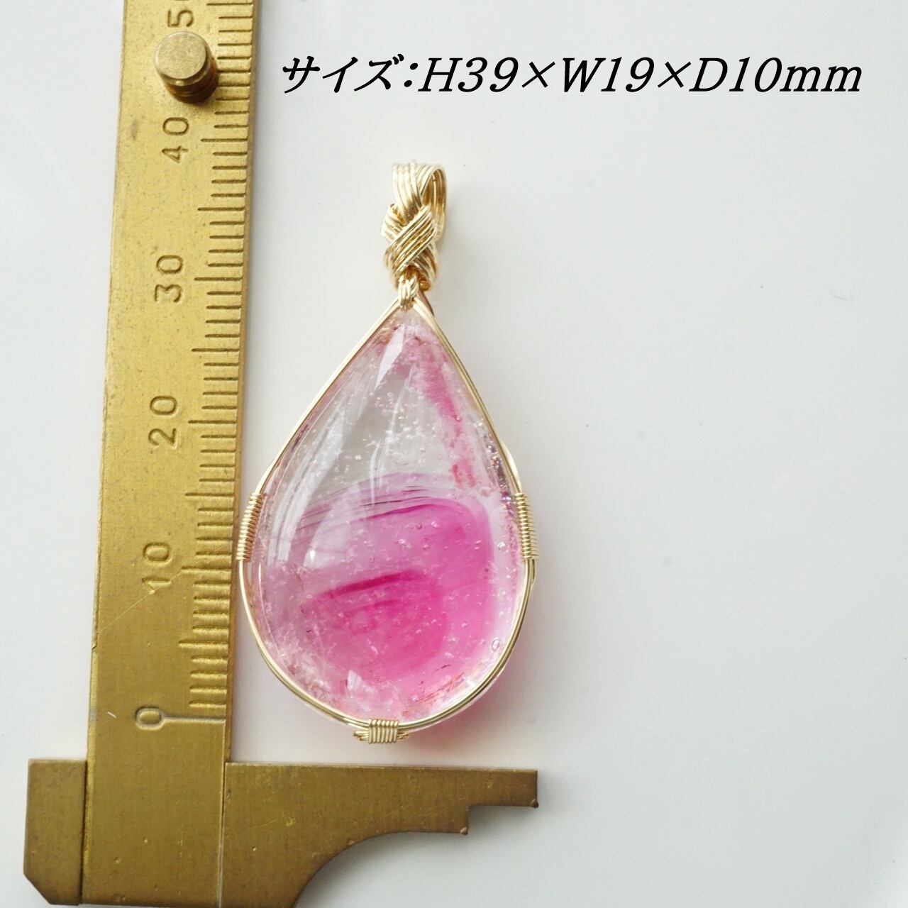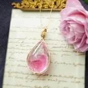 大きな原石を2つのしずく型に研磨加工しました。こちらは、コスミックアイスが多めで透明感があり、丸みのある雫型の女神巻き®ペンダントになります。