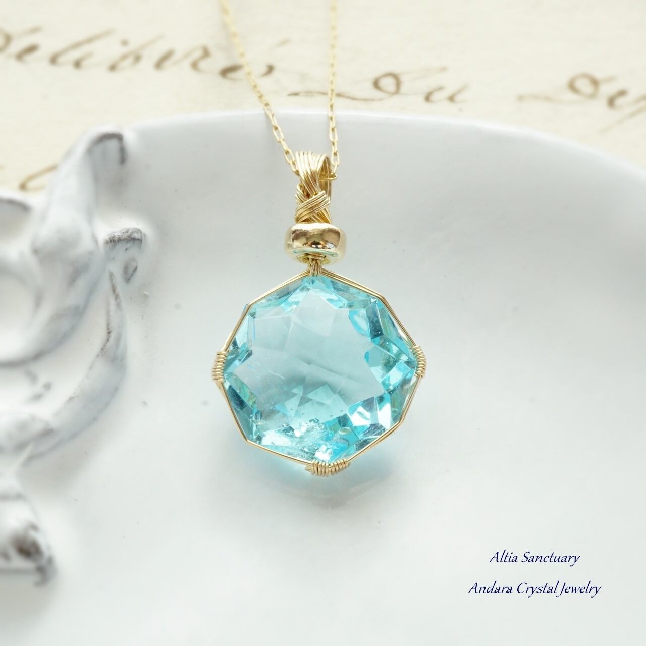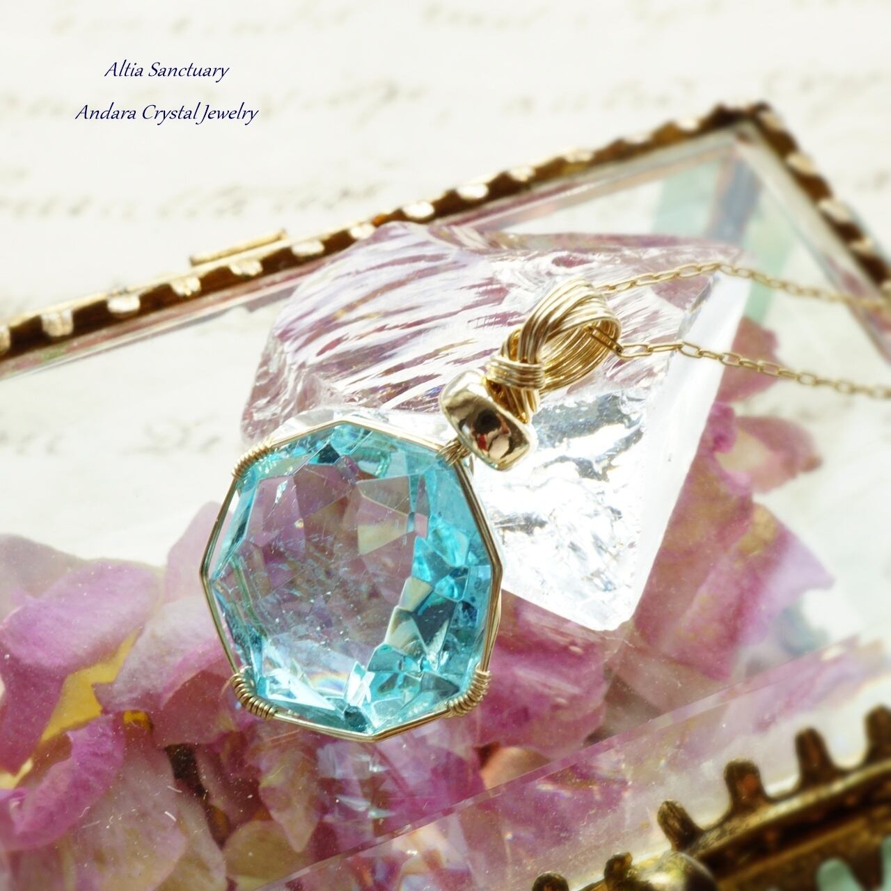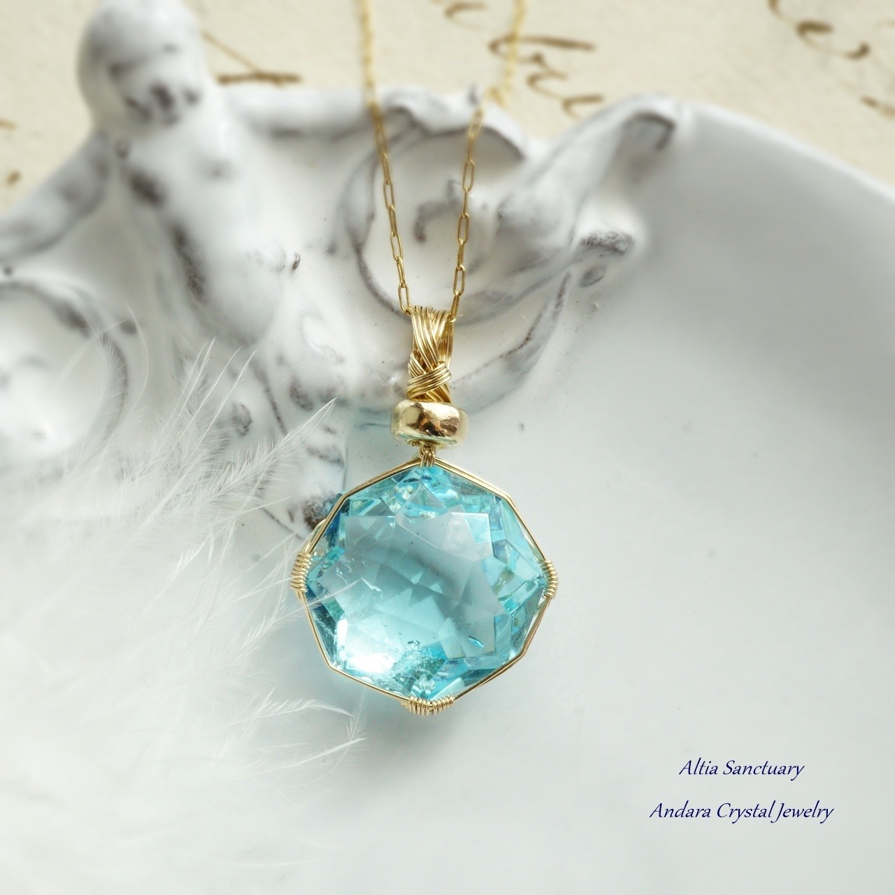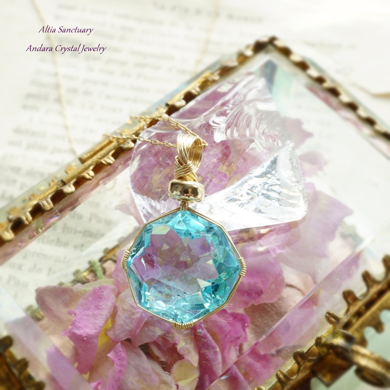 【Ⅰ様オーダー】レア!アンダラクリスタル(ブルートパーズ)八角形~サンフラワーカット~ロンデル付き女神巻き®ペンダント