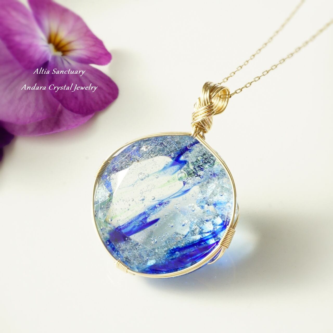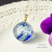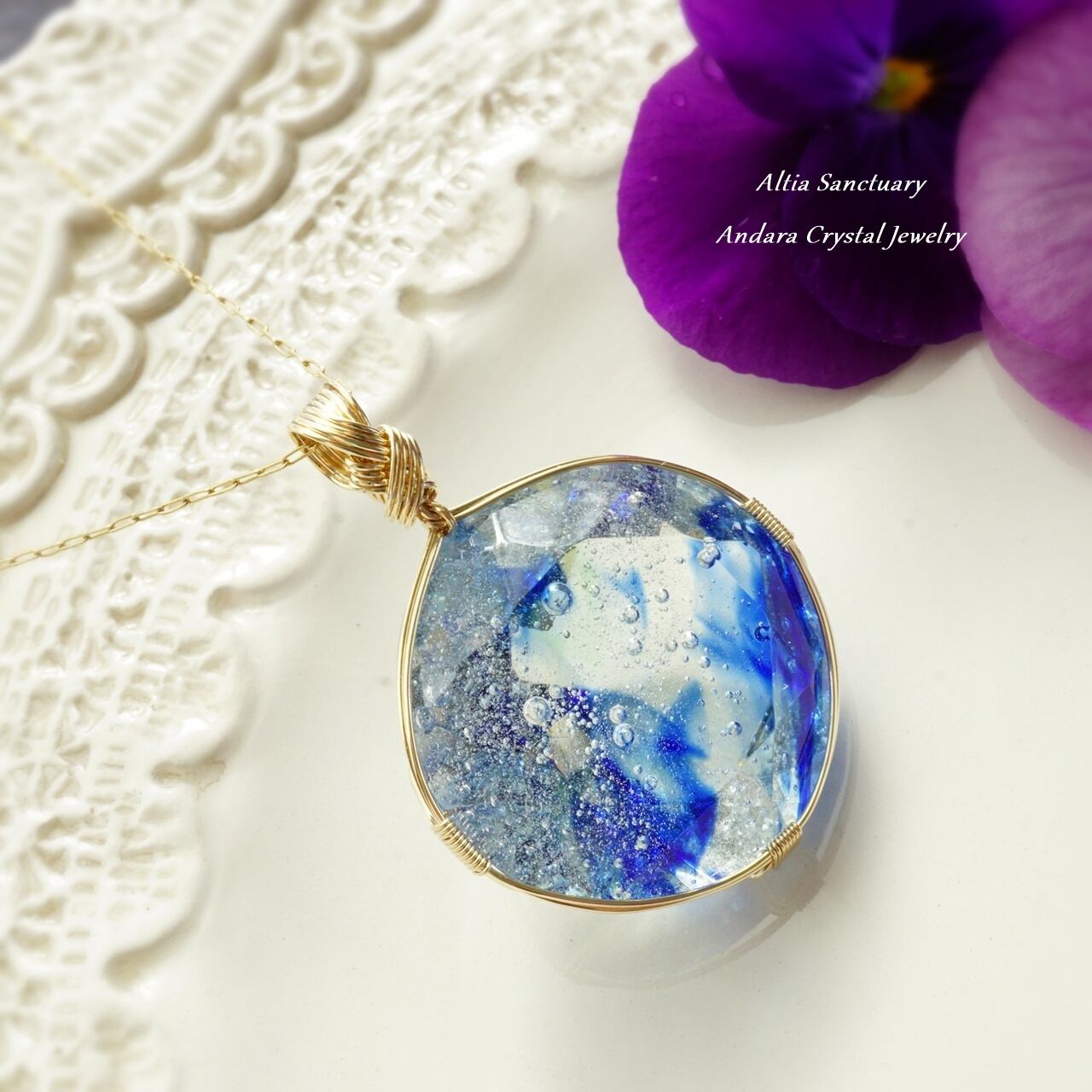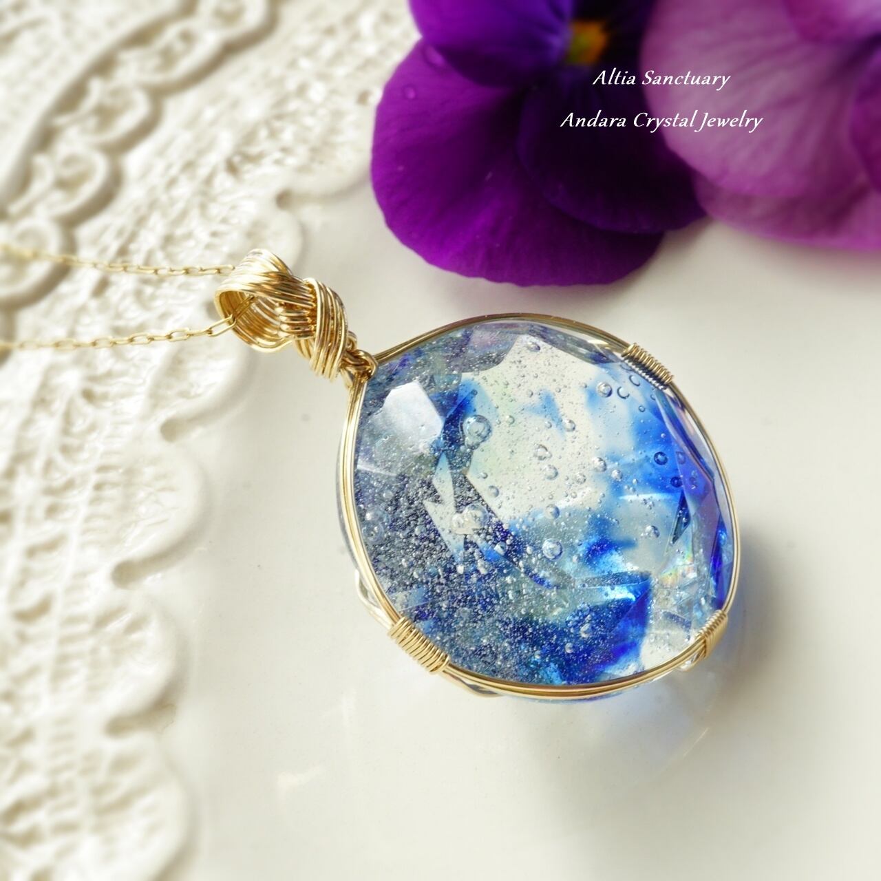 微細な気泡のヴェールが宇宙に浮かぶ光の粒たちのようにきらめく神秘的なブルー系アンダラクリスタルのダイヤモンドカット女神巻き®ペンダントです。