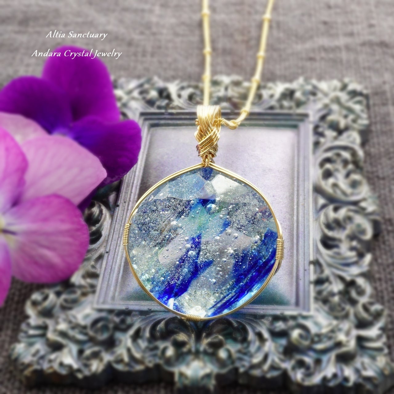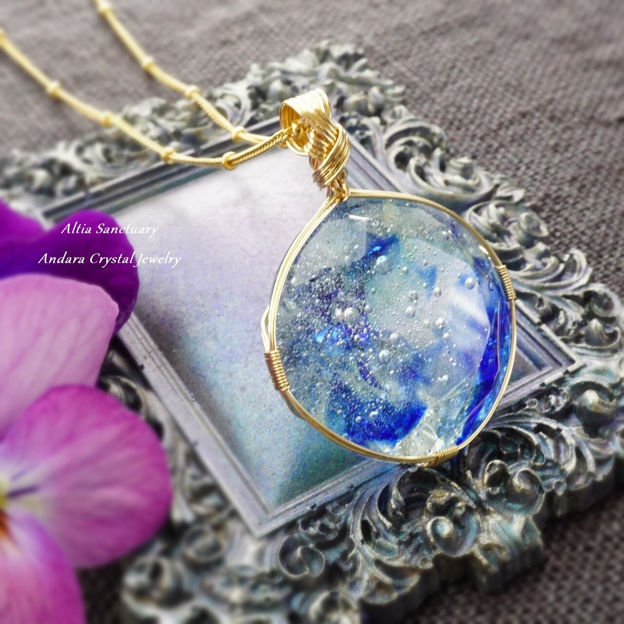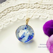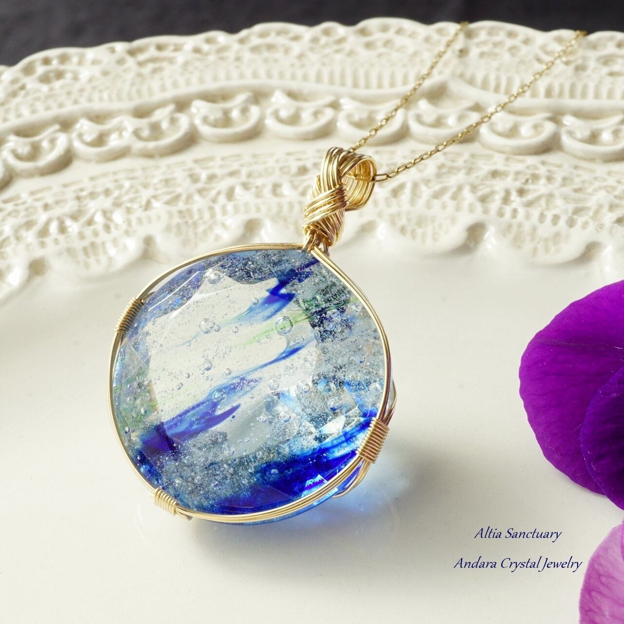微細な気泡のヴェールが宇宙に浮かぶ光の粒たちのようにきらめく神秘的なブルー系アンダラクリスタルのダイヤモンドカット女神巻き®ペンダントです。
