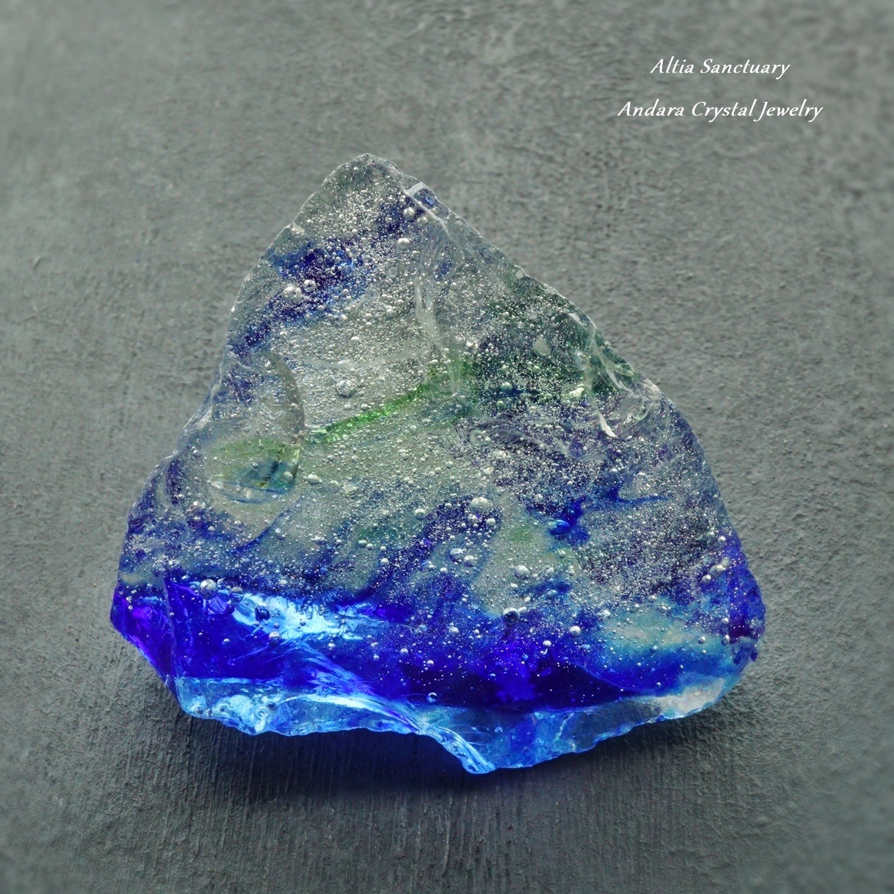 アンダラクリスタルは、黒曜石(オブシディアン)に似たガラス質で、ゴールド・シルバー・イリジウム・ロジウム・クロミニウム・プラチナなどの単原子成分が含まれており、レインボーの7色以上の美しいカラーを放つ魅力を持っています。