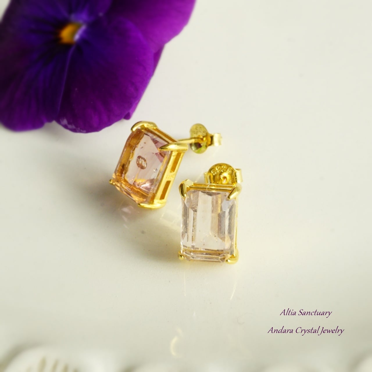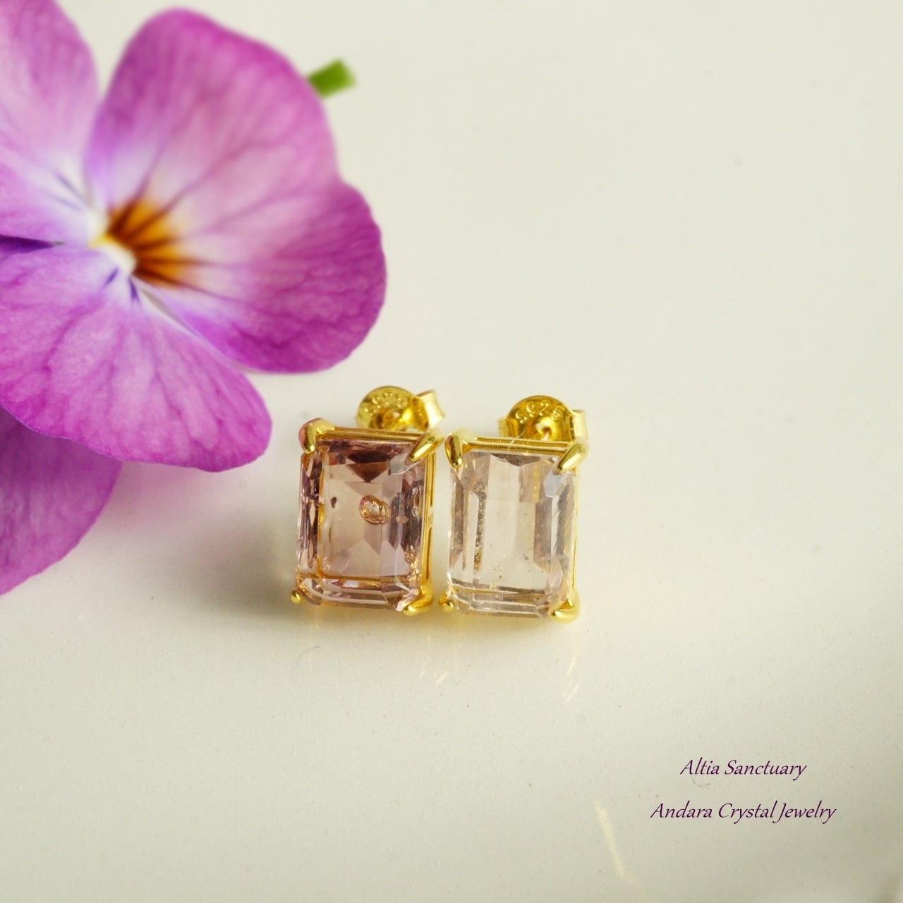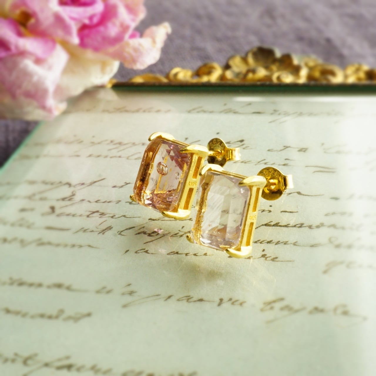 ピンク紫色の「ソブリンアメジスト」を小さなエメラルドカットに仕立てた、シンプルな爪留めピアスポストです。