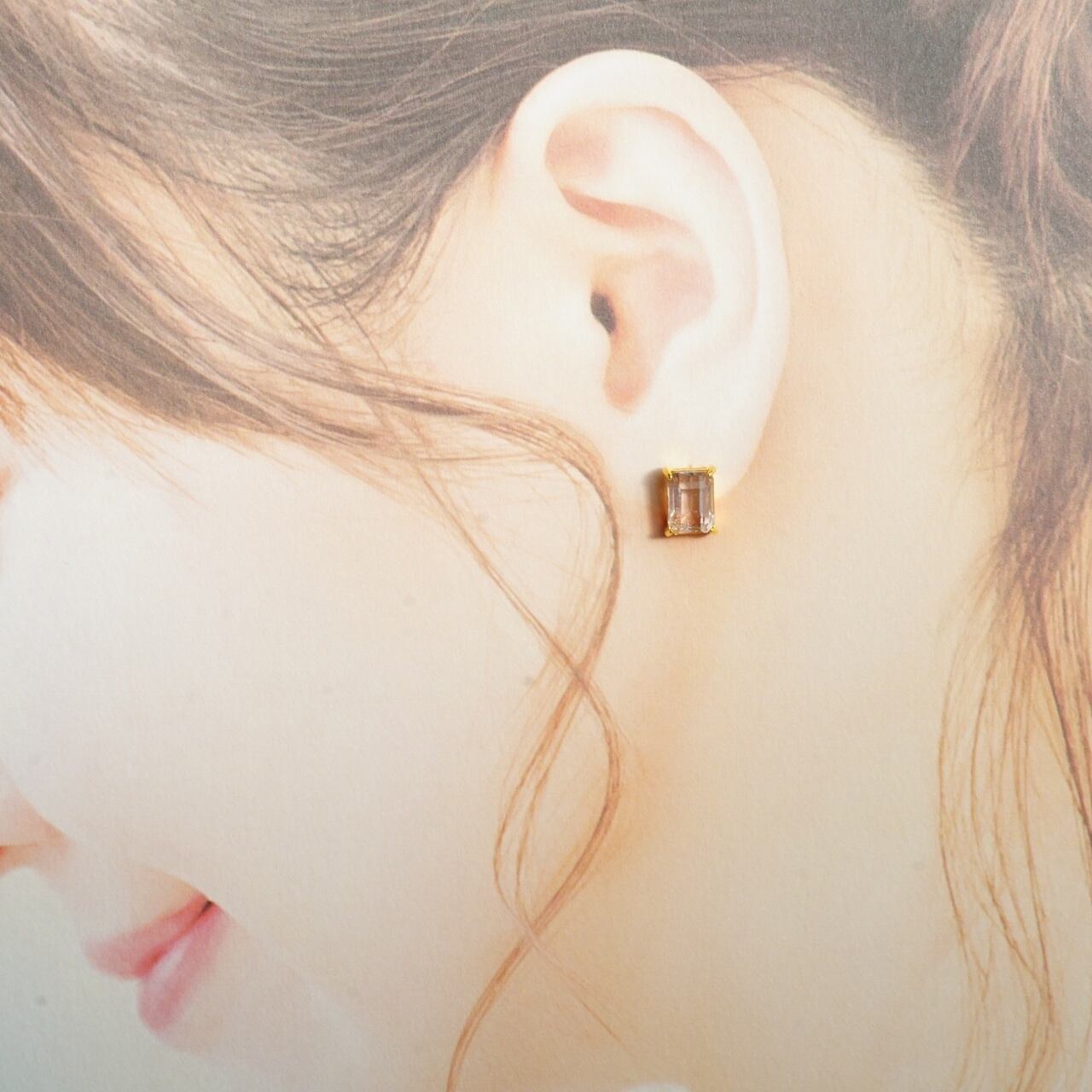 手擦りで研磨加工できる最小サイズ8×6ミリのエメラルドカットを小さなピアス枠にセットいたしました。さりげなく着けて頂けるピアスです。