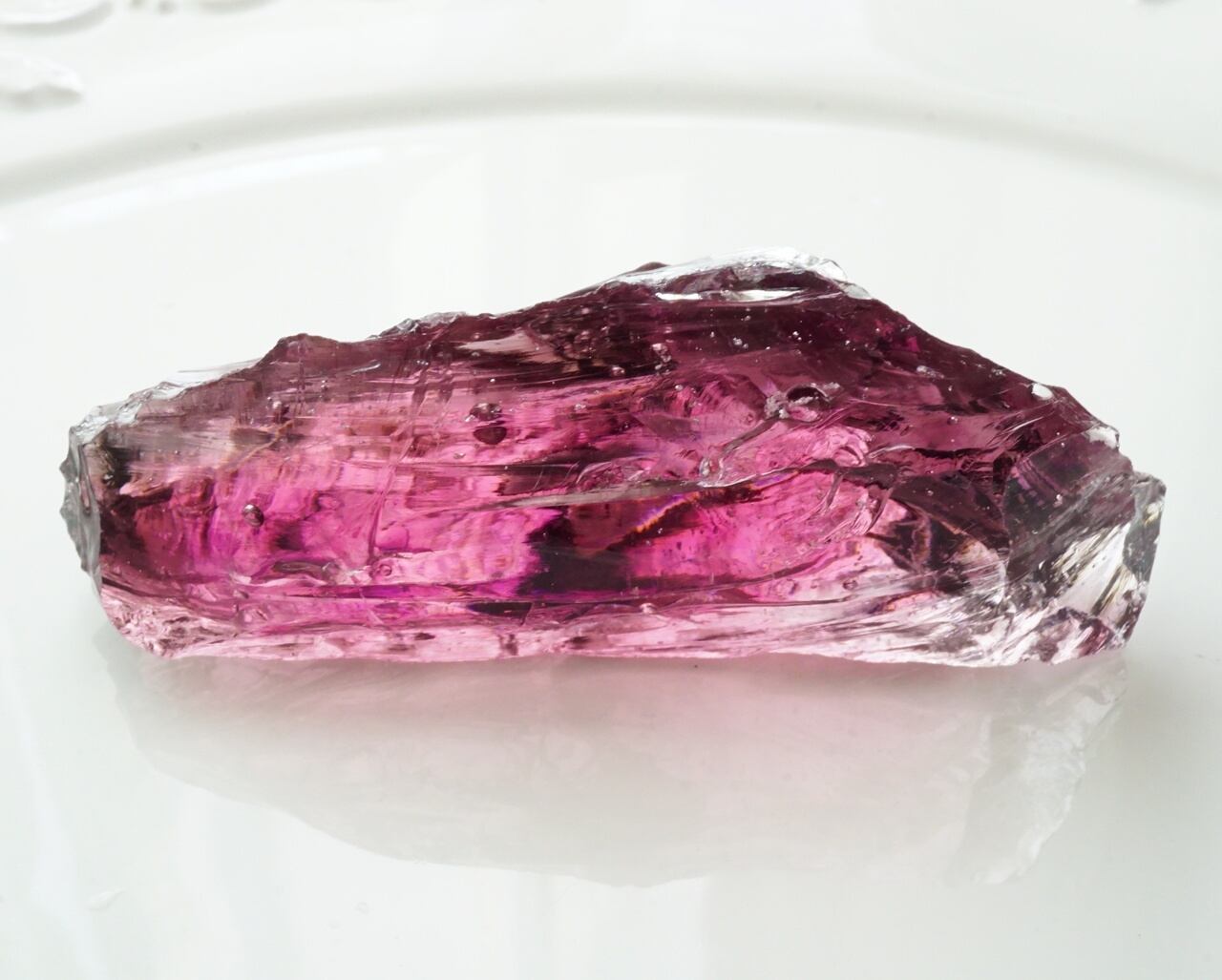 光を通して放射するピンク紫の光がとっても優美で魅力的です。気泡が内包されているのも愛らしいポイントです。