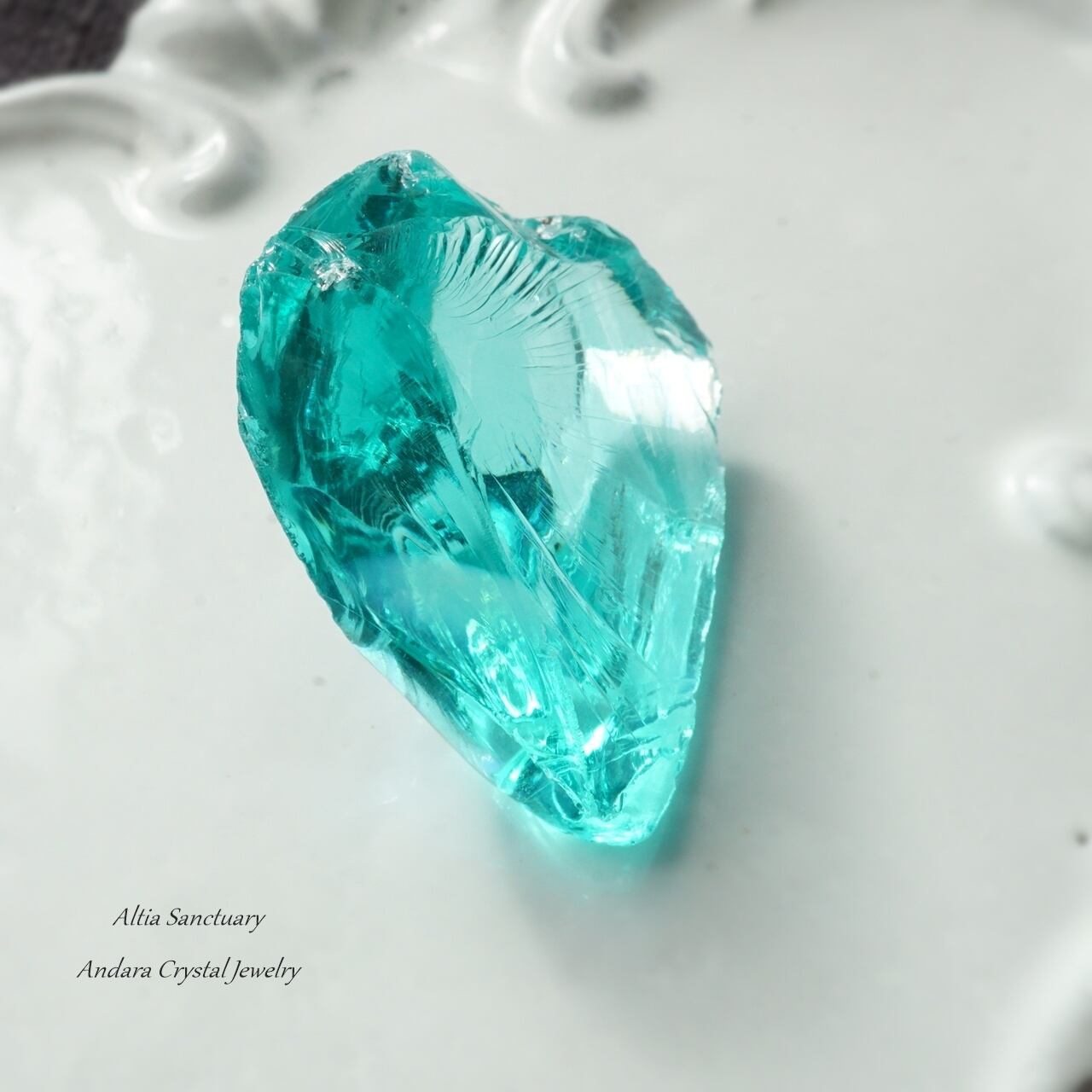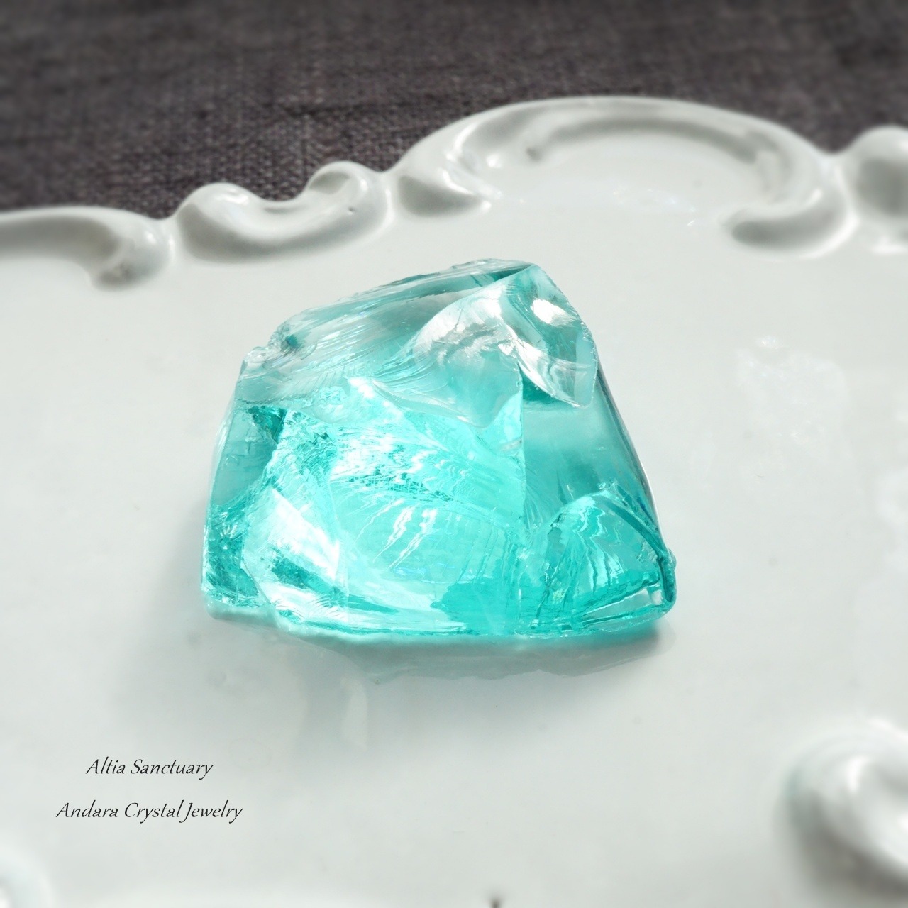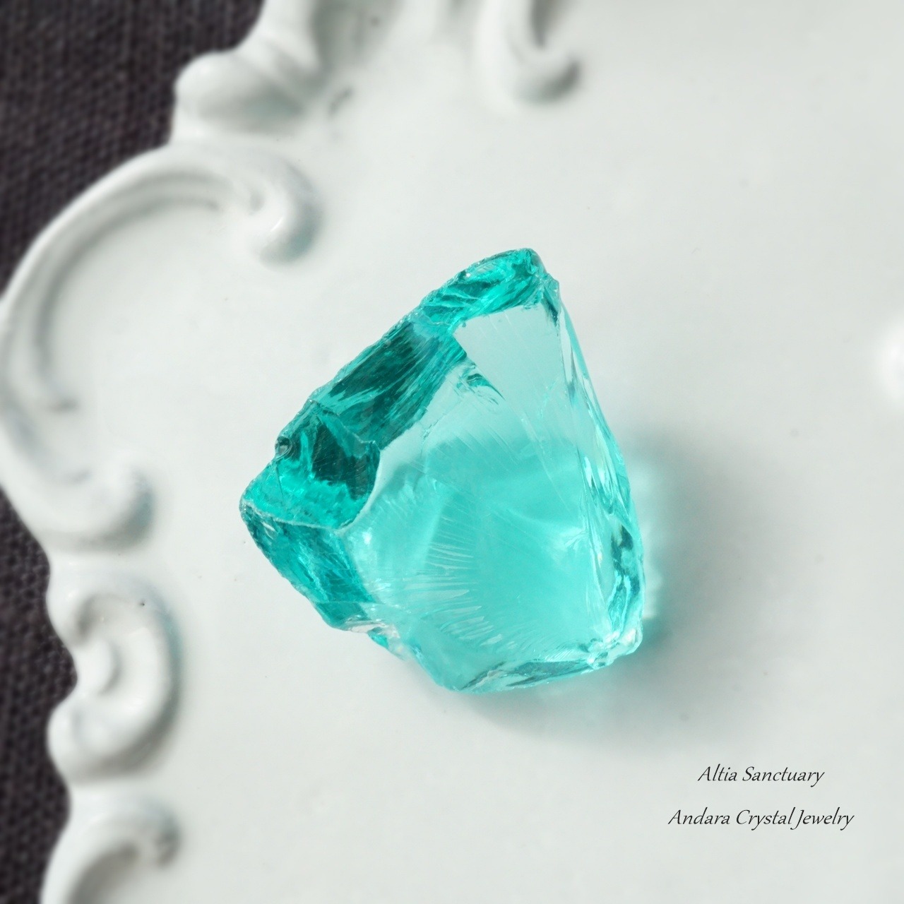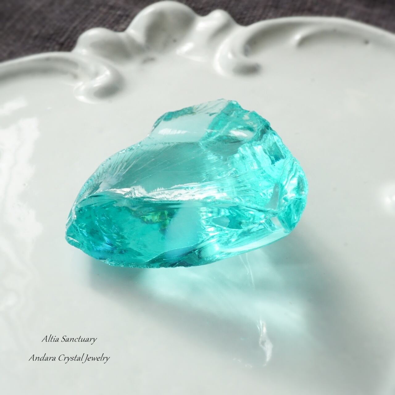 明るいブルーグリーン「シアンエンジェル」に僅かに「エンジェルオーラ」が舞い、艶、照りのある美しいアンラクリスタルになります。