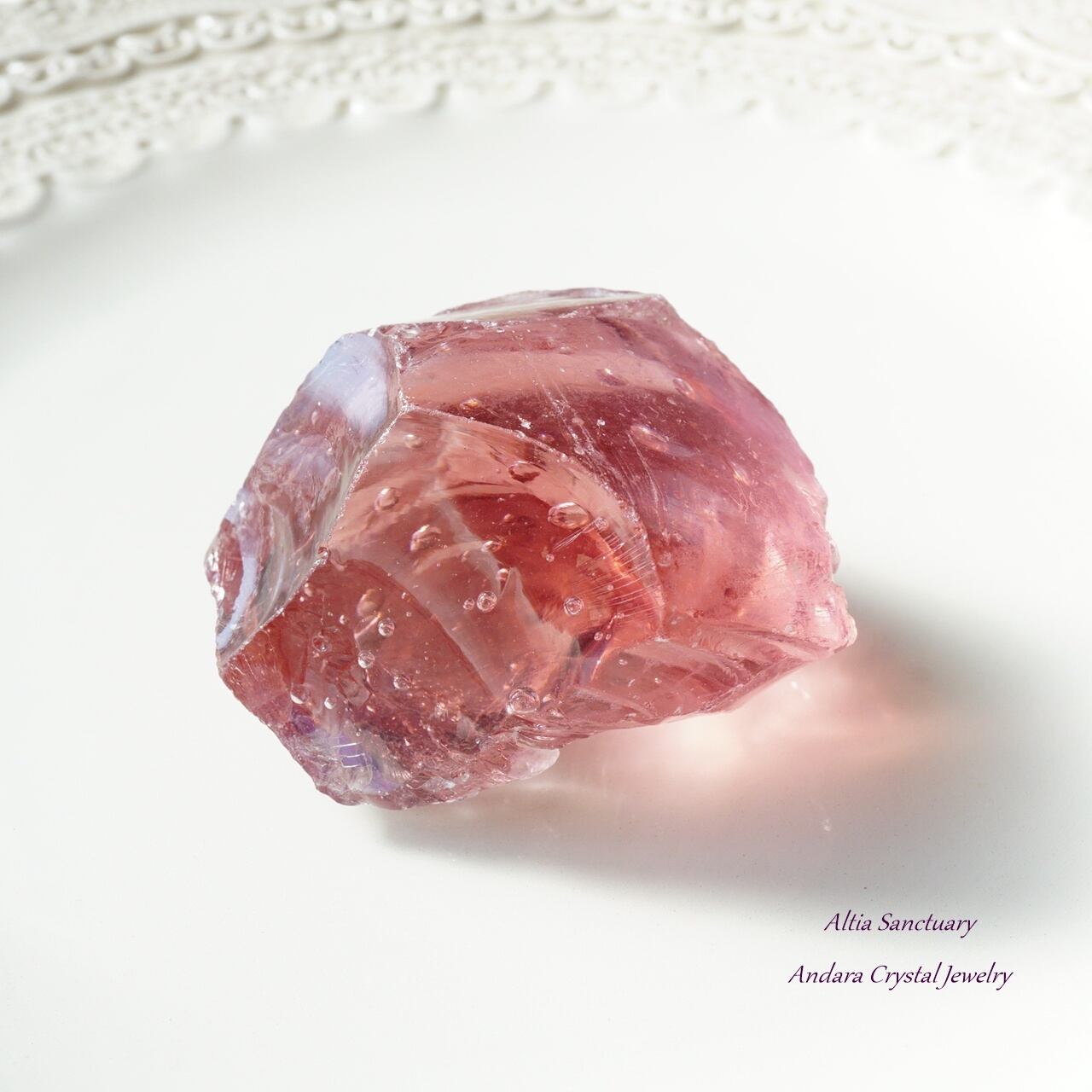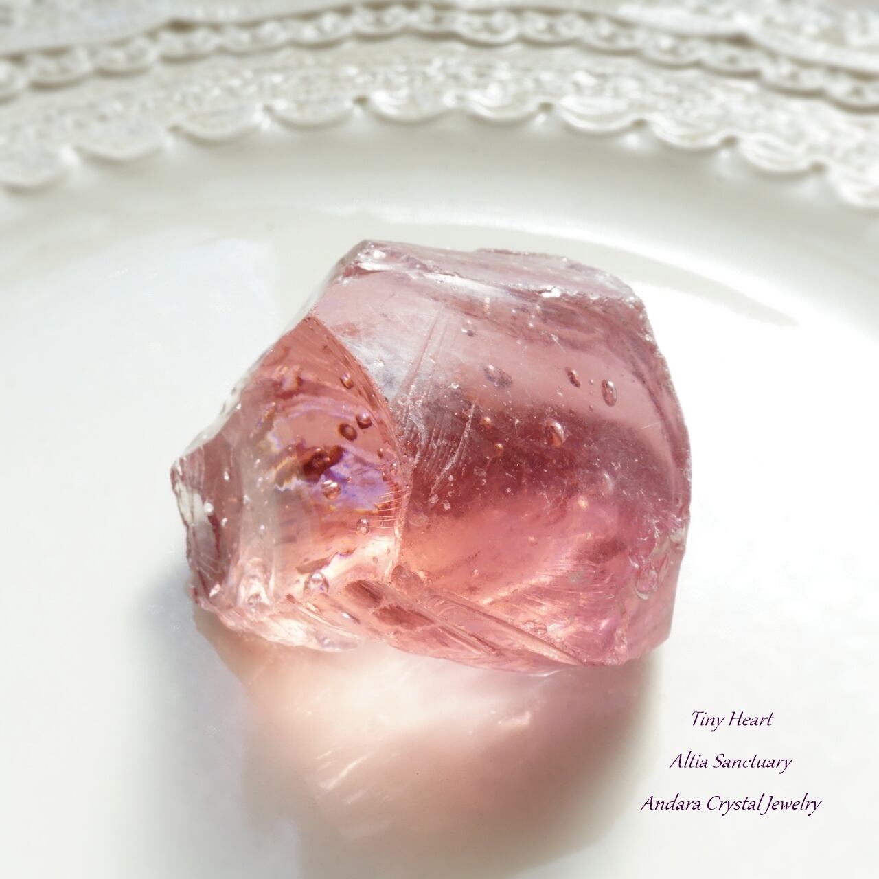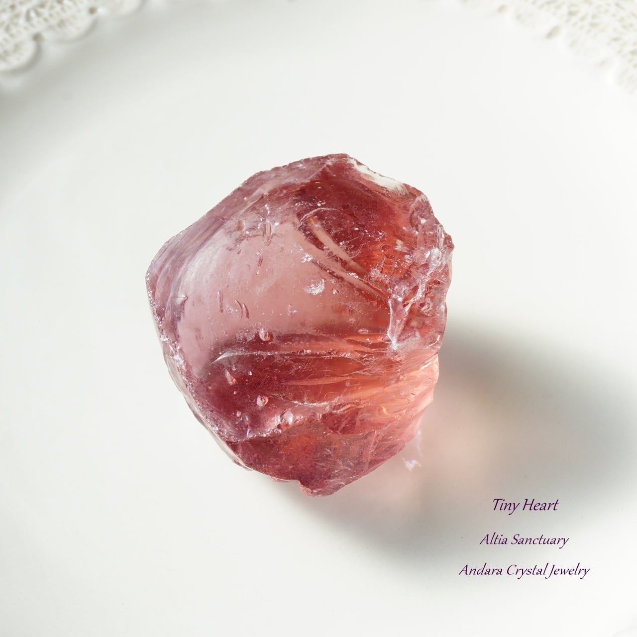 こちらの「ソフィア」は、より大きなアンダラの中心部(アンダラの芯となる心臓部)から採れています。ハート部分は密度や色が濃い印象です。こちらのソフィアウィズダムハートの特筆すべき点は、小さなハート(タイニーハート)になり、コロンとして可愛いらしいアンダラクリスタルになります。そして、バブル入りになります。桃のような丸みとピンクカラーの色調が愛らしいアンダラクリスタルです。約68gの大きめサイズになります。