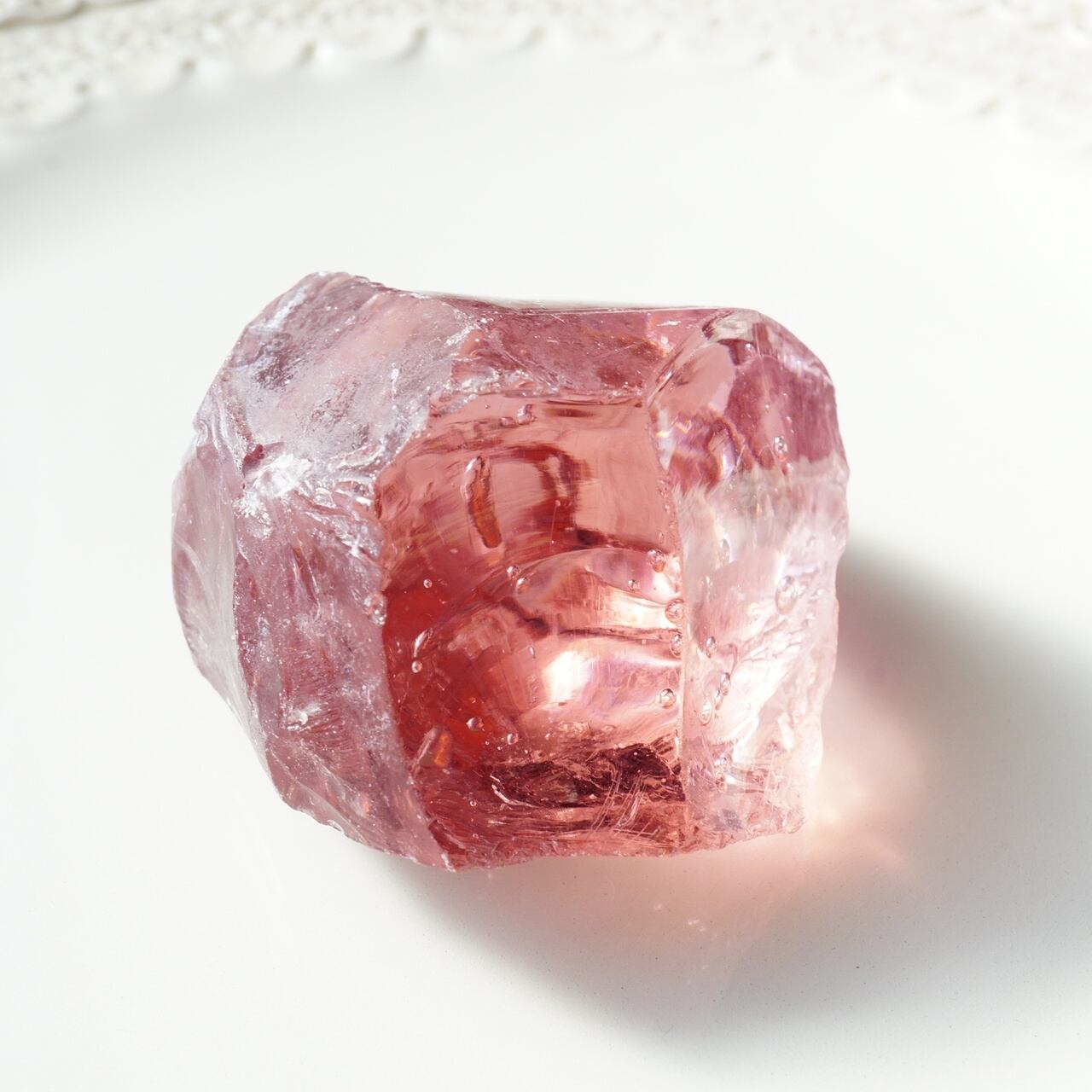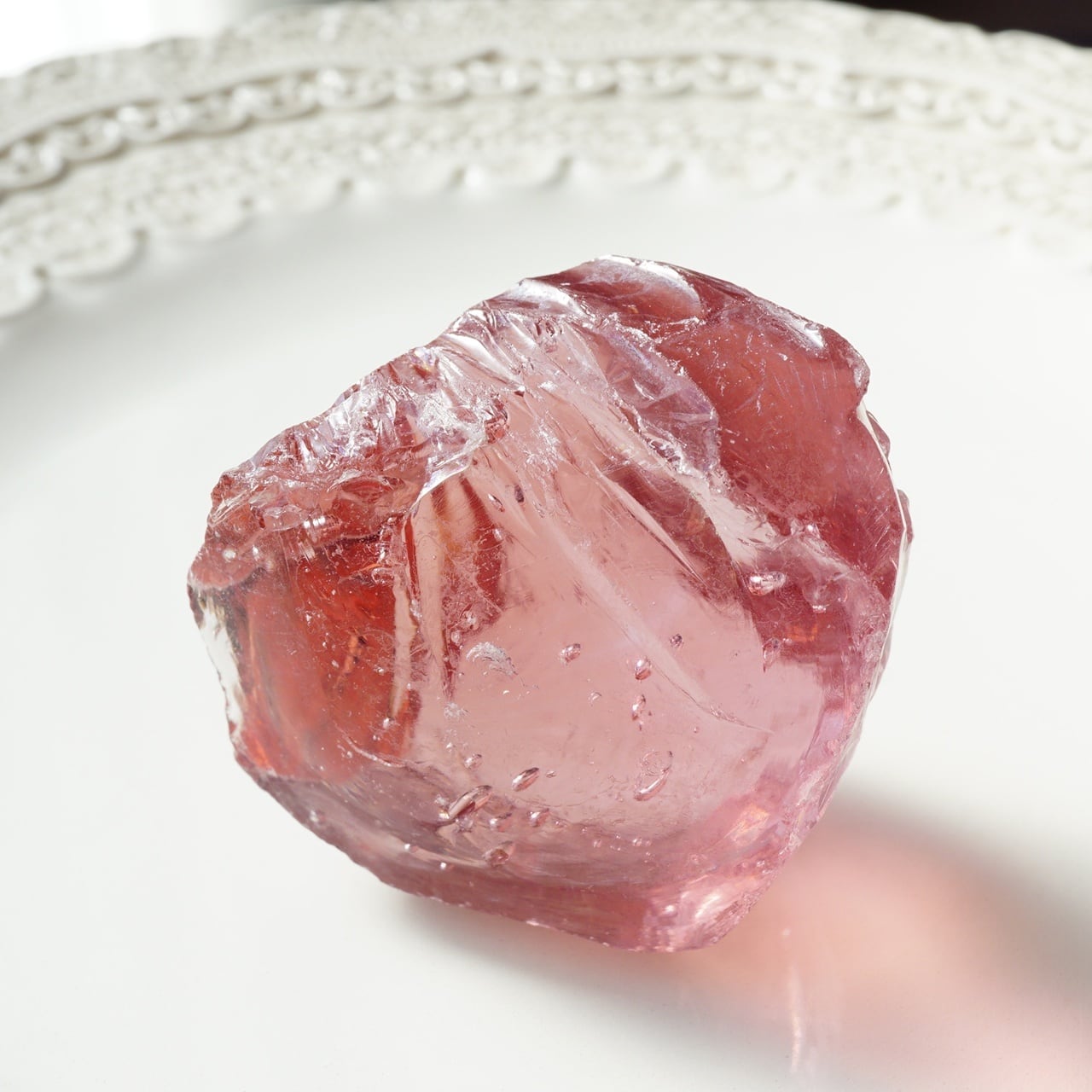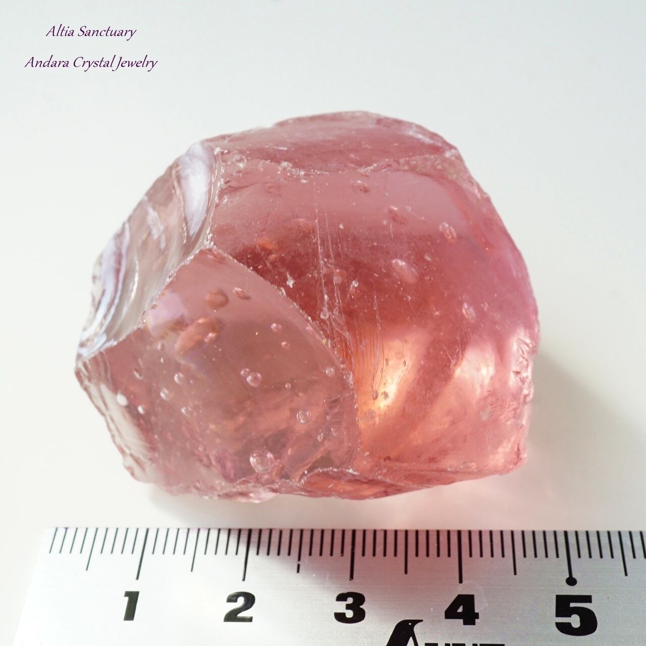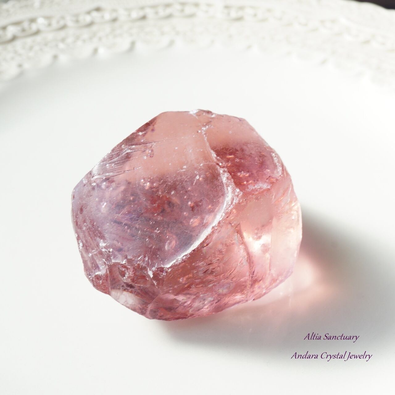 こちらの「ソフィア」は、より大きなアンダラの中心部(アンダラの芯となる心臓部)から採れています。ハート部分は密度や色が濃い印象です。こちらのソフィアウィズダムハートの特筆すべき点は、小さなハート(タイニーハート)になり、コロンとして可愛いらしいアンダラクリスタルになります。そして、バブル入りになります。桃のような丸みとピンクカラーの色調が愛らしいアンダラクリスタルです。約68gの大きめサイズになります。