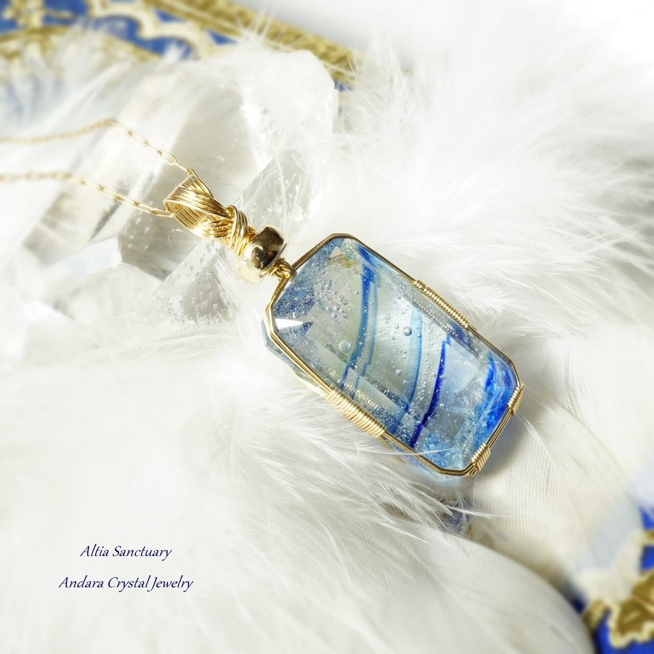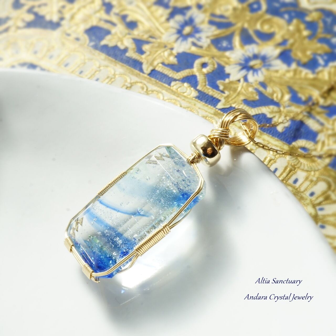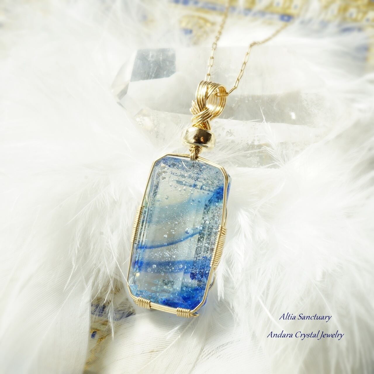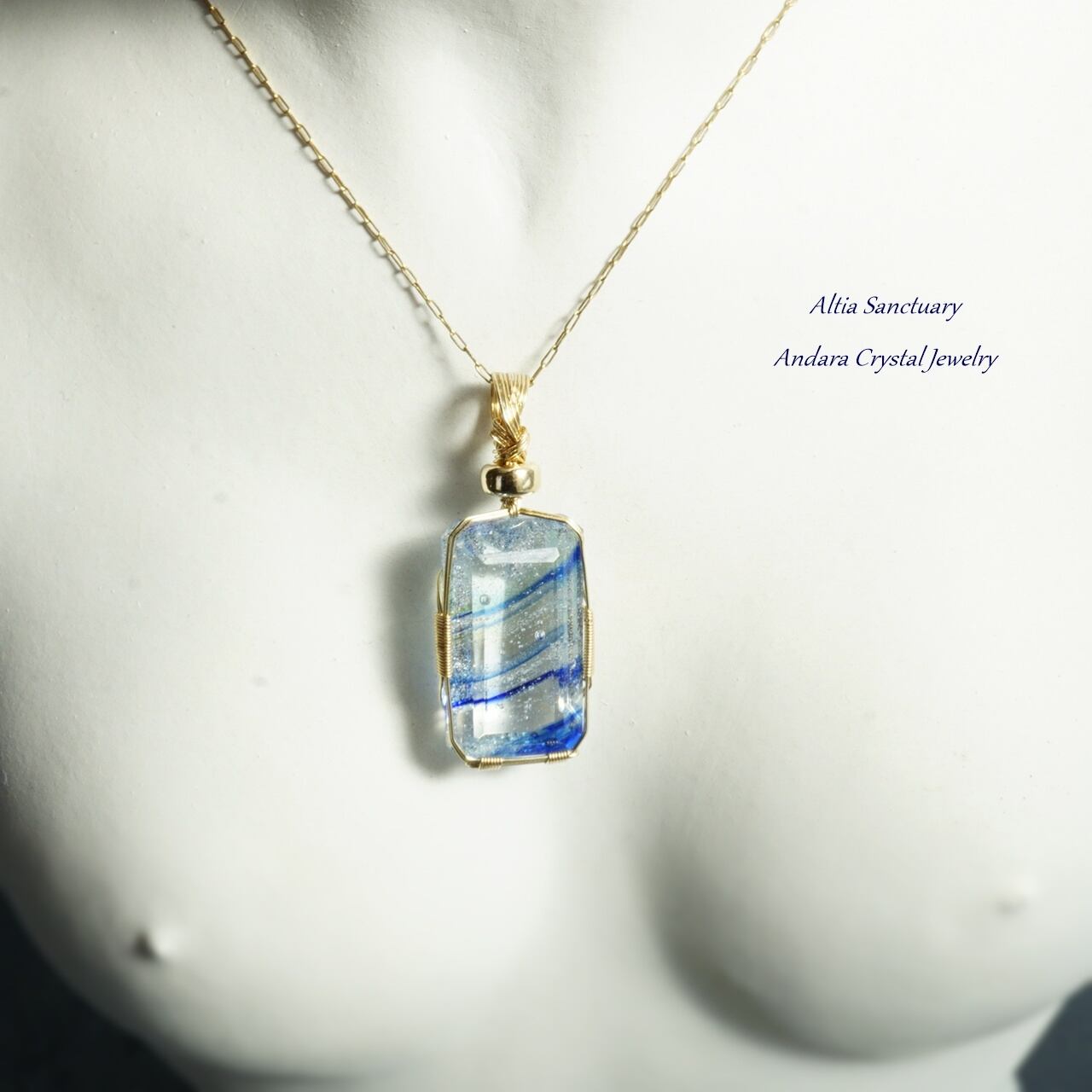 きらめく神秘的なマルチブルーアンダラクリスタルのエメラルドカット女神巻き®ペンダントです。