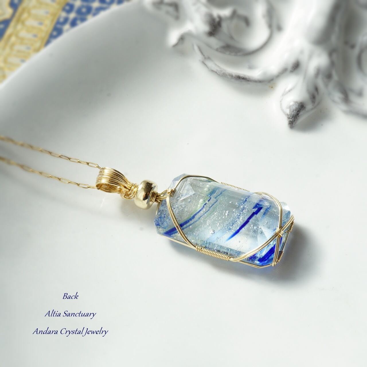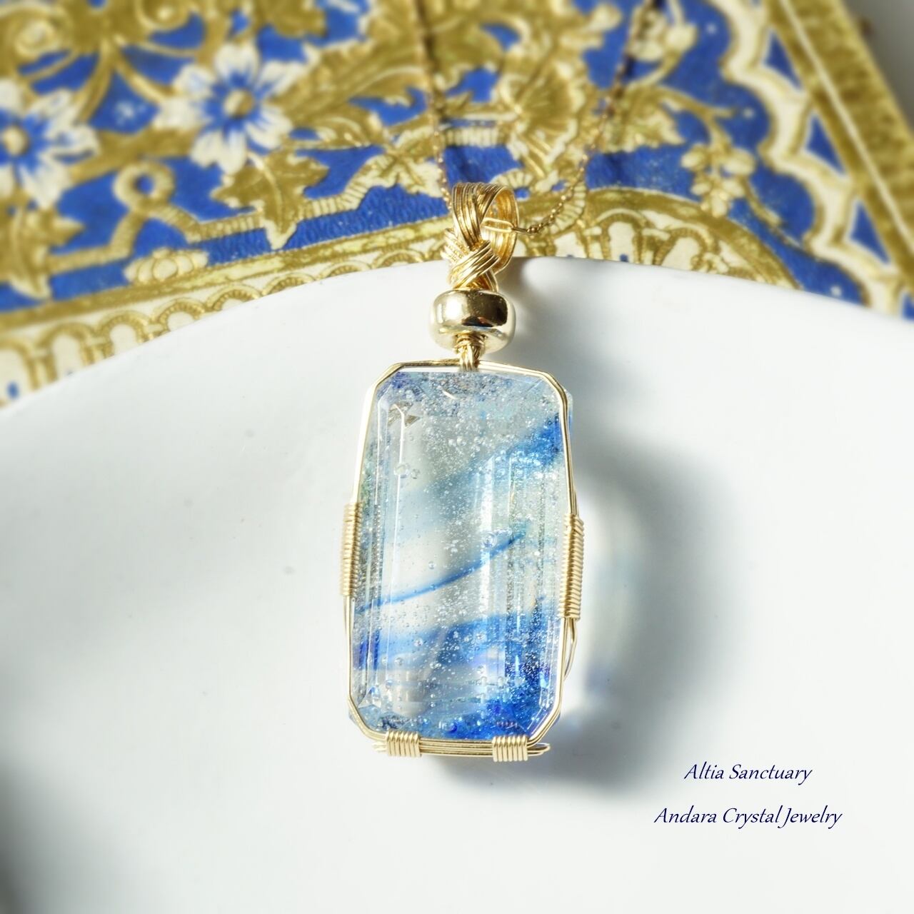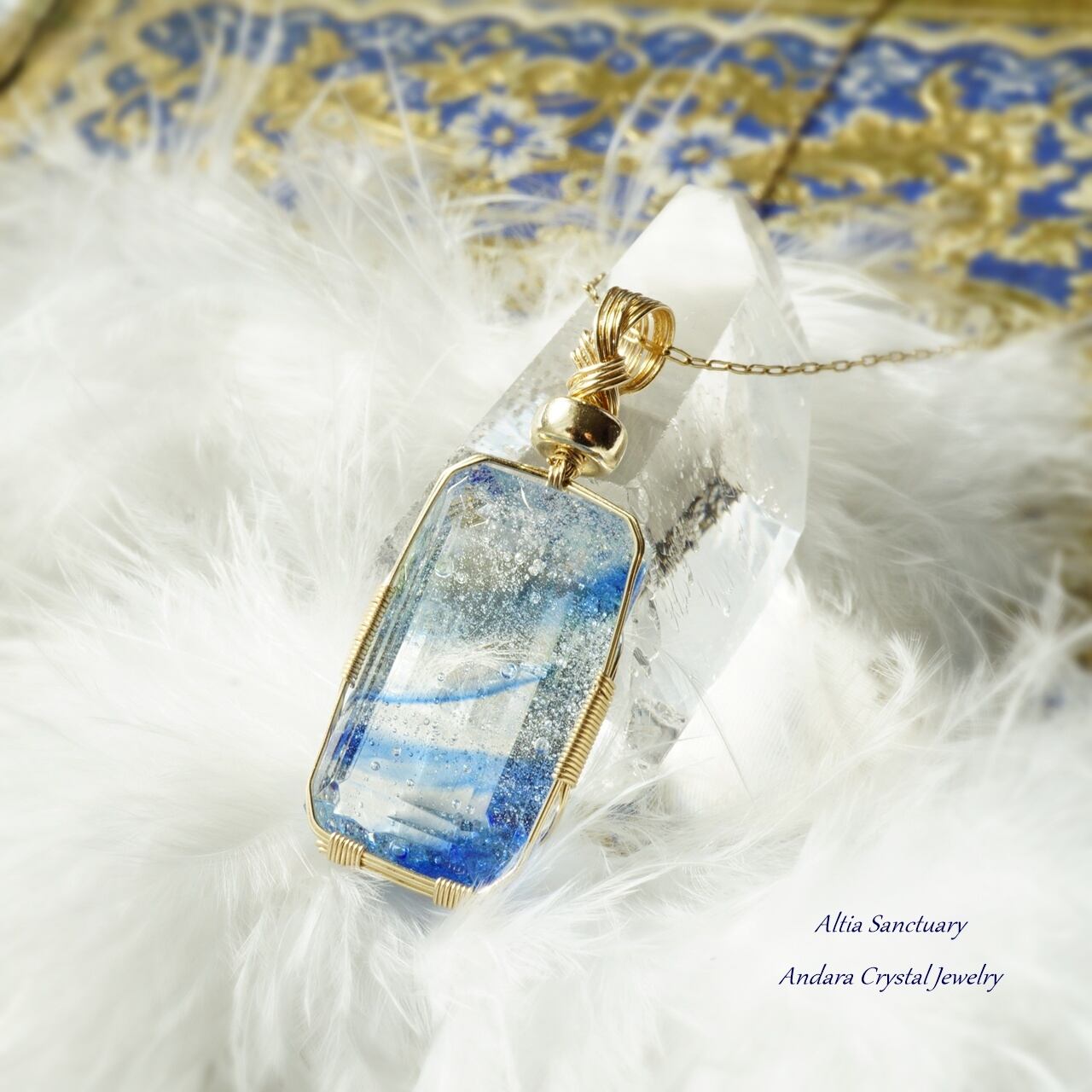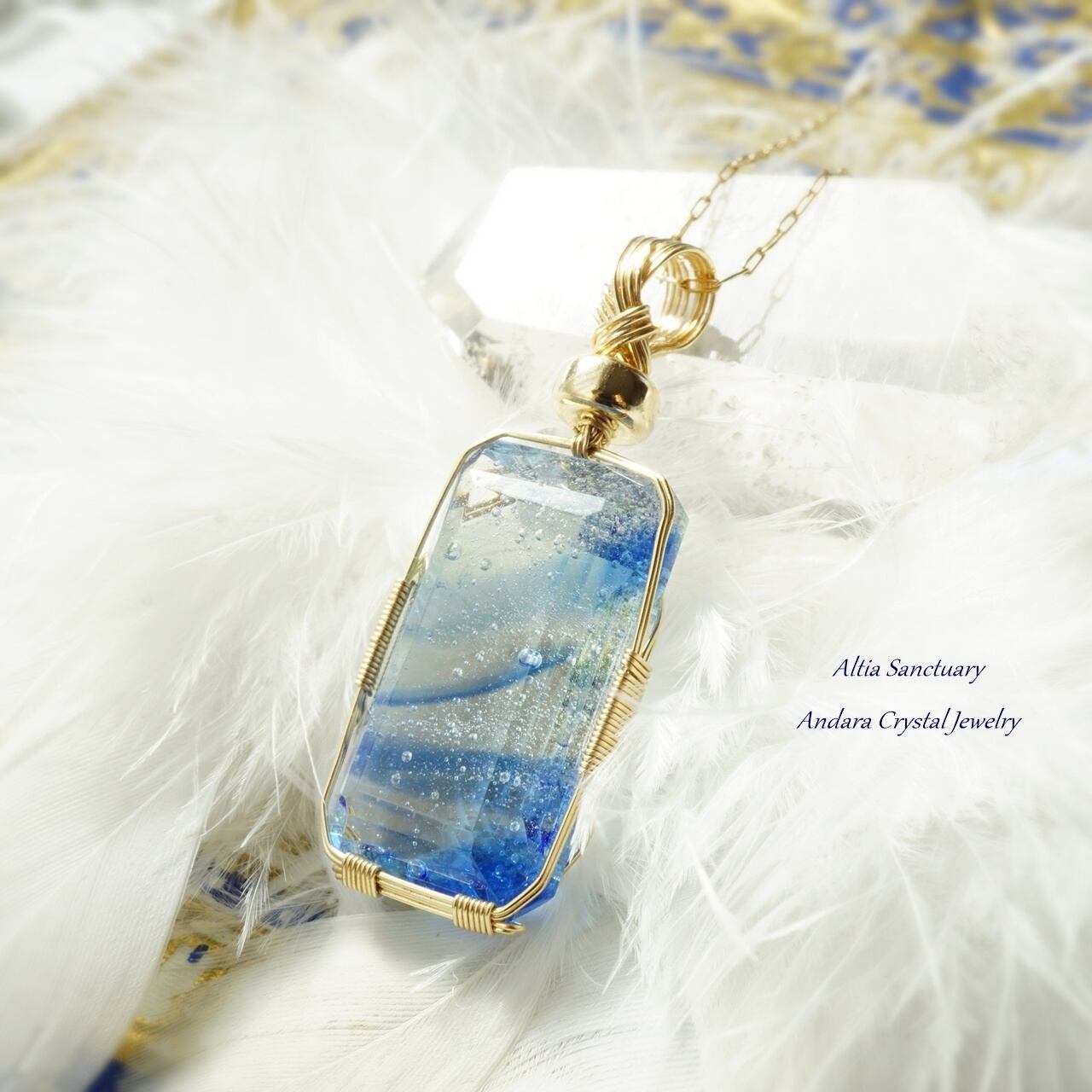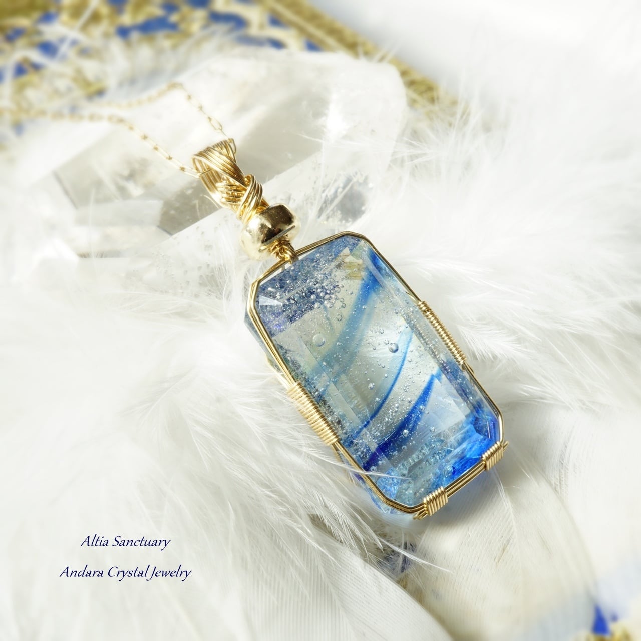 きらめく神秘的なマルチブルーアンダラクリスタルのエメラルドカット女神巻き®ペンダントです。