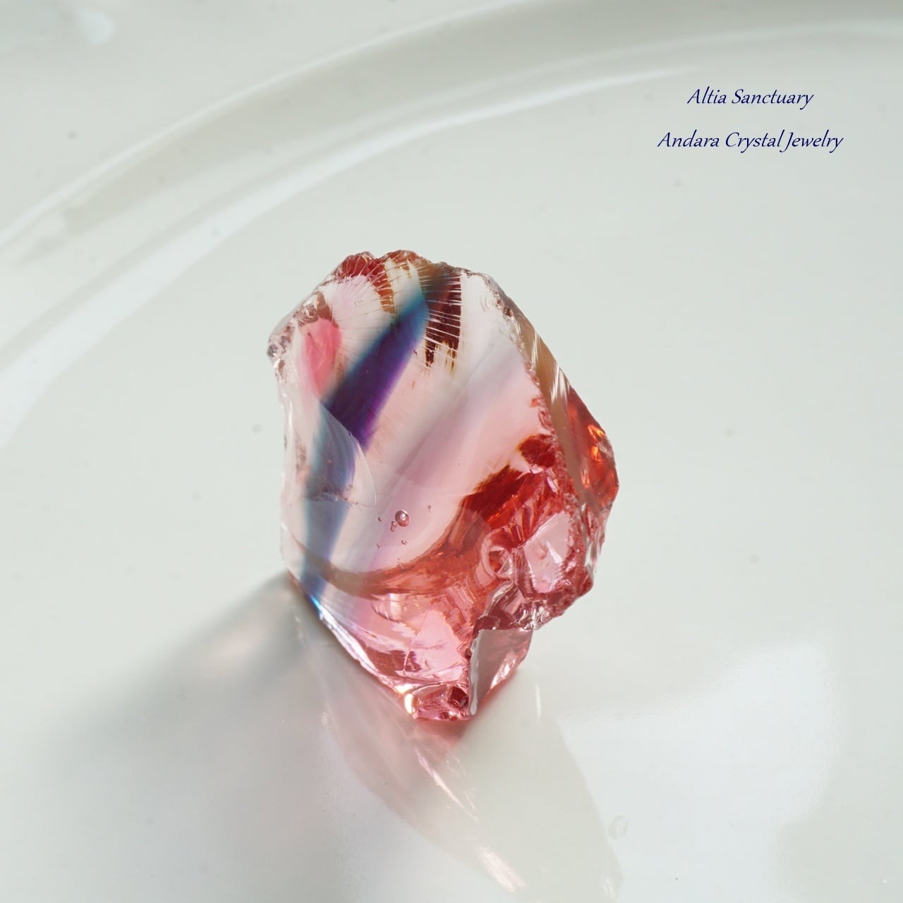 アンダラクリスタルは、黒曜石(オブシディアン)に似たガラス質で、ゴールド・シルバー・イリジウム・ロジウム・クロミニウム・プラチナなどの単原子成分が含まれており、レインボーの7色以上の美しいカラーを放つ魅力を持っています。
