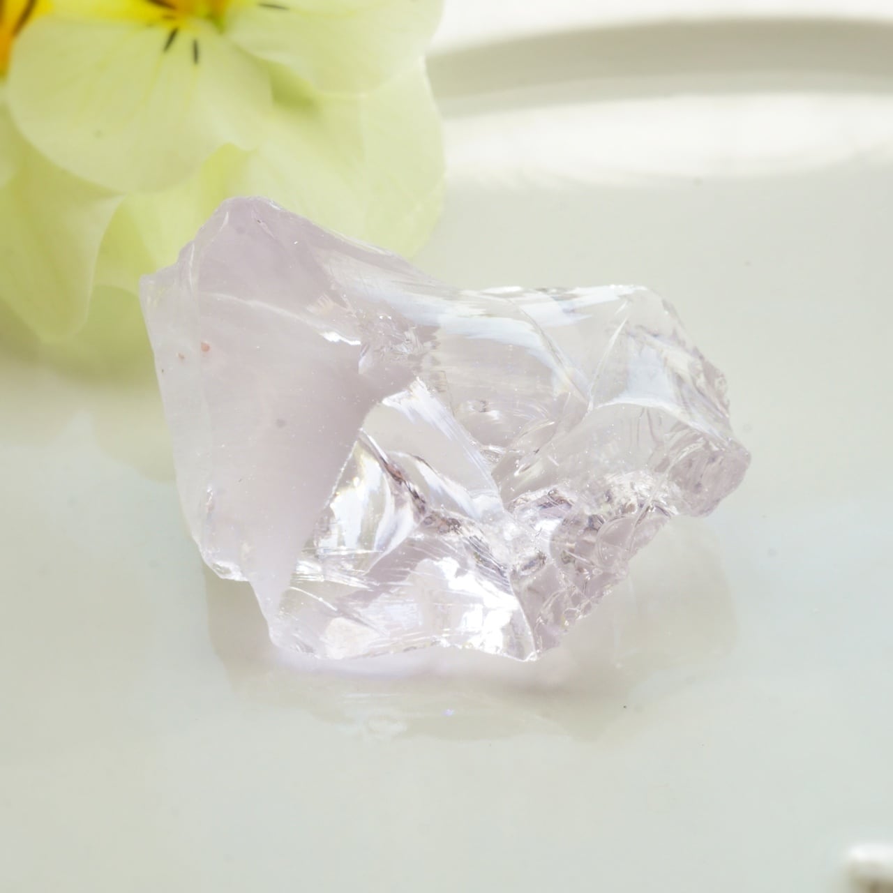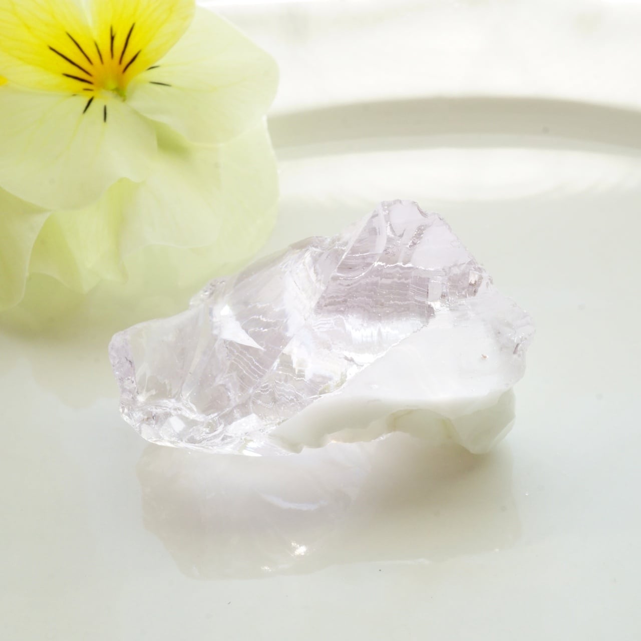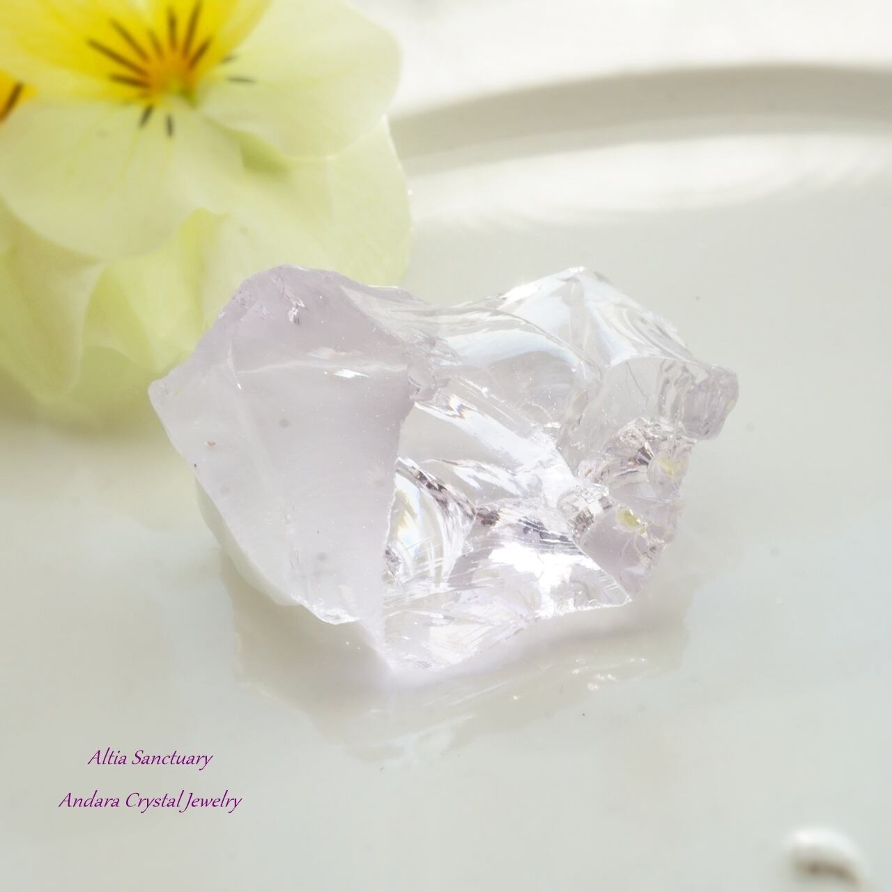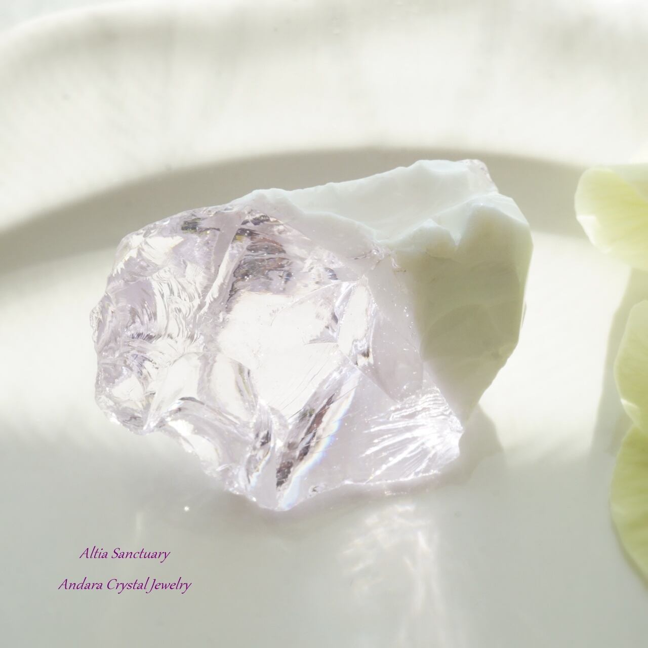 淡いピンクすみれ色の「アセンダント ライラック」です。ホワイトのパステルアイスと組み合わさったバイカラーの希少なアンダラクリスタルになります。また、小さな虹が見られます。約23gの中粒~やや大きめサイズのピースになります。
