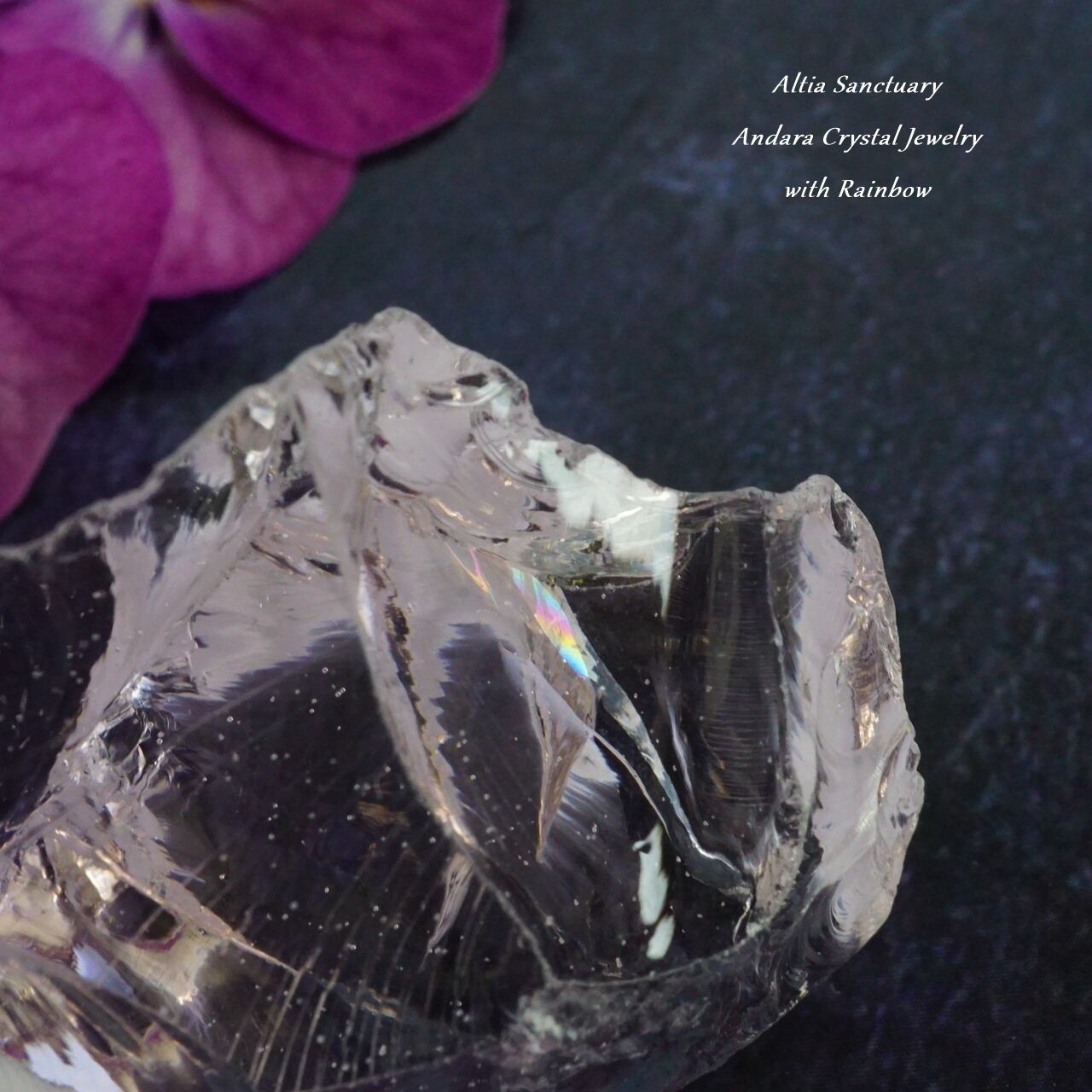 アンダラクリスタルは、黒曜石(オブシディアン)に似たガラス質で、ゴールド・シルバー・イリジウム・ロジウム・クロミニウム・プラチナなどの単原子成分が含まれており、レインボーの7色以上の美しいカラーを放つ魅力を持っています。