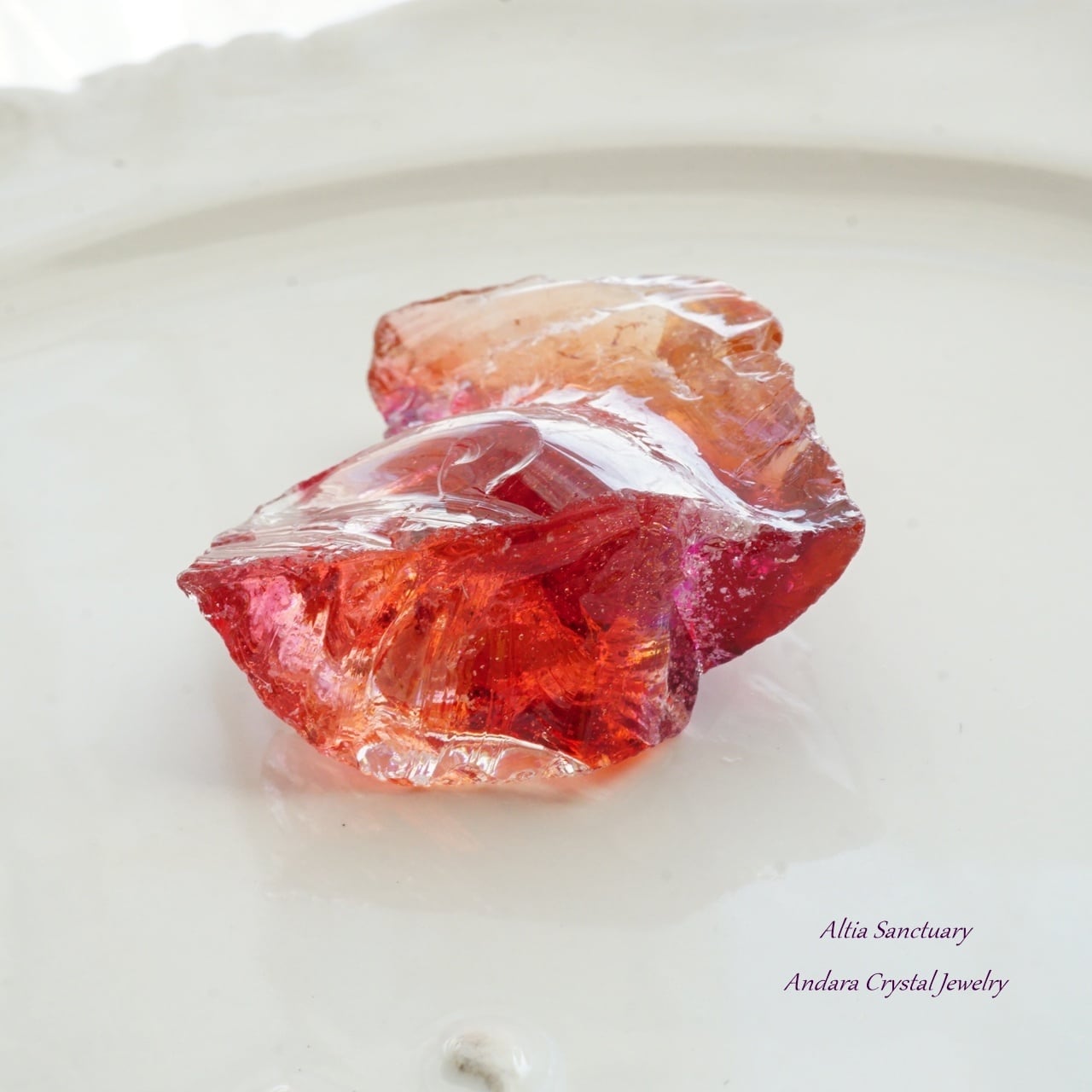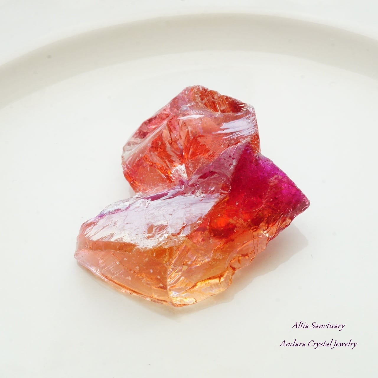 アンダラクリスタルは、黒曜石(オブシディアン)に似たガラス質で、ゴールド・シルバー・イリジウム・ロジウム・クロミニウム・プラチナなどの単原子成分が含まれており、レインボーの7色以上の美しいカラーを放つ魅力を持っています。