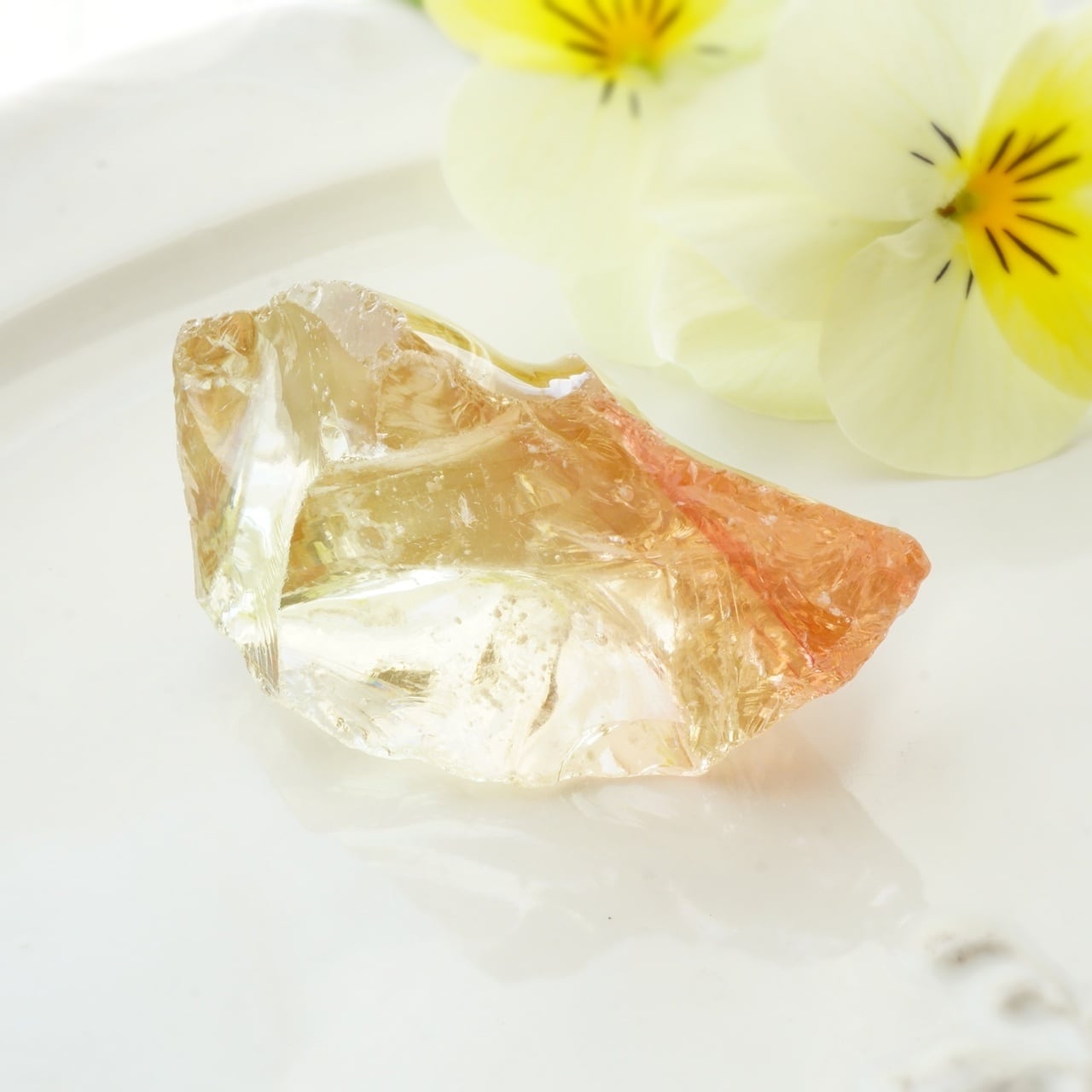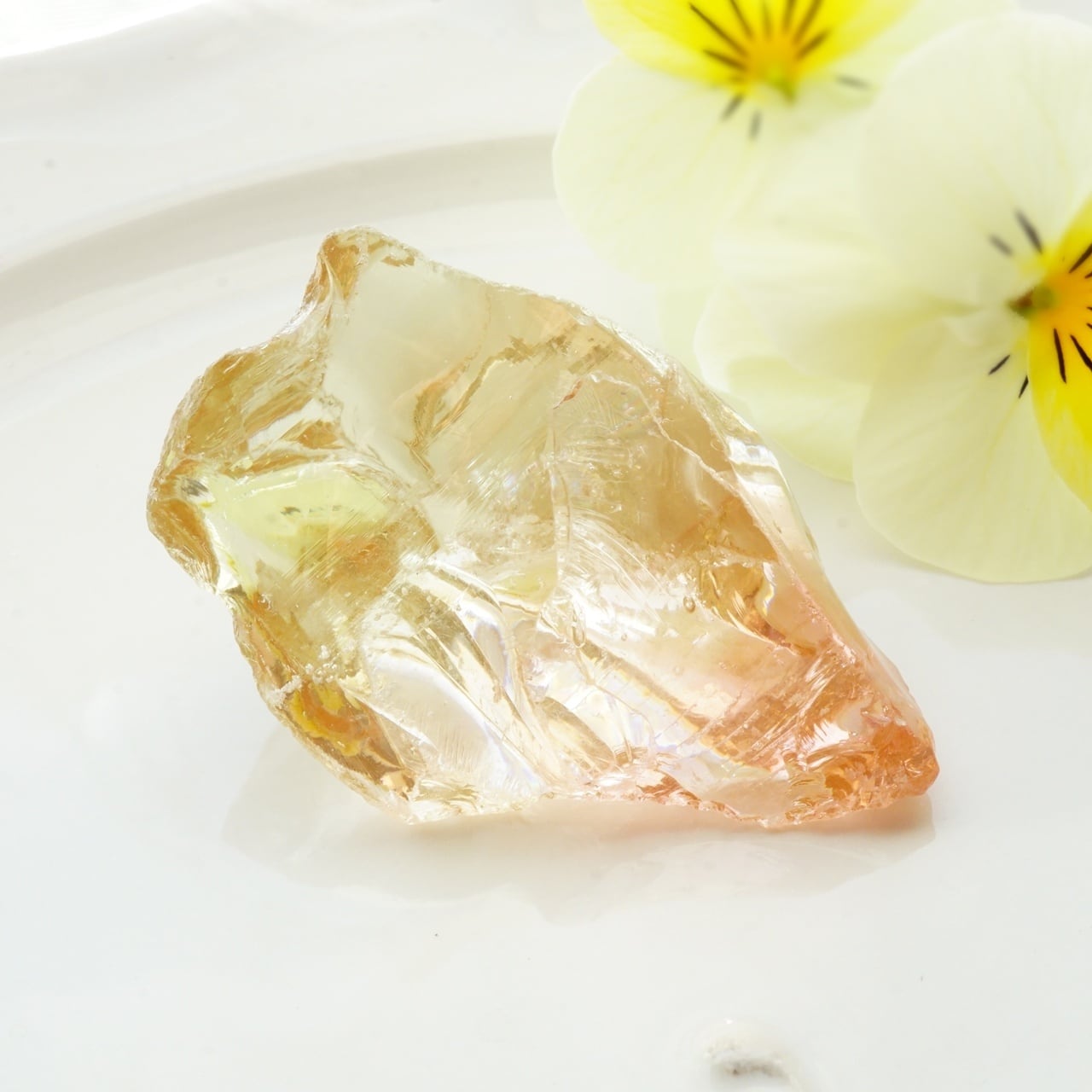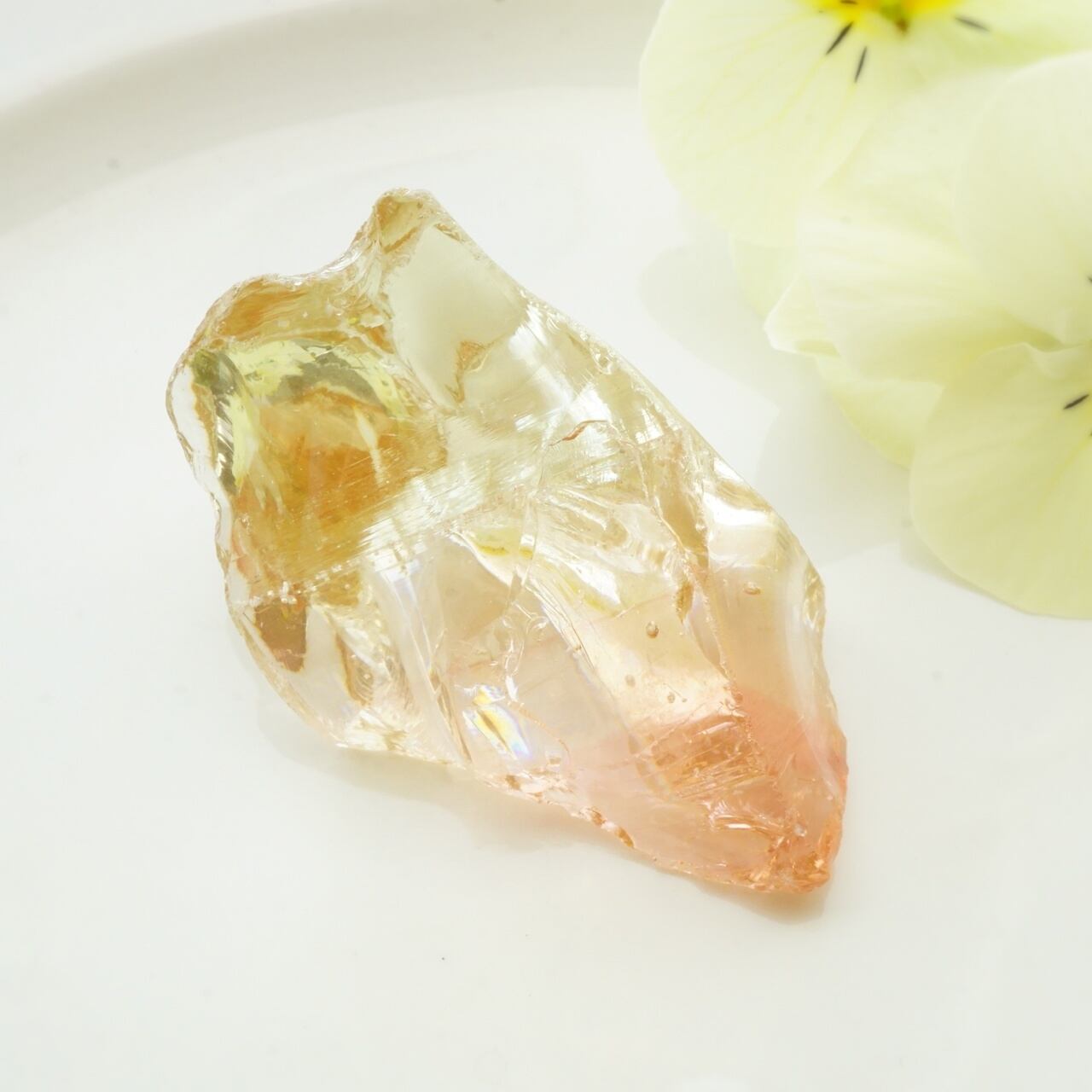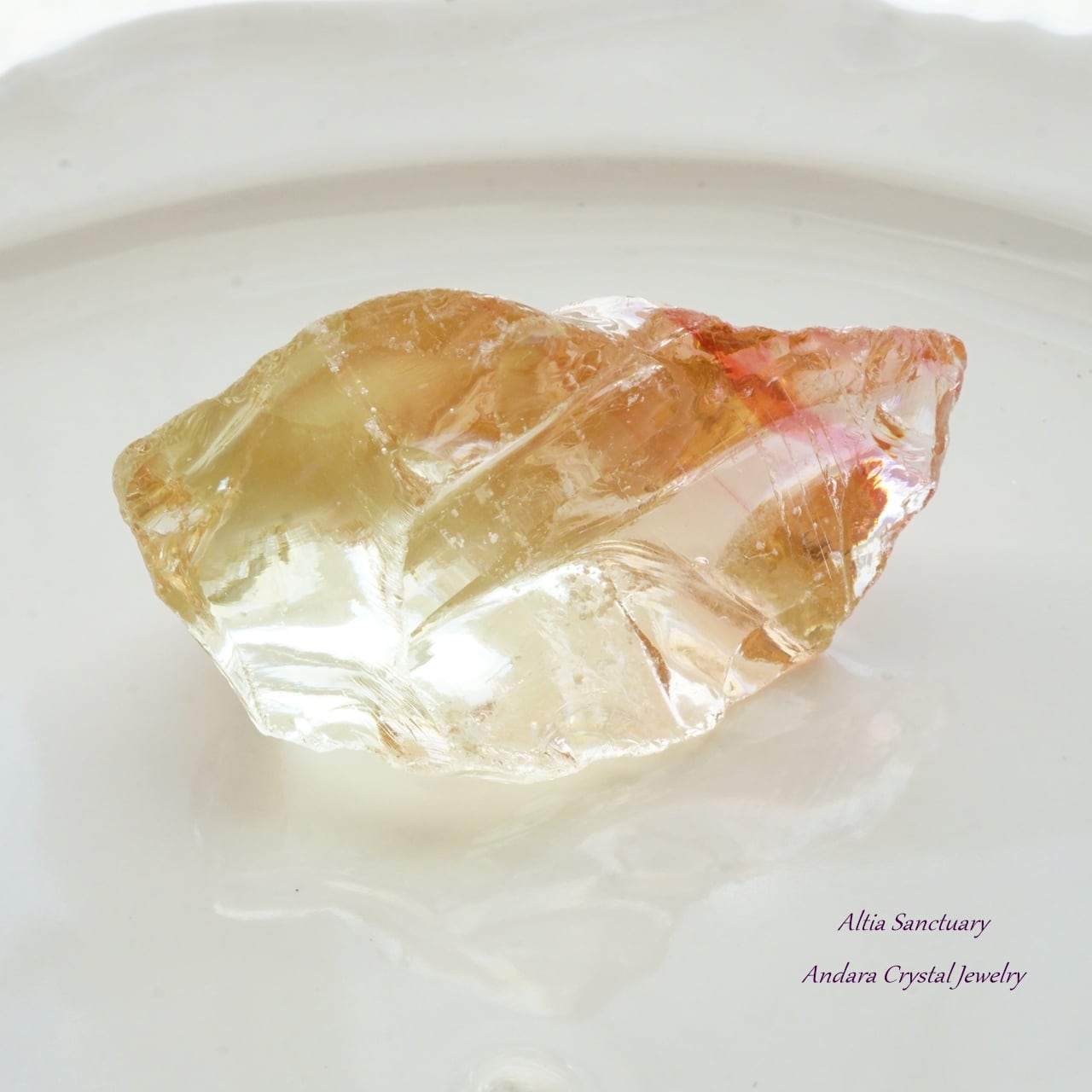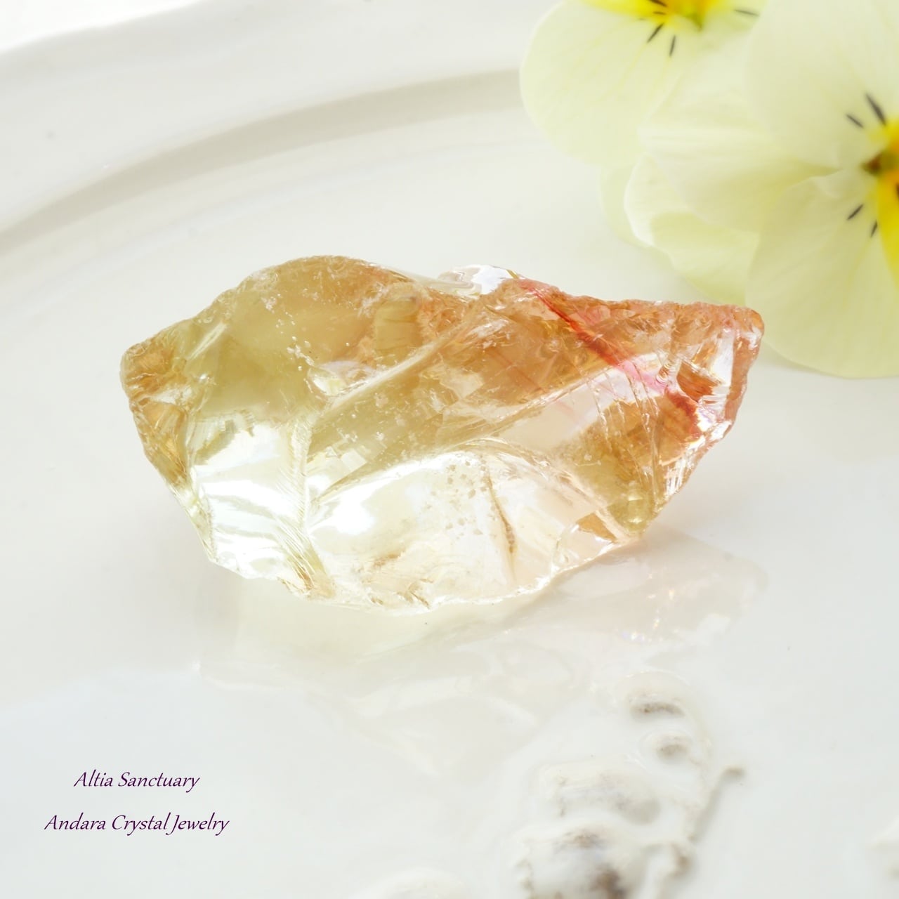 シャンパンゴールドに輝く「セレスチャルゴールド」に、ピンクが染まる美しく愛らしい希少なアンダラクリスタルです。ピンクは「HGWピンク」に「ソフィア」がライン状に入っています。また、微細な気泡のヴェールと小さな虹を内包しています。37g程の大きめピースになります。