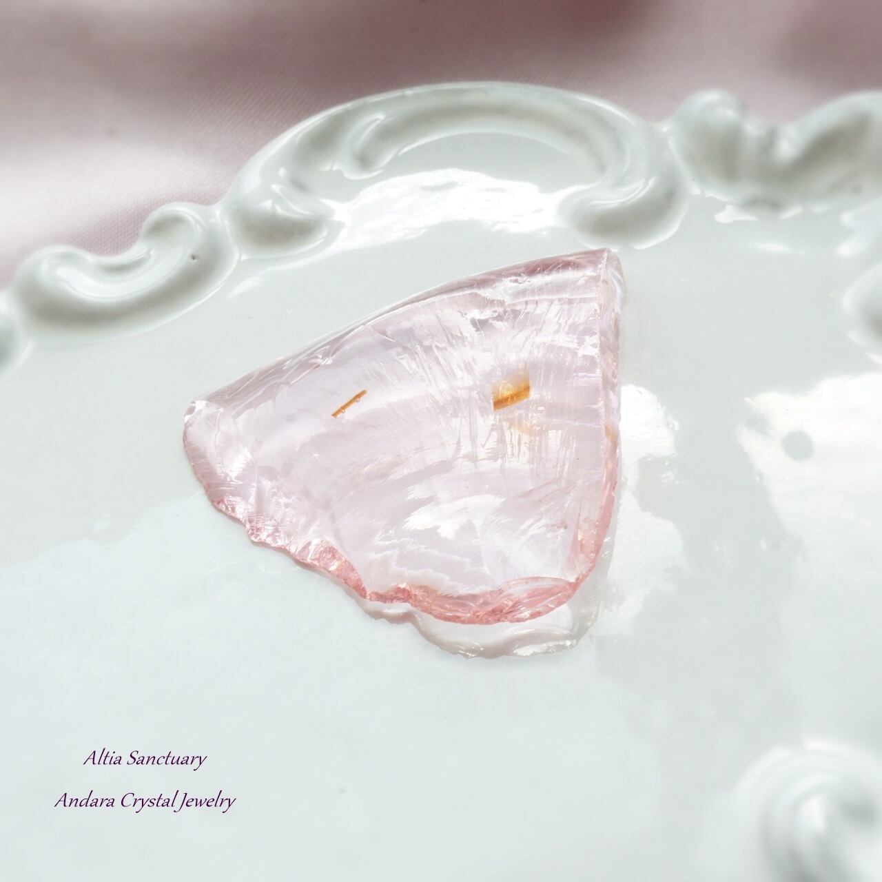 新色「パパラチア」は、蓮の花びらのような神聖で可憐なオレンジピンク色のアンダラクリスタルです。こちらは、アースシャーマンの点線のようなアースシャーマンが入り込んだレアなパパラチアになります。