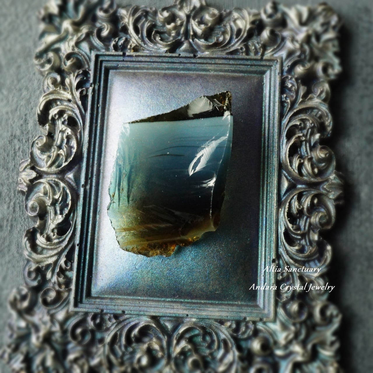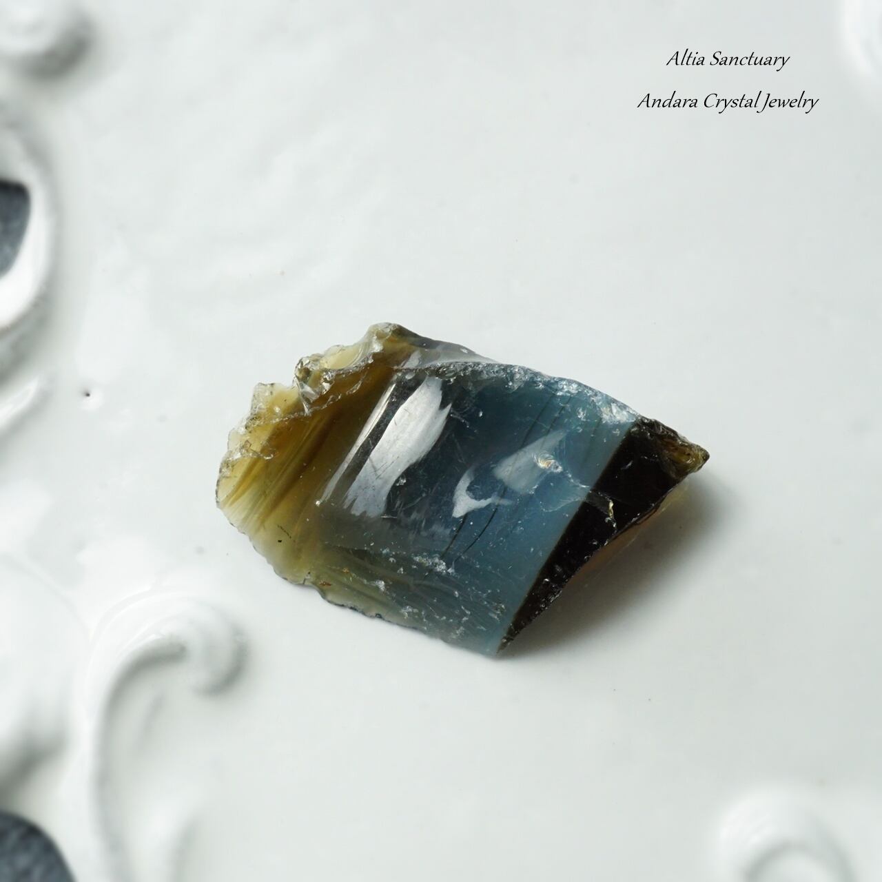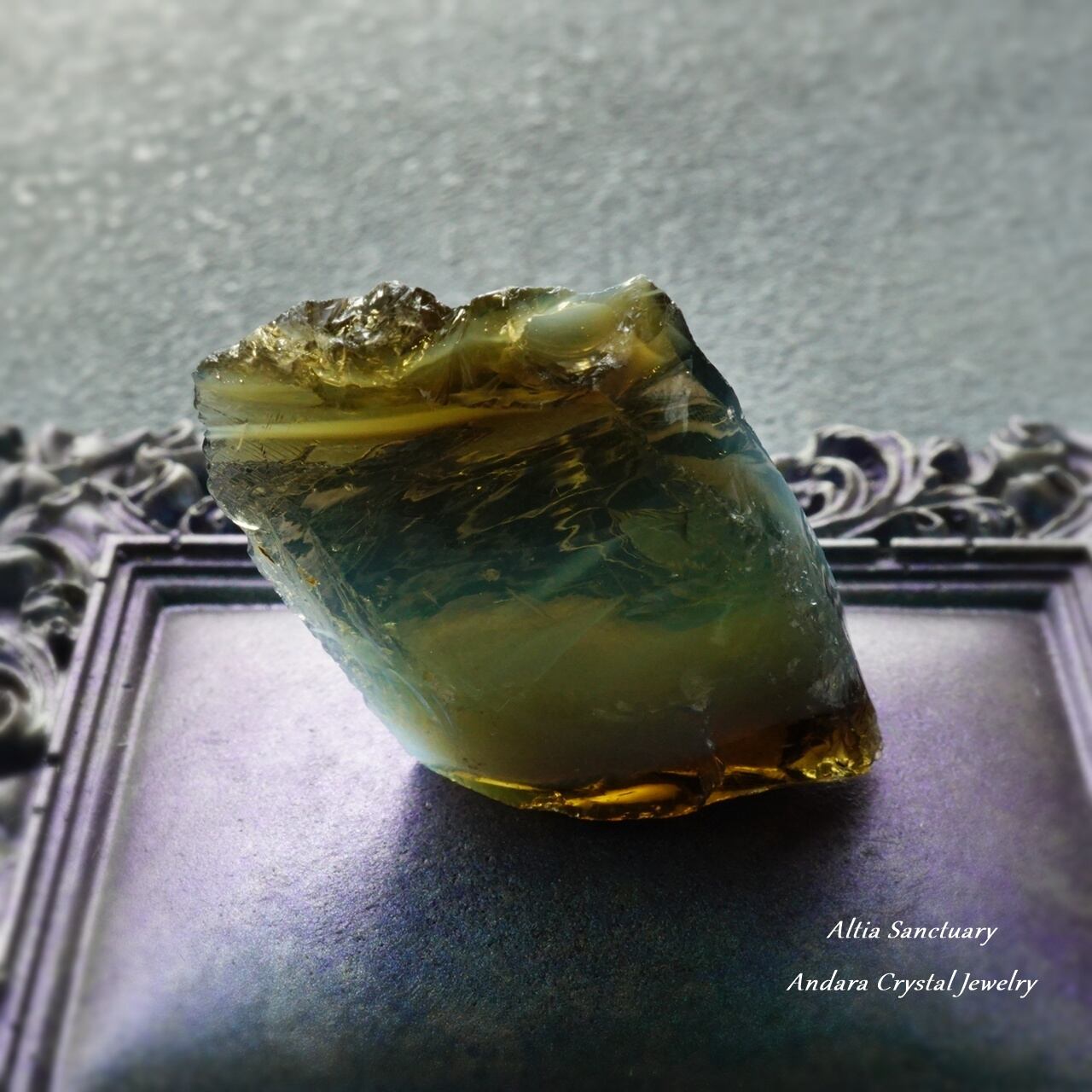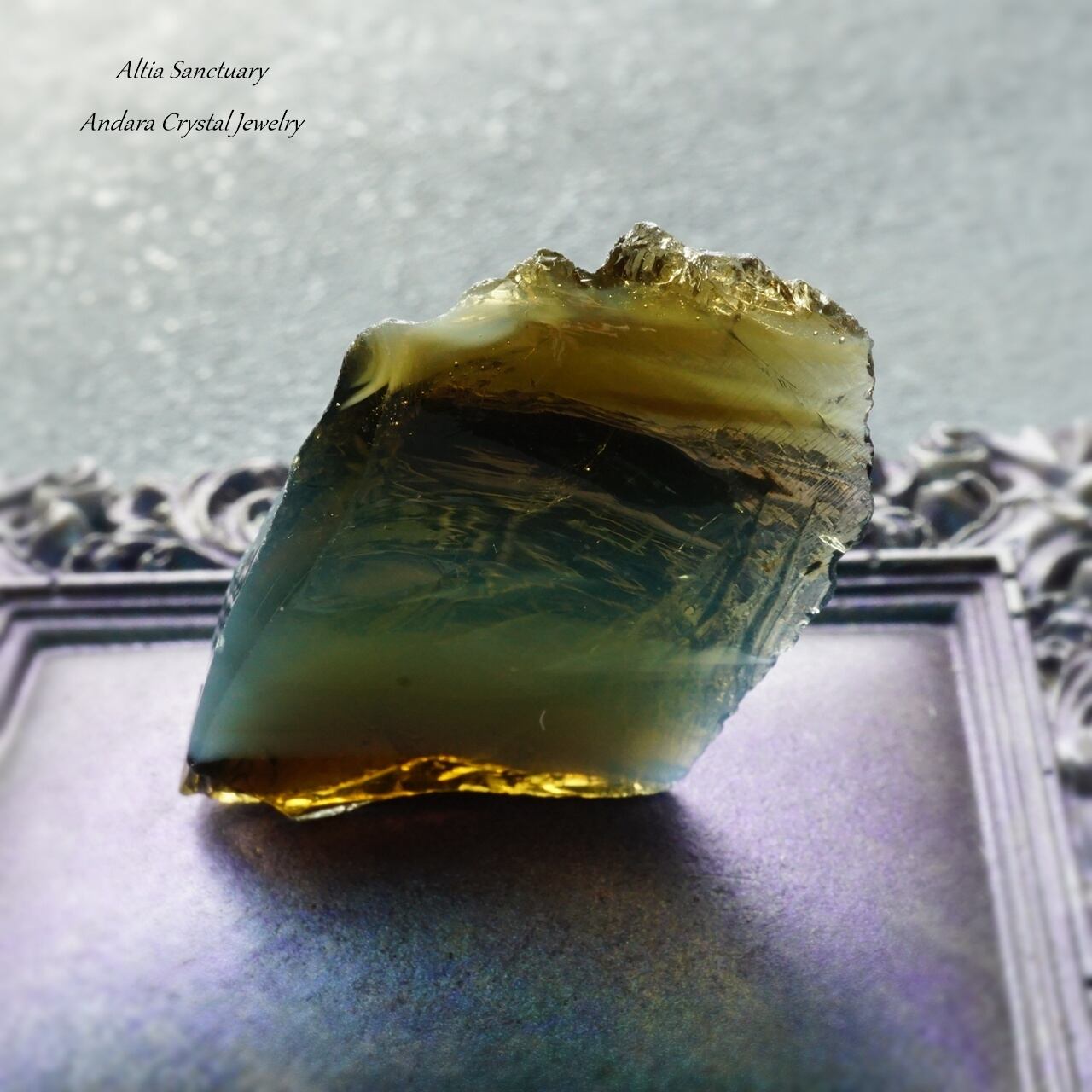 アンダラクリスタルは、黒曜石(オブシディアン)に似たガラス質で、ゴールド・シルバー・イリジウム・ロジウム・クロミニウム・プラチナなどの単原子成分が含まれており、レインボーの7色以上の美しいカラーを放つ魅力を持っています。