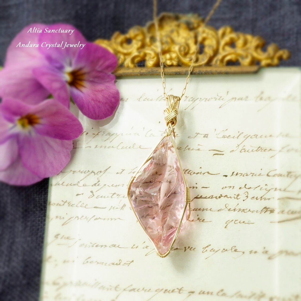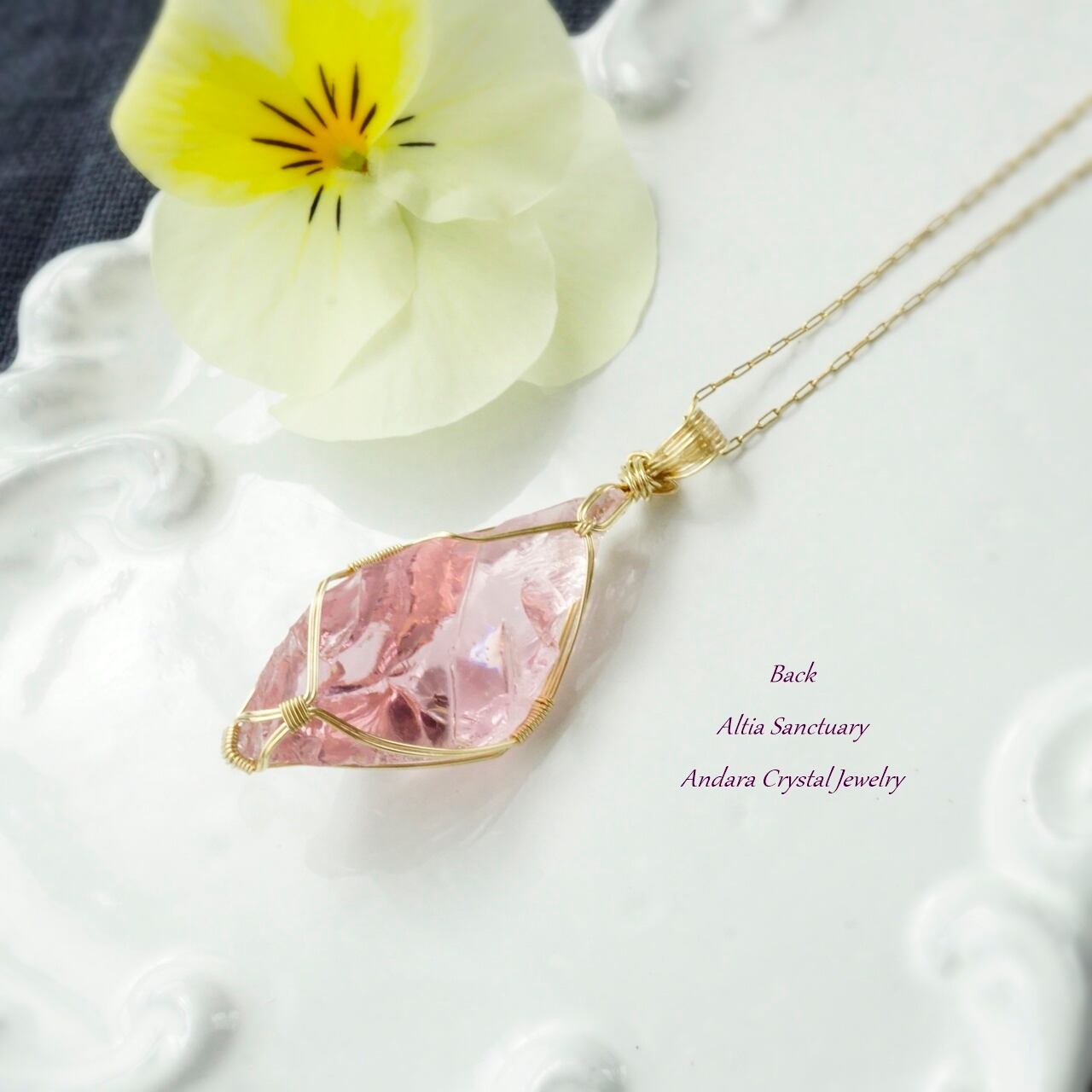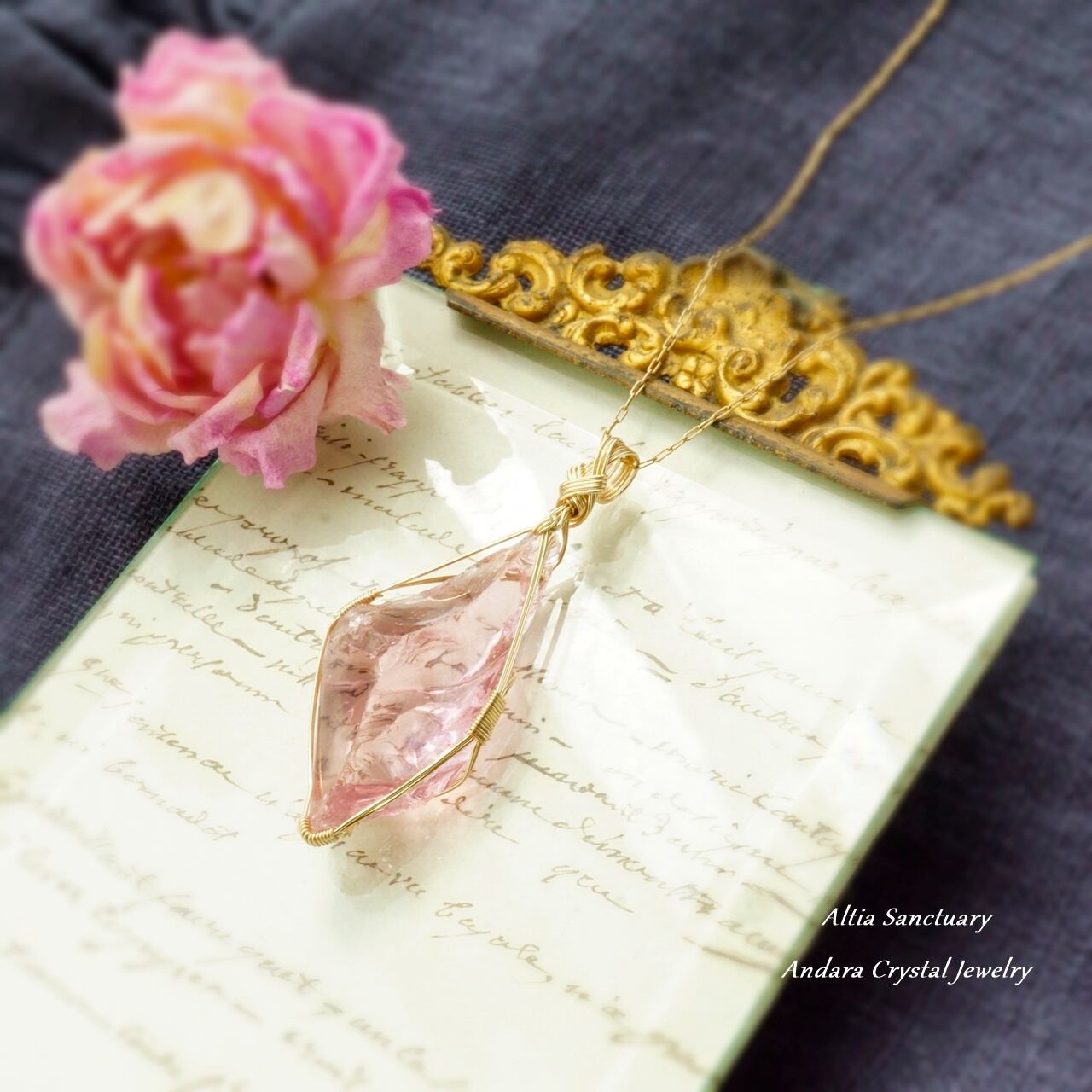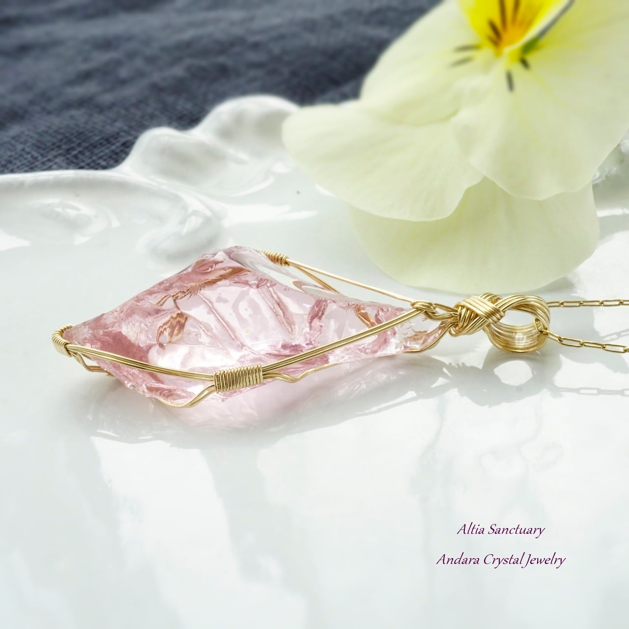 内側のきらめきが美しい愛らしいピンク色のアンダラクリスタルです。純粋なアンダラの輝きを最大限に輝かせる女神巻き®に仕立てました。