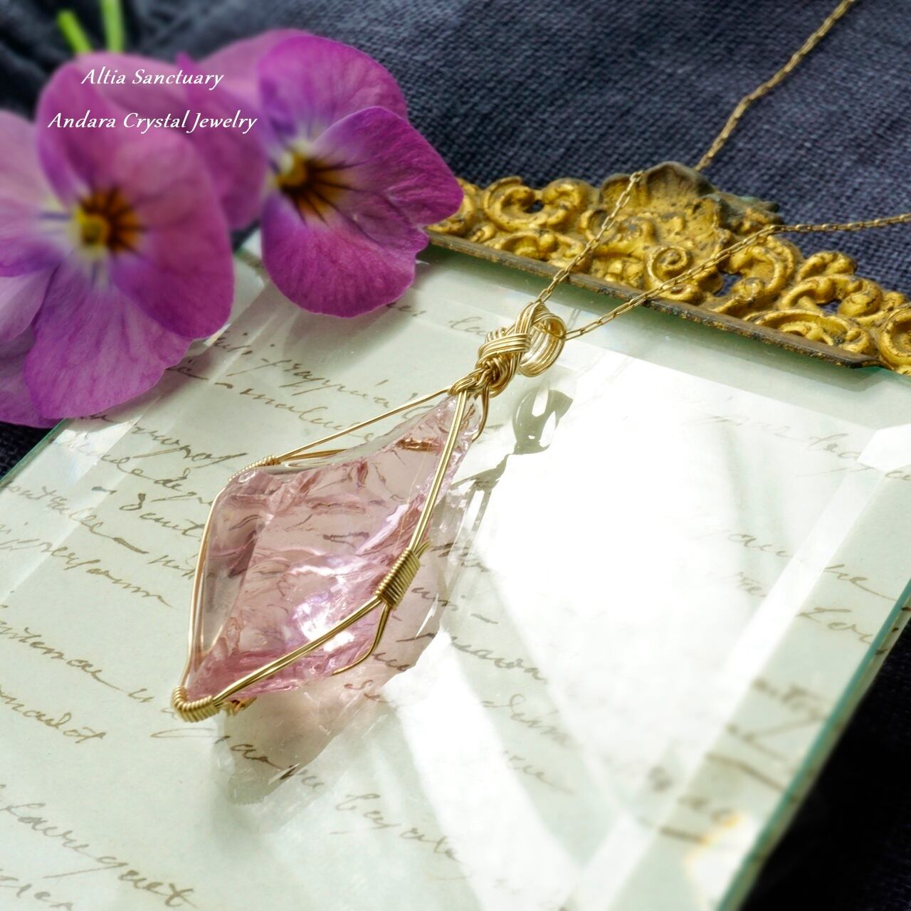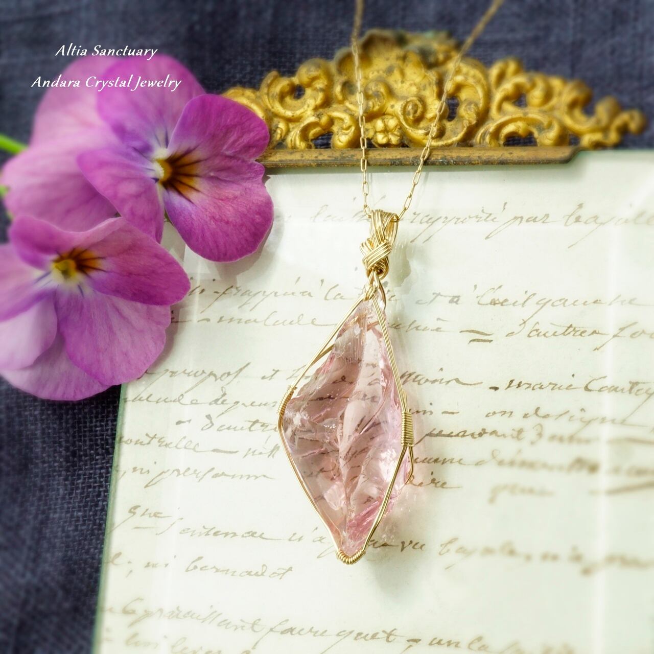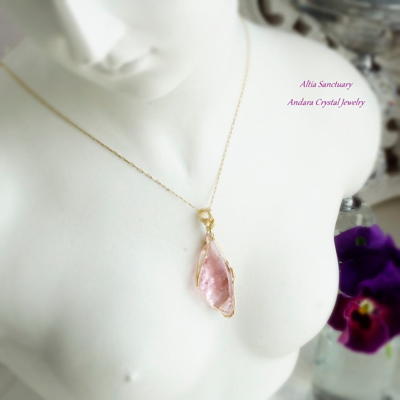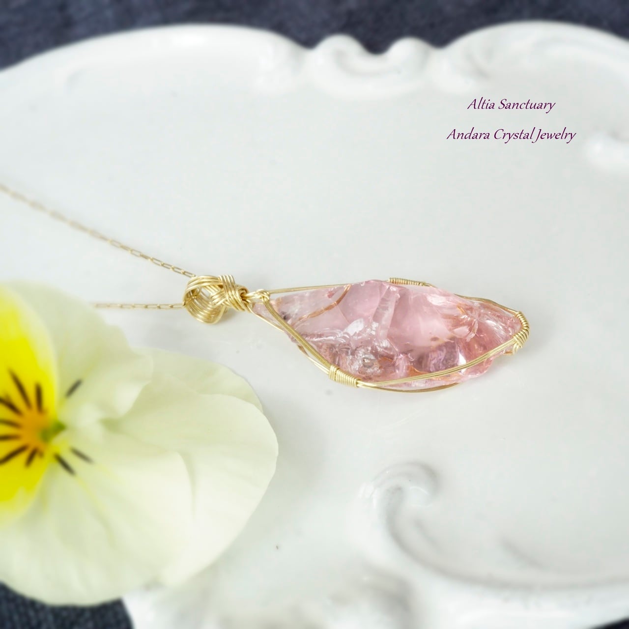 内側のきらめきが美しい愛らしいピンク色のアンダラクリスタルです。純粋なアンダラの輝きを最大限に輝かせる女神巻き®に仕立てました。