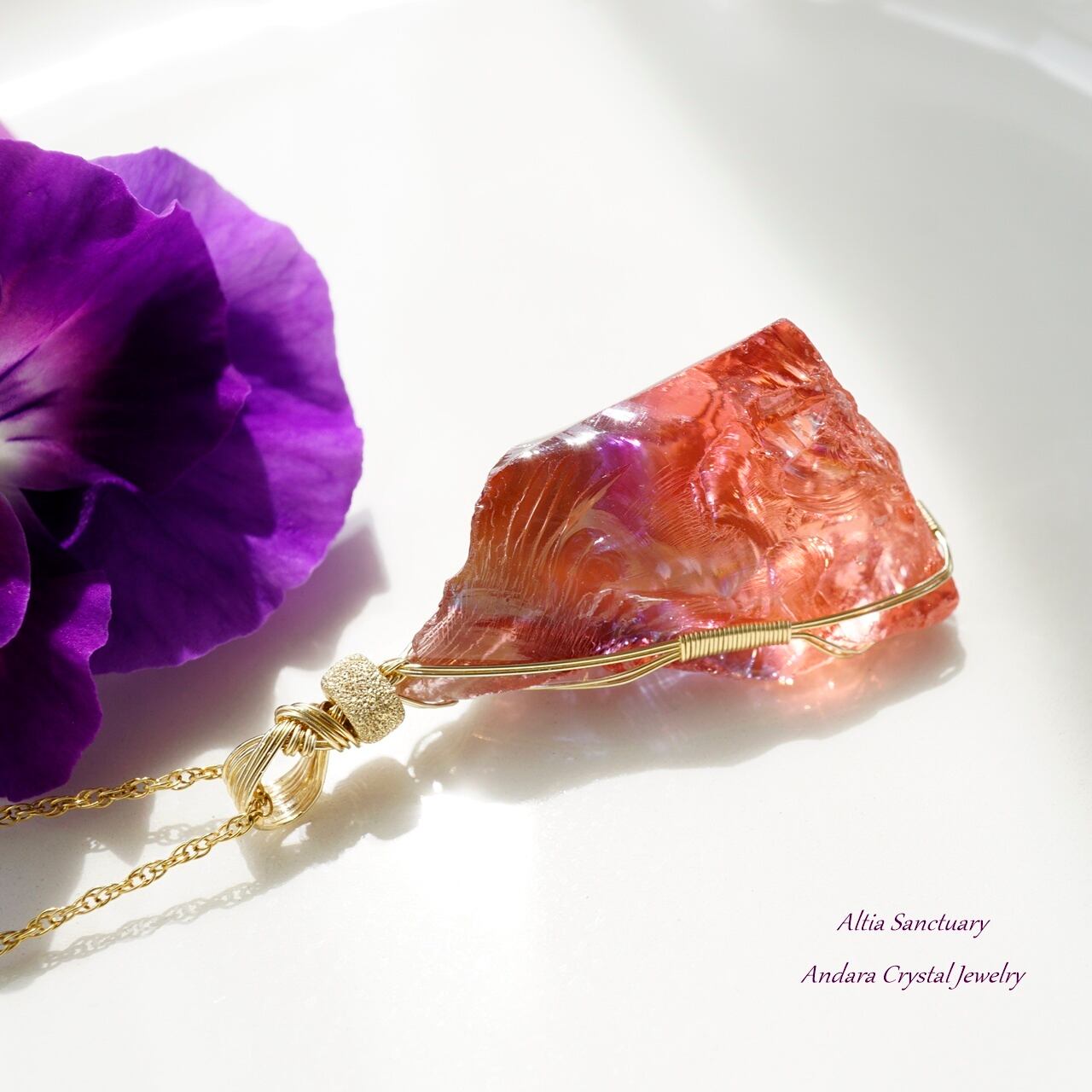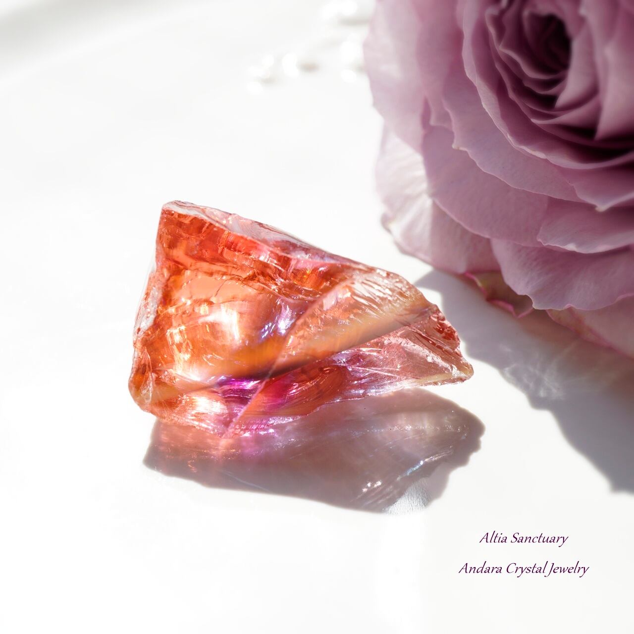 このアンダラは、ピンクの色調とゴールドのハイライトを持つ「ソフィア」に「ゴールド」、「ラズベリー」や「ヴァイオレットソブリンアメジスト」等、様々な特性が含まれる美しい希少なアンダラクリスタルです。