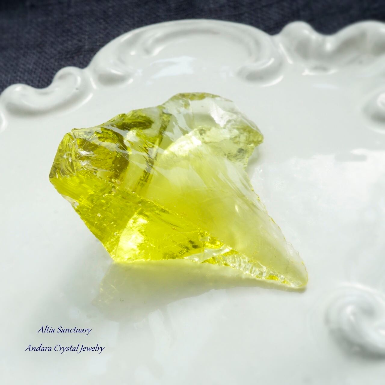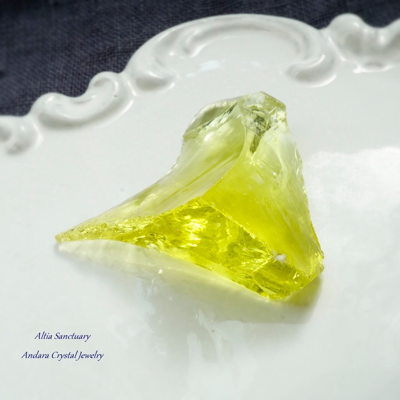 明るい星の輝きを放つ「サンスター」の喜びのエネルギーと、神聖な温かさを放つ「ダイナミックヘリオドール」、生命への活力を与えてくれる「テラオリーブ」の神々しいキラメキを放つマルチカラーのアンダラクリスタルです。