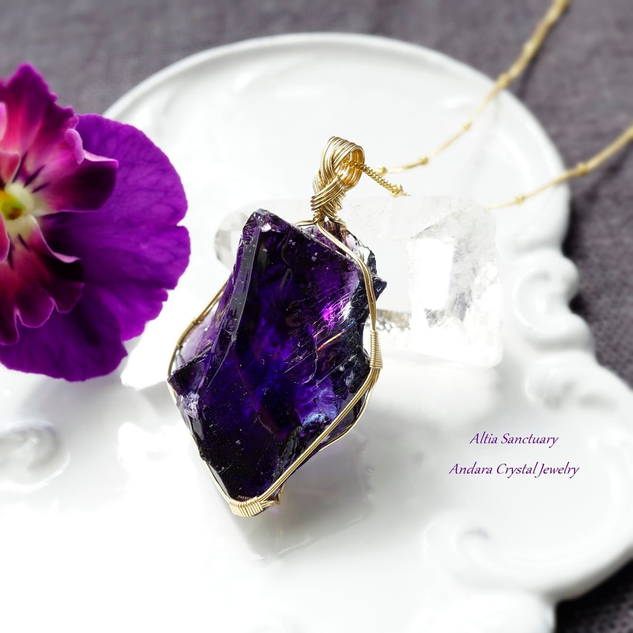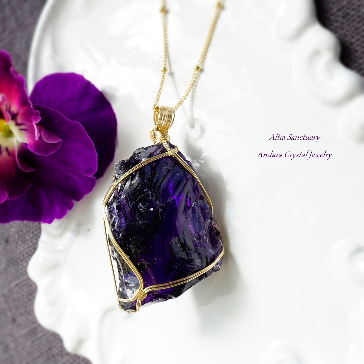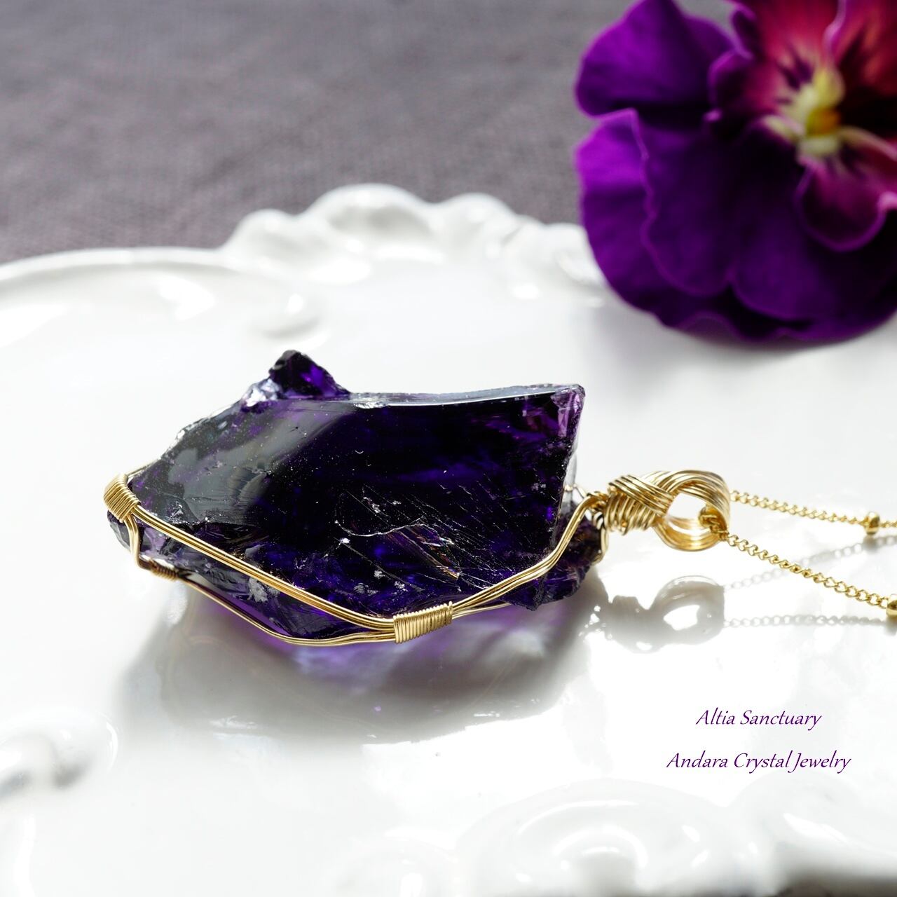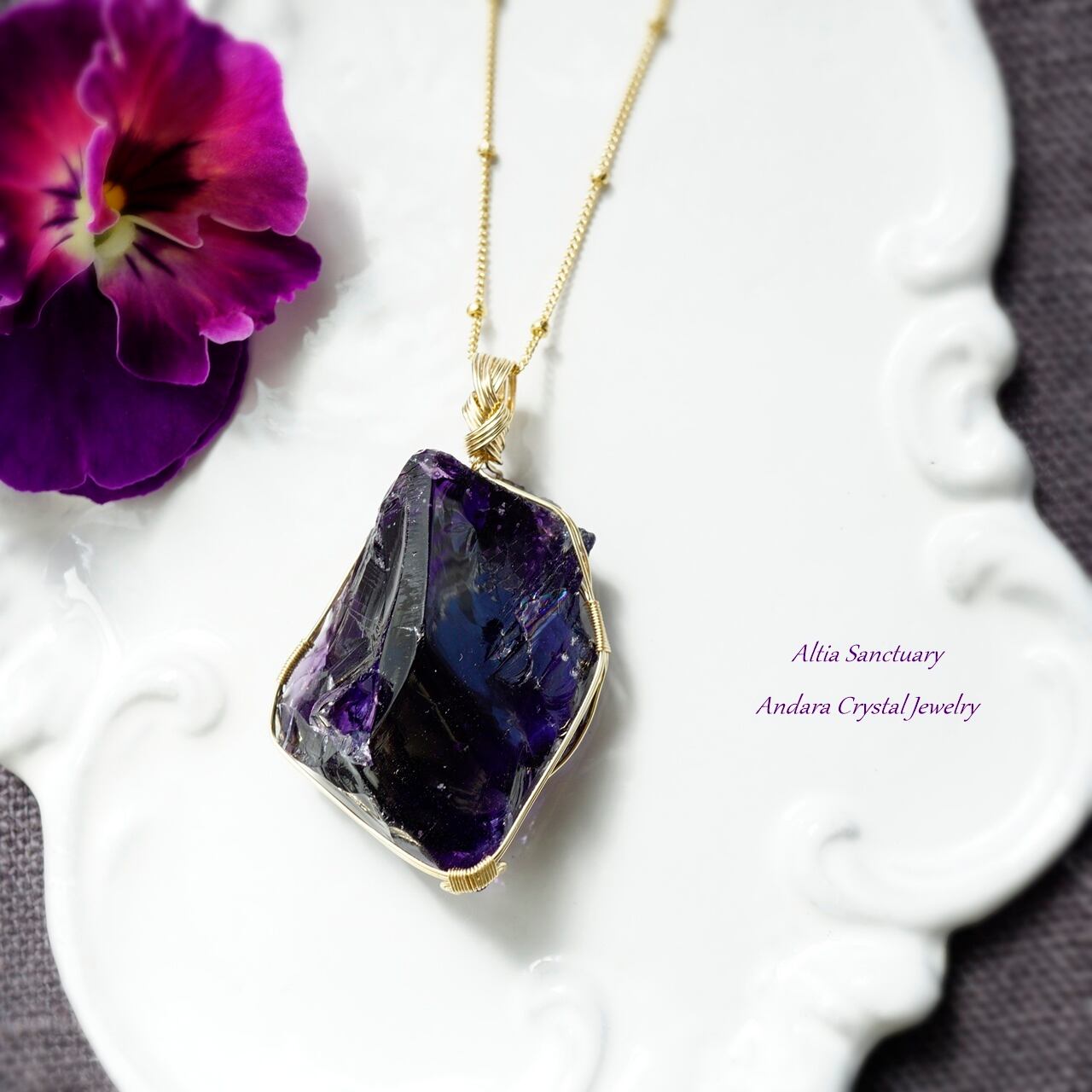 マルチカラー アンダラクリスタル(イリジウムアメジスト/インディゴサファイア)虹入り原石をご購入後に、女神巻き®ペンダントにお仕立てしました。