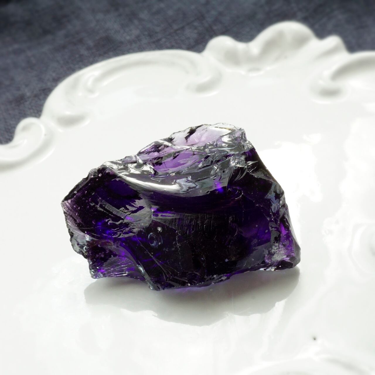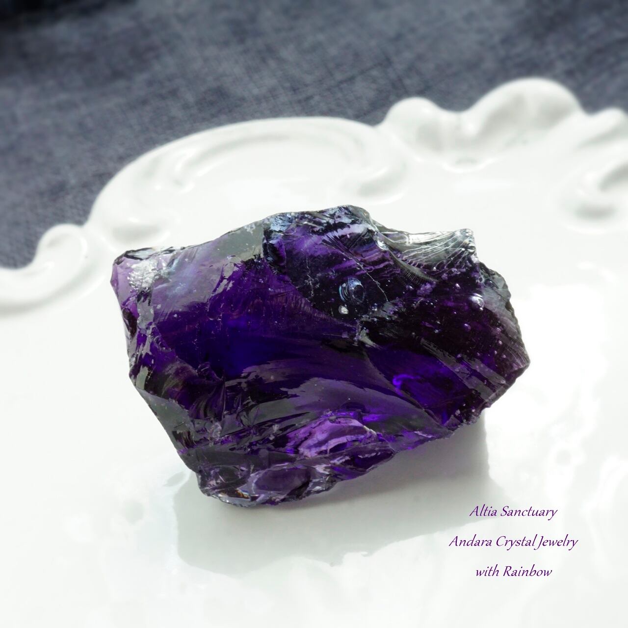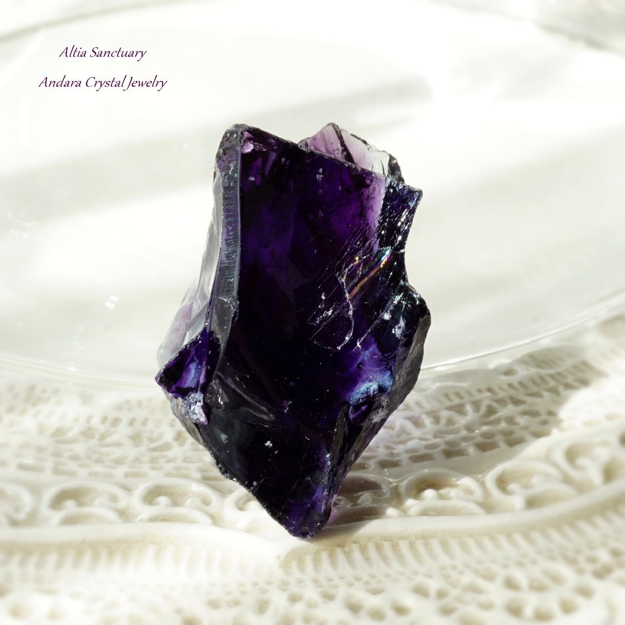 ミステリアスなブラック×鮮やかなパープルがマリアージュした「イリジウムアメジスト」です。光を通すと、より魅惑的なパープルが光り輝きます。そこに「インディゴサファイア」も見られます。小さな虹も輝いています。