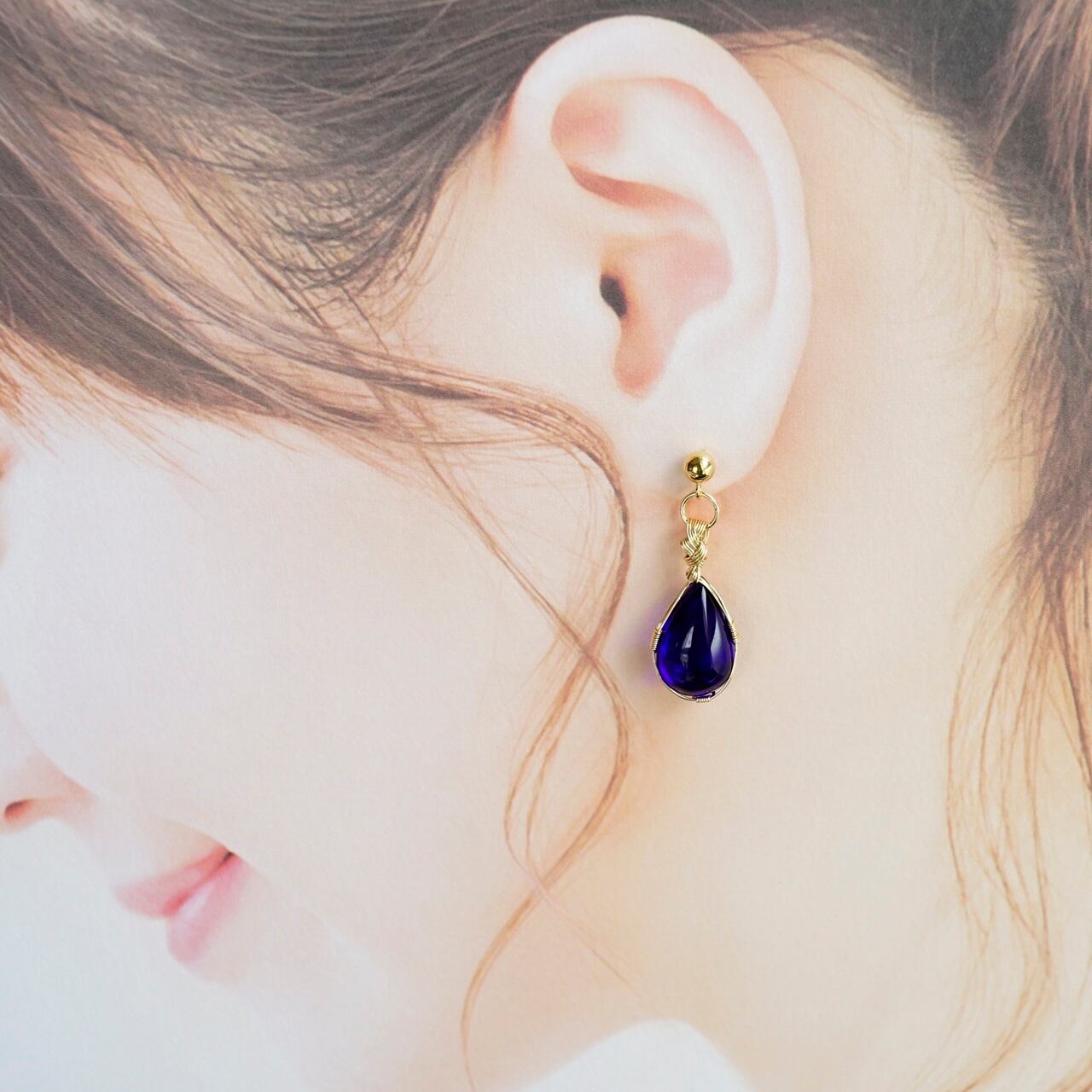 以前購入いただいた「タンザナイトファイヤー」をしずく型の両面カボションに研磨加工し、女神巻き®ピアスに仕立てました。ピアス金具は、14KGF ポスト&キャッチ式 になります。