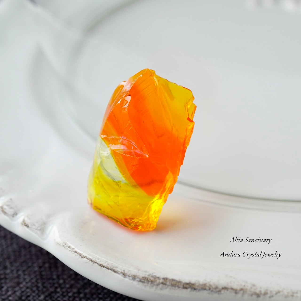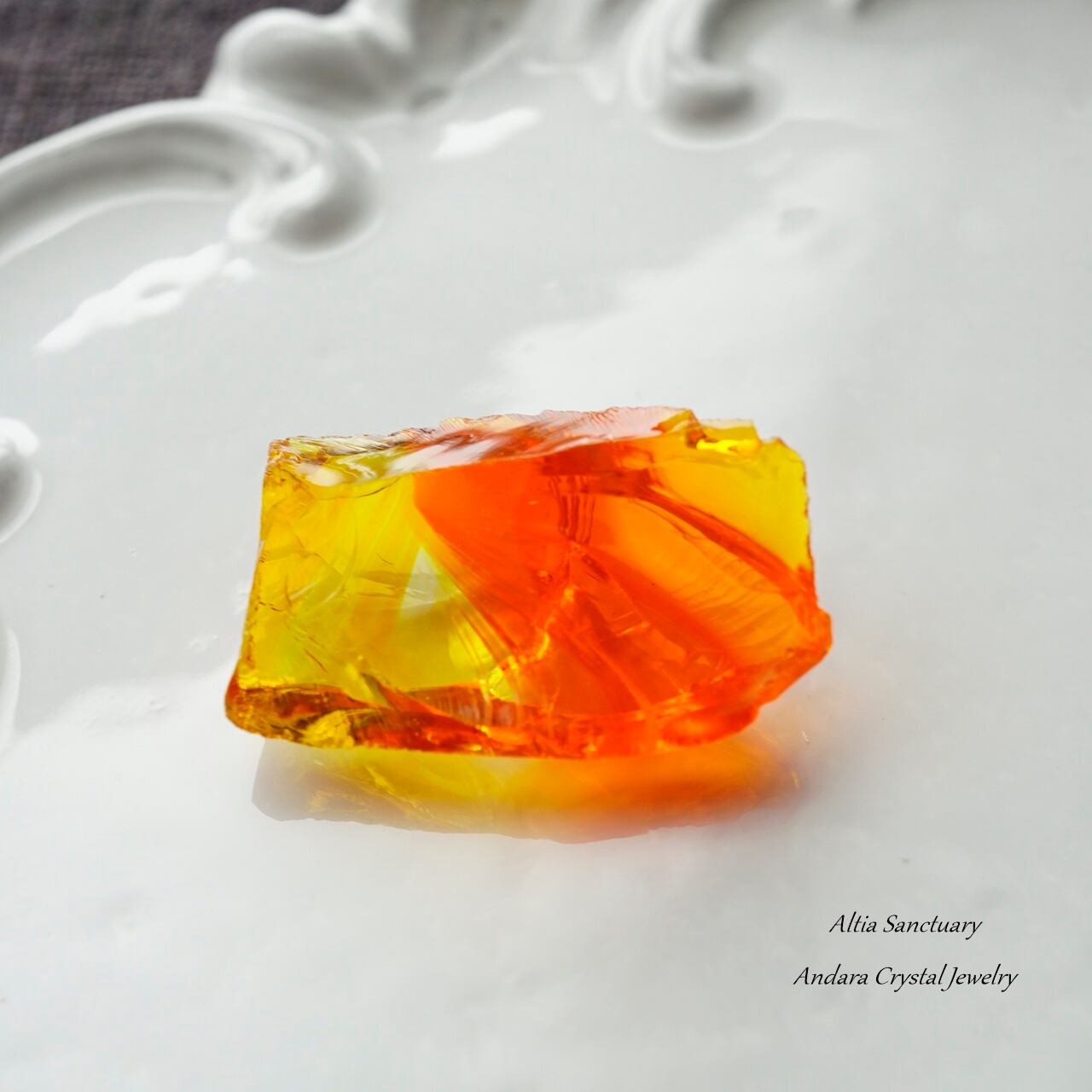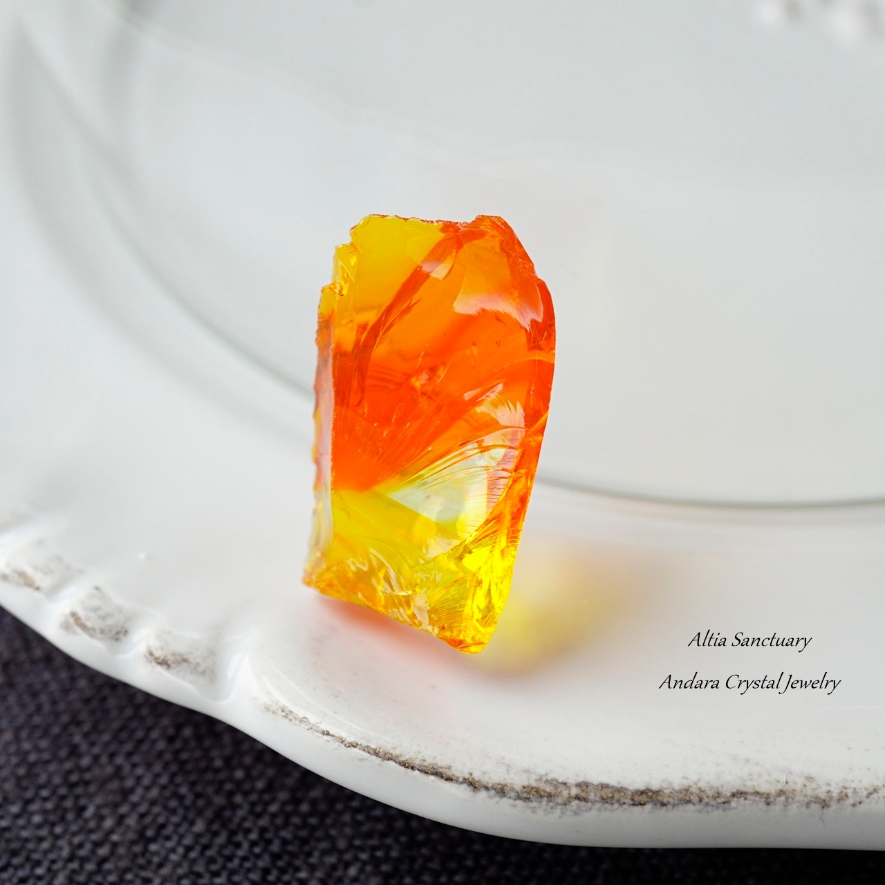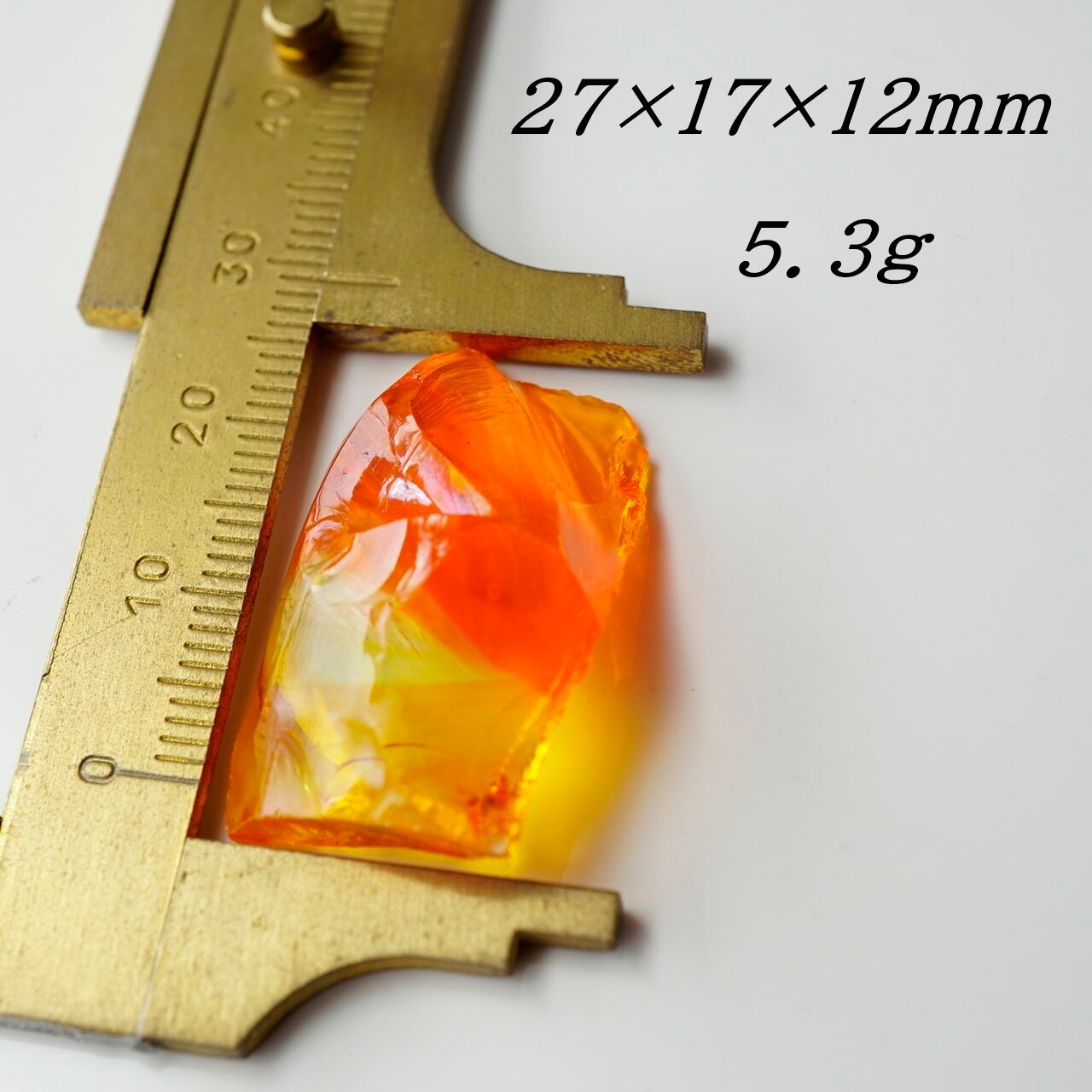 オレンジイエローのビタミンカラーが元気を与えてくれる「ファイヤーオパール」です。オレンジがBanded(縞模様)になり、クリア~イエロー~オレンジのグラデーション模様が美しいアンダラクリスタルです。5.3gの小さなピースになります。