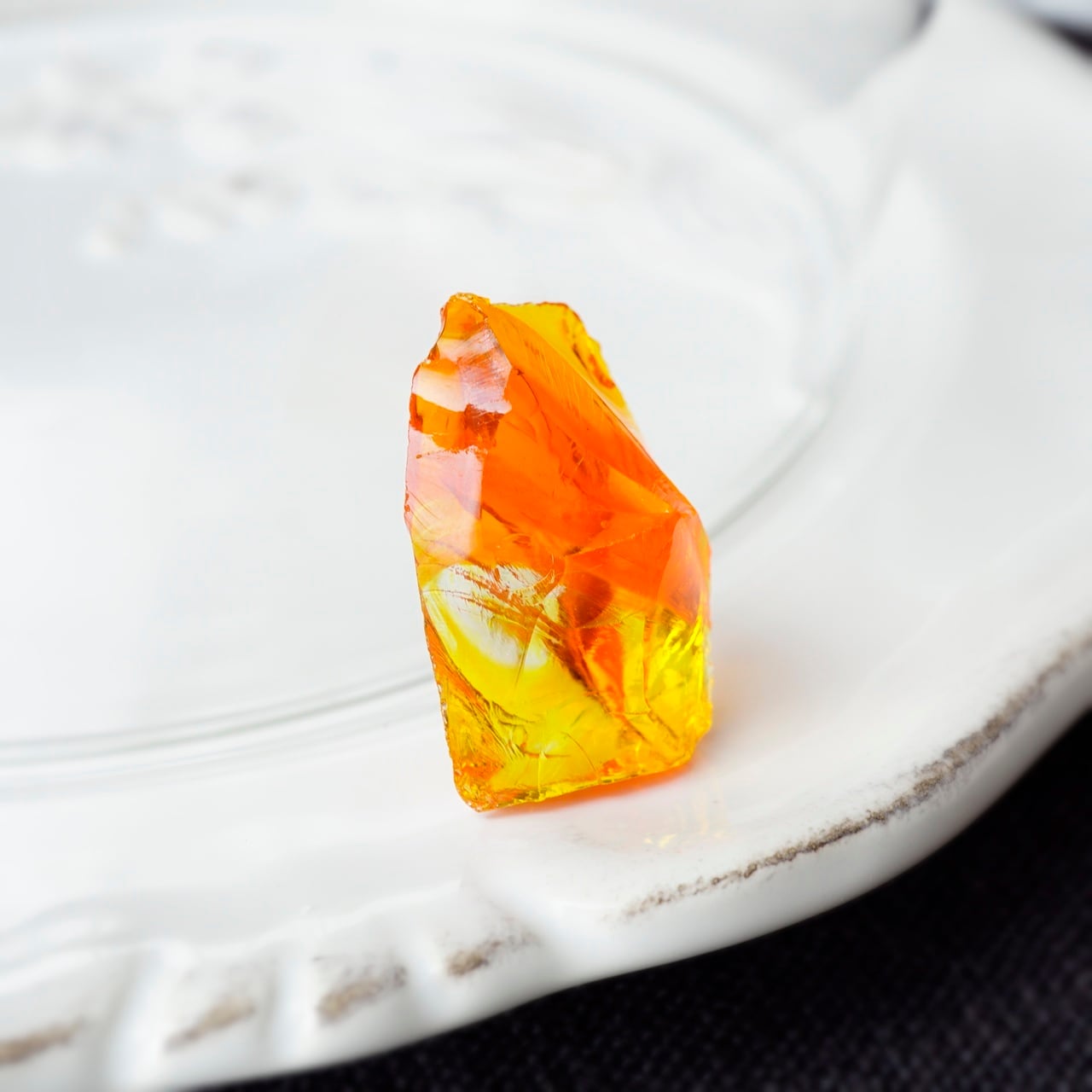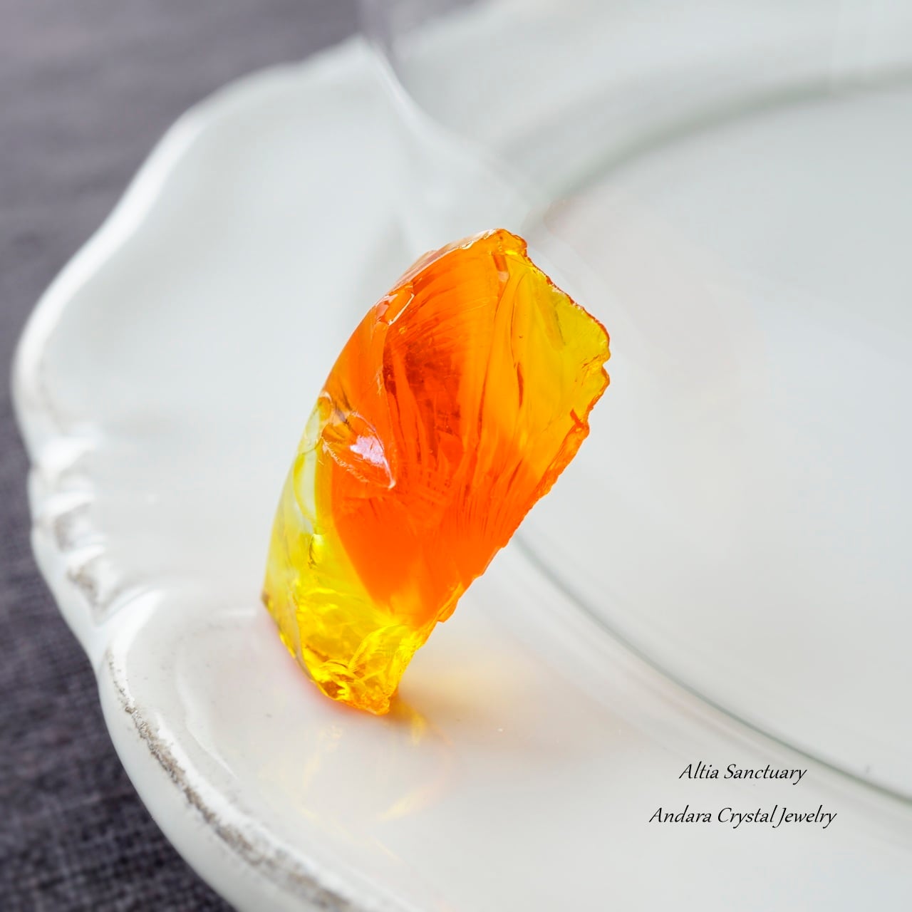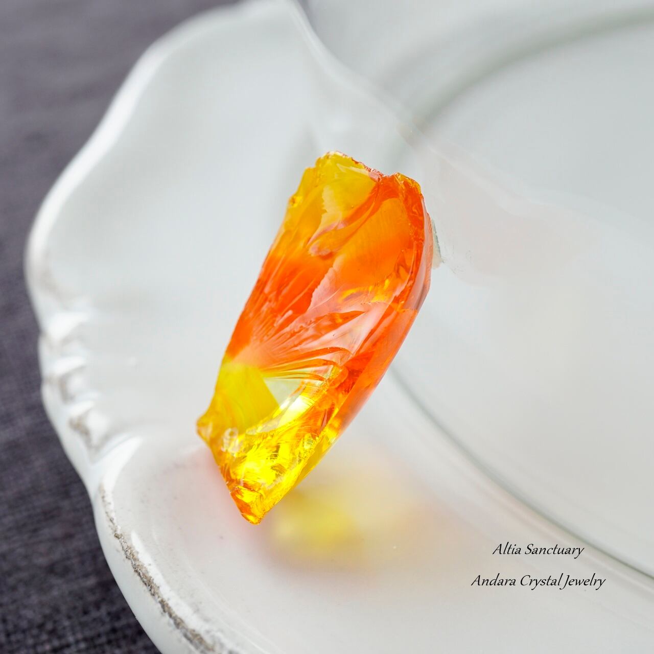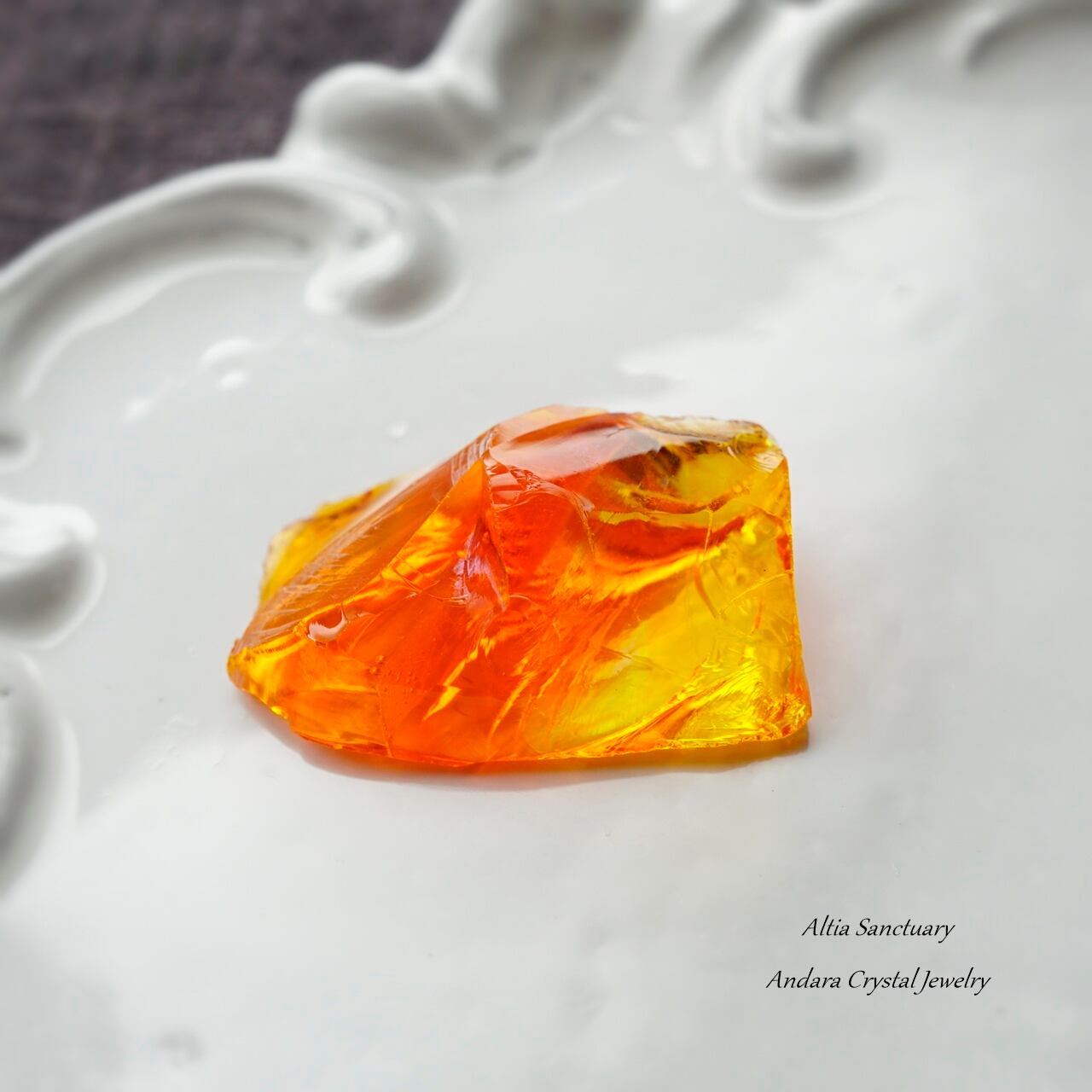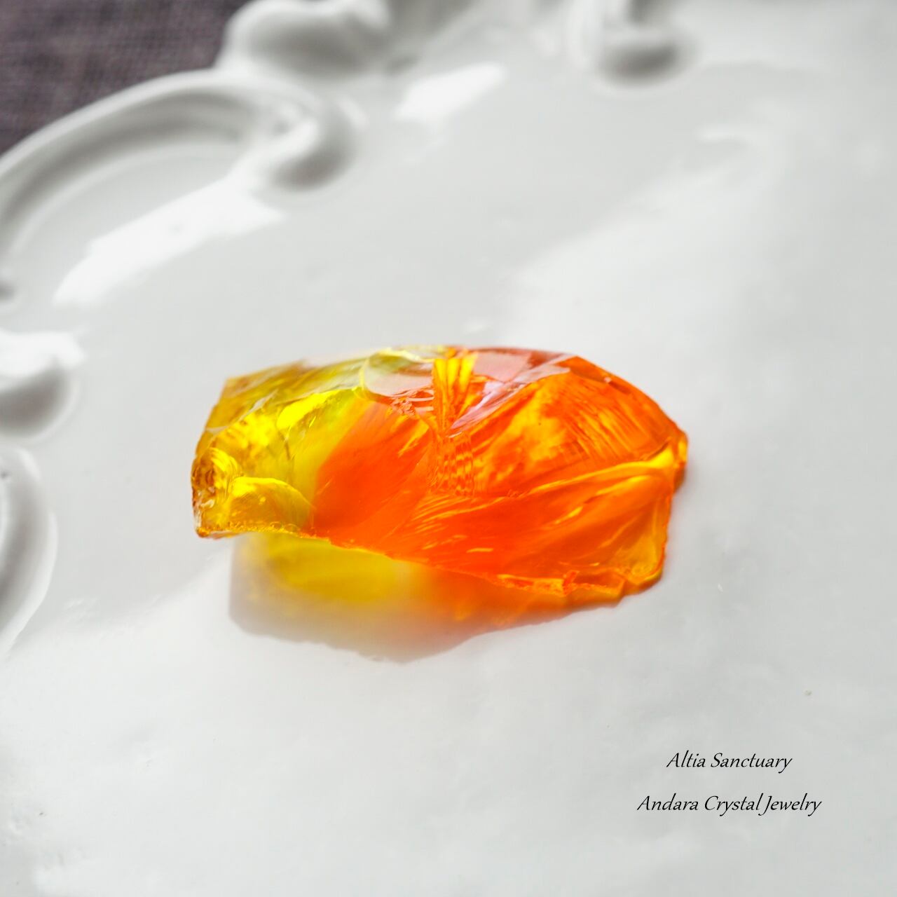 オレンジイエローのビタミンカラーが元気を与えてくれる「ファイヤーオパール」です。オレンジがBanded(縞模様)になり、クリア~イエロー~オレンジのグラデーション模様が美しいアンダラクリスタルです。5.3gの小さなピースになります。