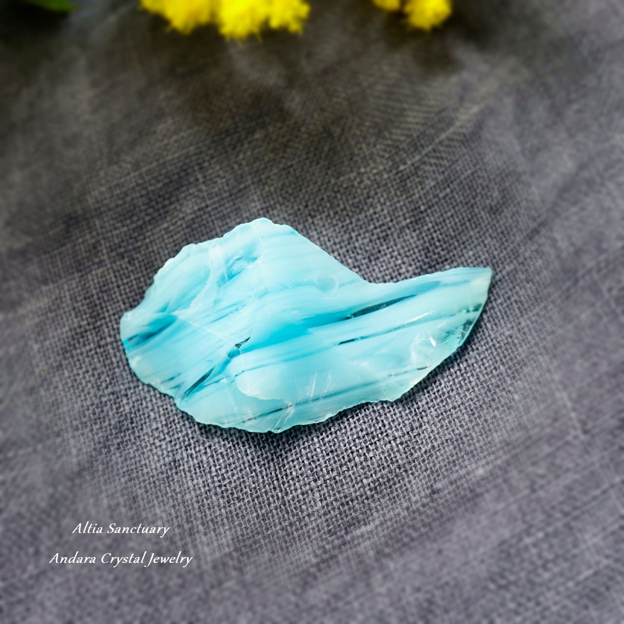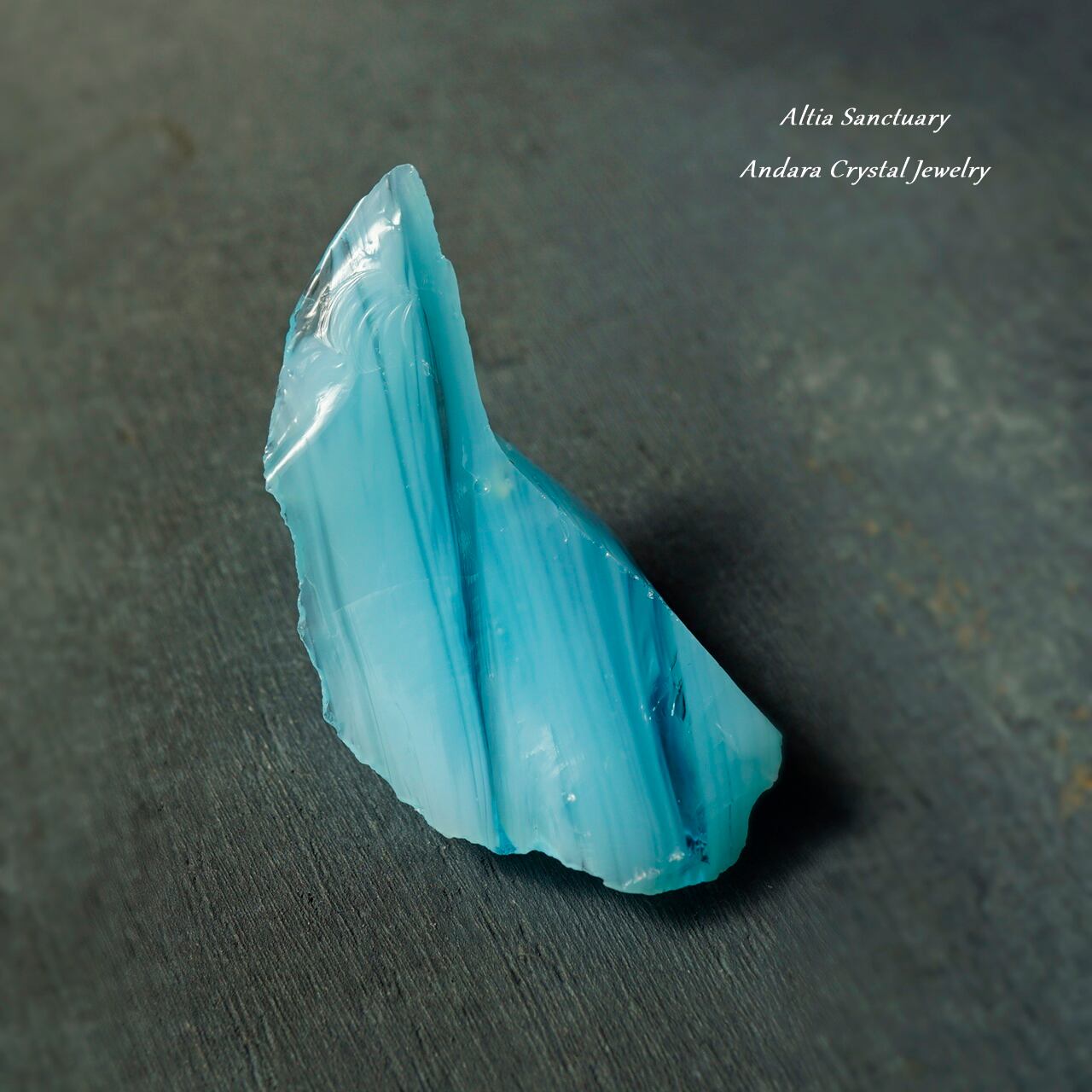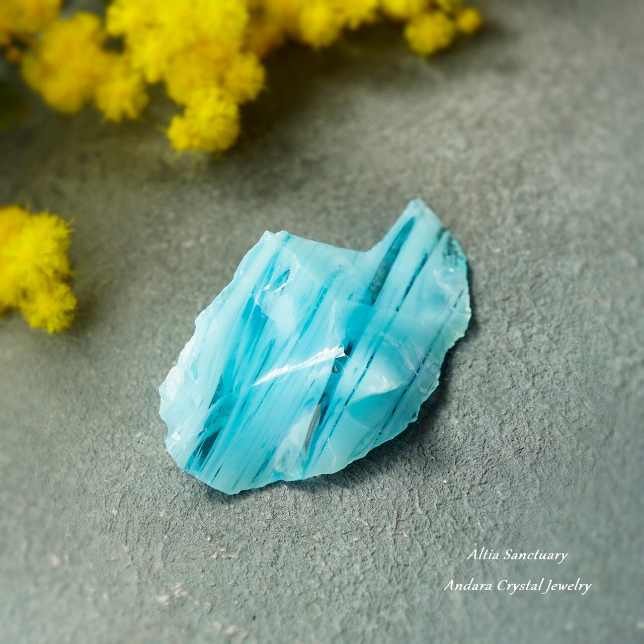 明るい青色「アズールエリュシオン」のアンダラクリスタルです。こちらは、とてもレアなパステルのアズールエリュシオンに、透明感のあるクリアなアズールエリュシオンが層になったアンダラクリスタルです。パステルアイスも入り、柔らかく明るいミルキーな爽やかな水色のアンダラクリスタルです。約13gの中粒サイズのピースになります。