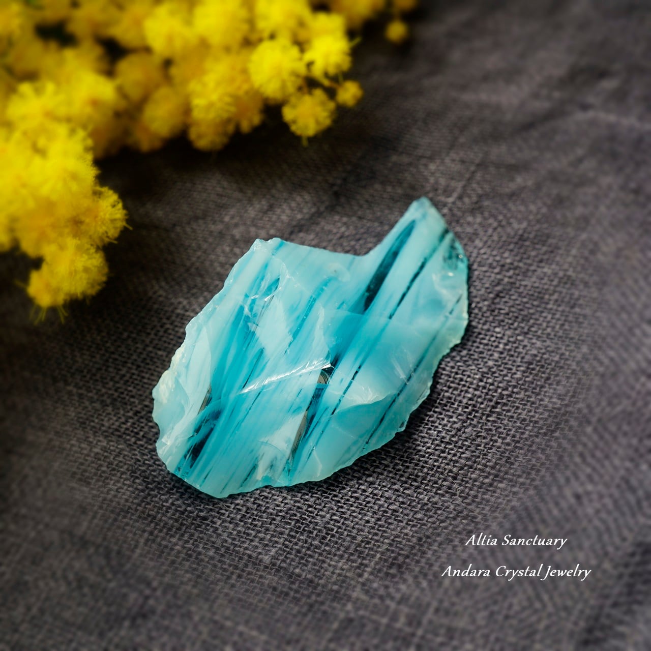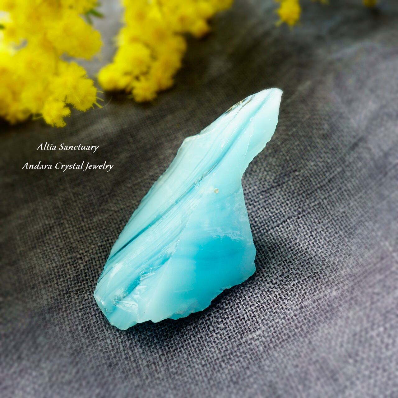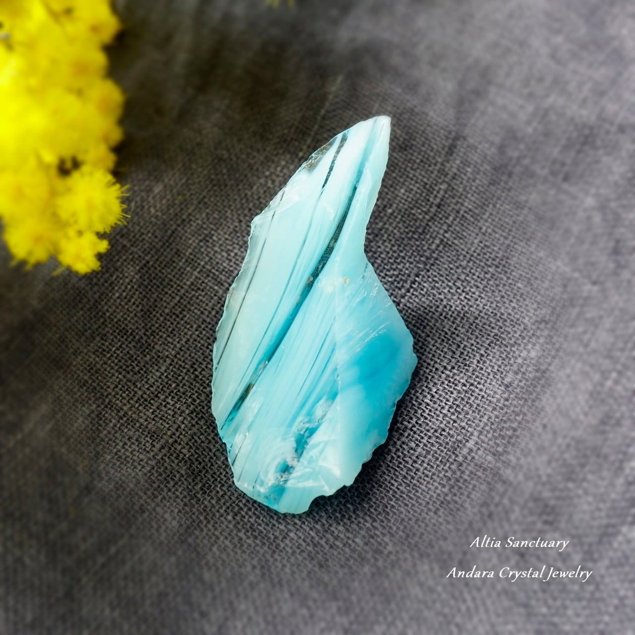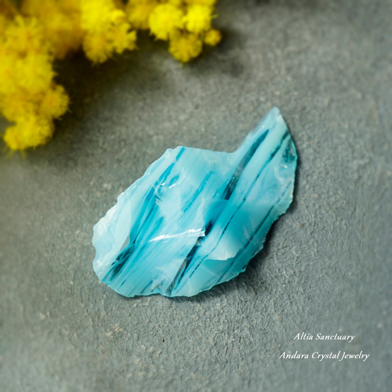 明るい青色「アズールエリュシオン」のアンダラクリスタルです。こちらは、とてもレアなパステルのアズールエリュシオンに、透明感のあるクリアなアズールエリュシオンが層になったアンダラクリスタルです。パステルアイスも入り、柔らかく明るいミルキーな爽やかな水色のアンダラクリスタルです。約13gの中粒サイズのピースになります。