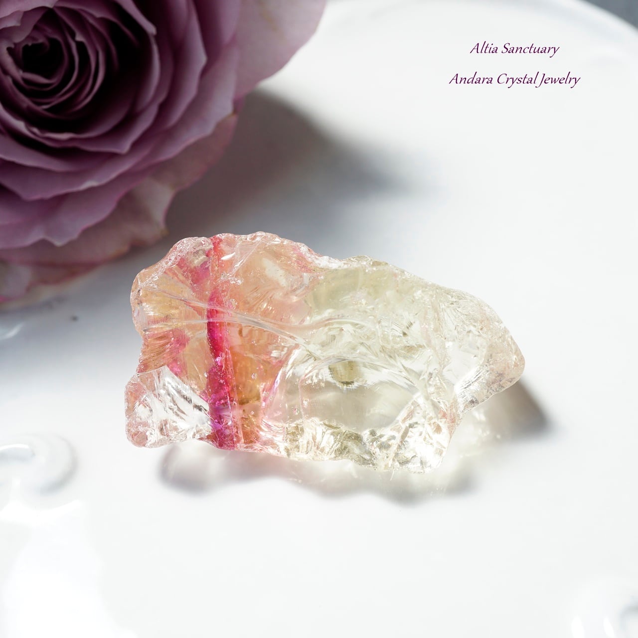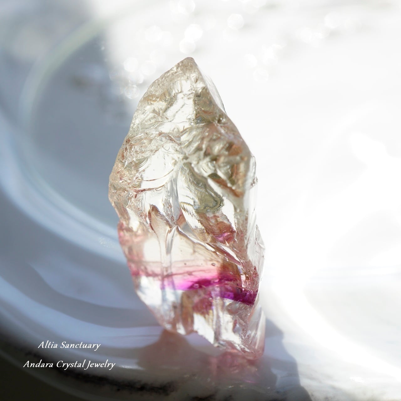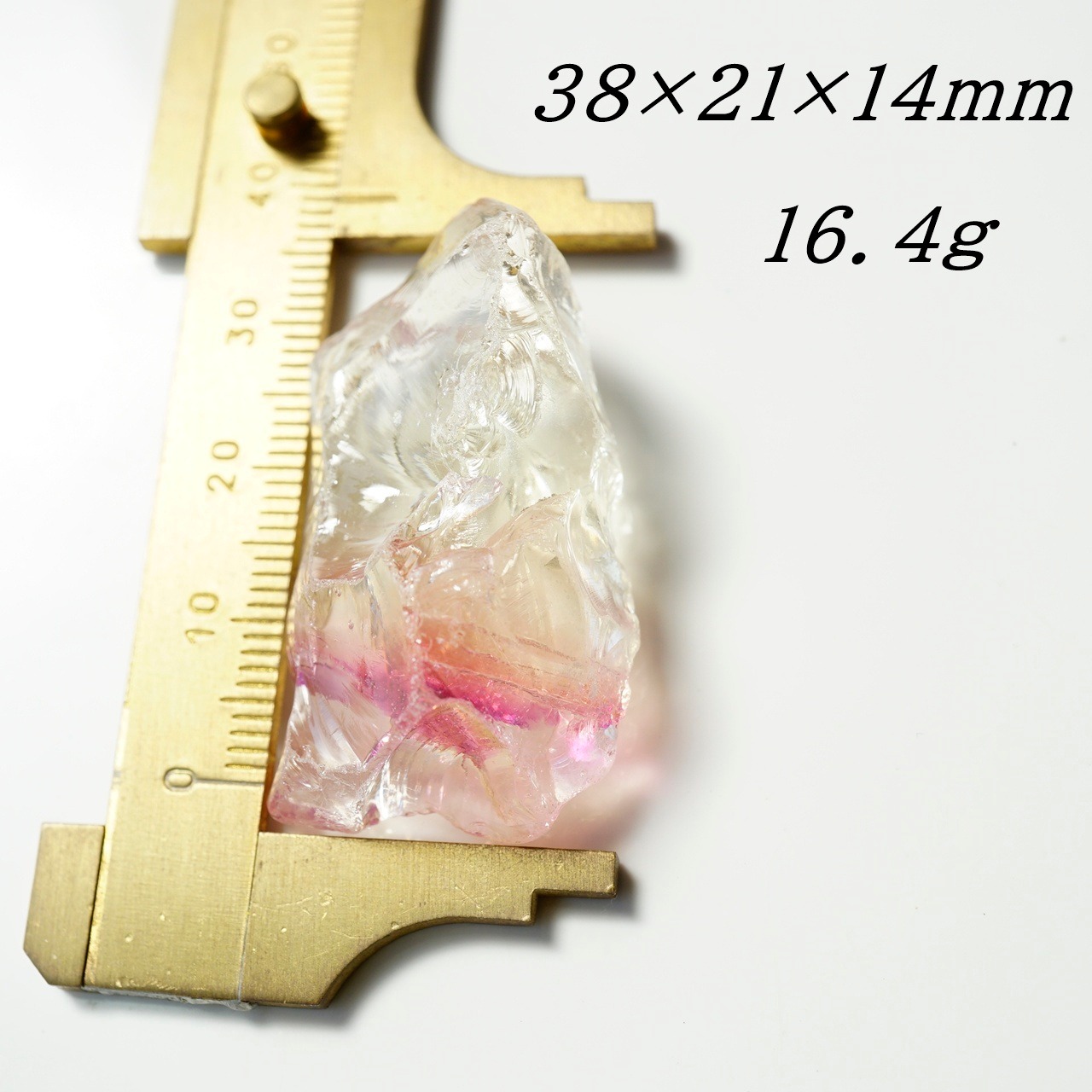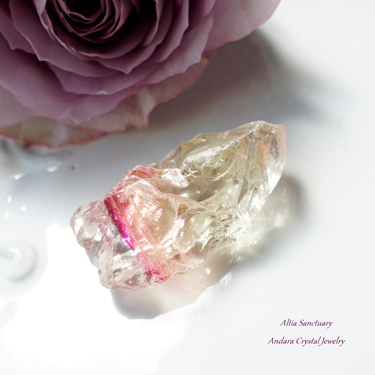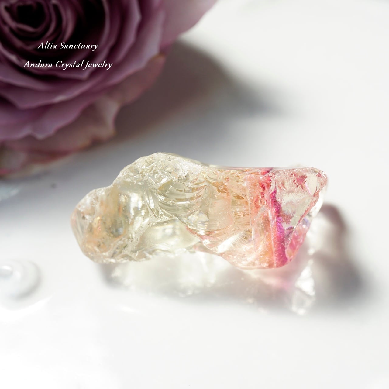 シャンパンゴールドに輝く「セレスチャルゴールド」に、ピンクが染まる美しく愛らしい希少なアンダラクリスタルです。ピンクは「HGWピンク」に「ソフィア」が、また「ヴァイオレット」がライン状に入っています。16.4gの中粒ピースになります。
