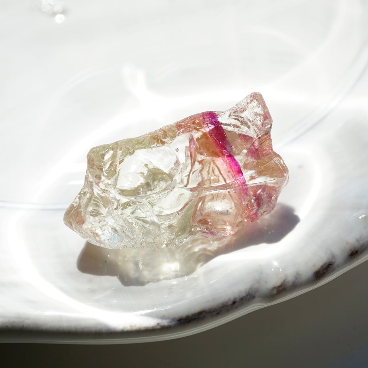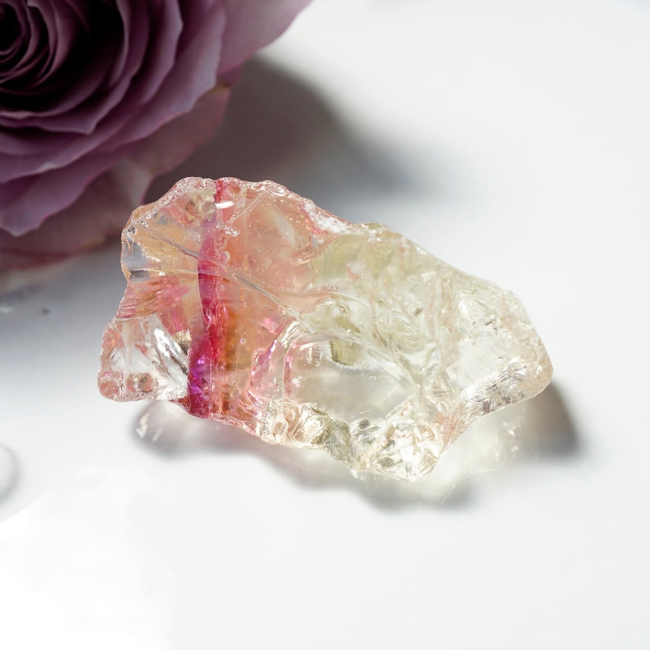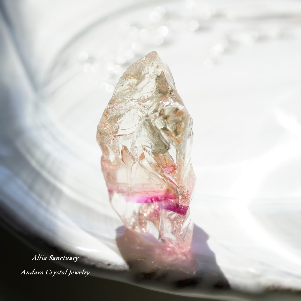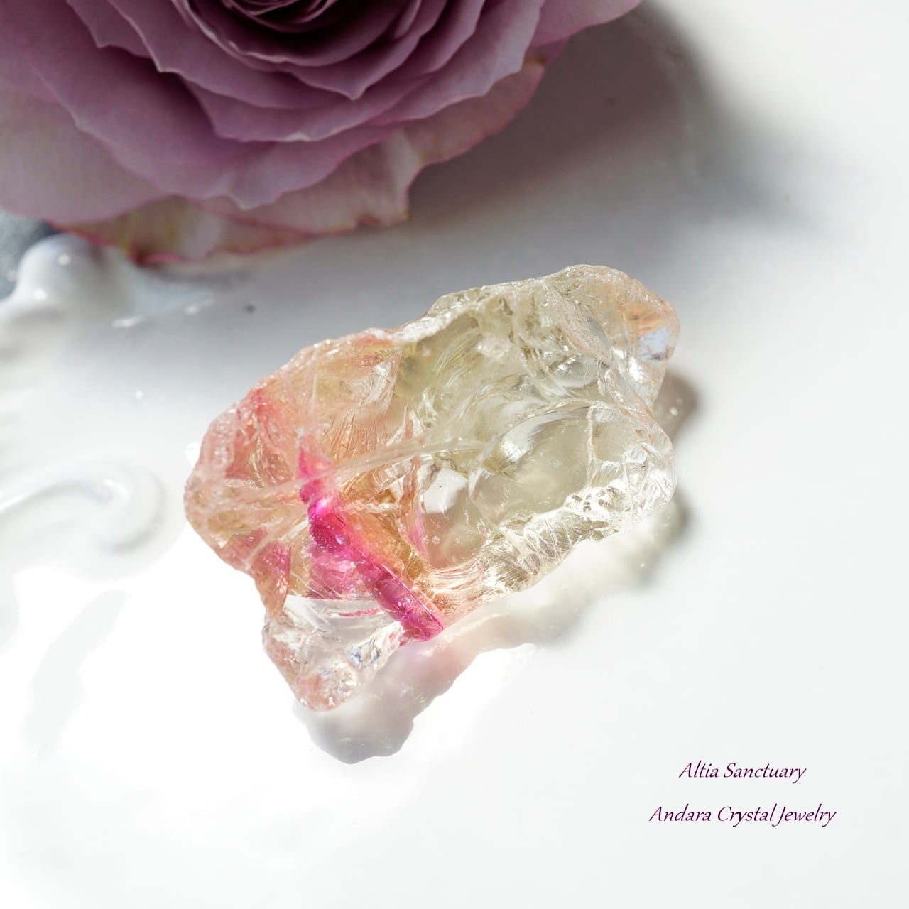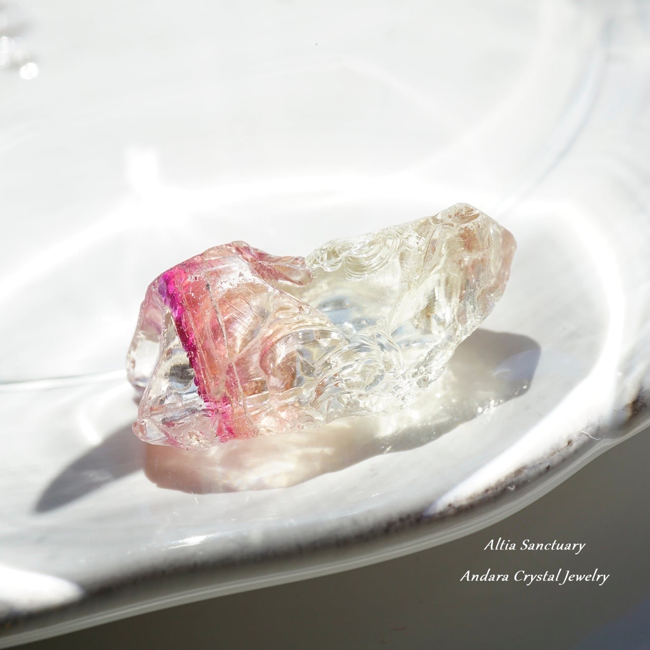 シャンパンゴールドに輝く「セレスチャルゴールド」に、ピンクが染まる美しく愛らしい希少なアンダラクリスタルです。ピンクは「HGWピンク」に「ソフィア」が、また「ヴァイオレット」がライン状に入っています。16.4gの中粒ピースになります。