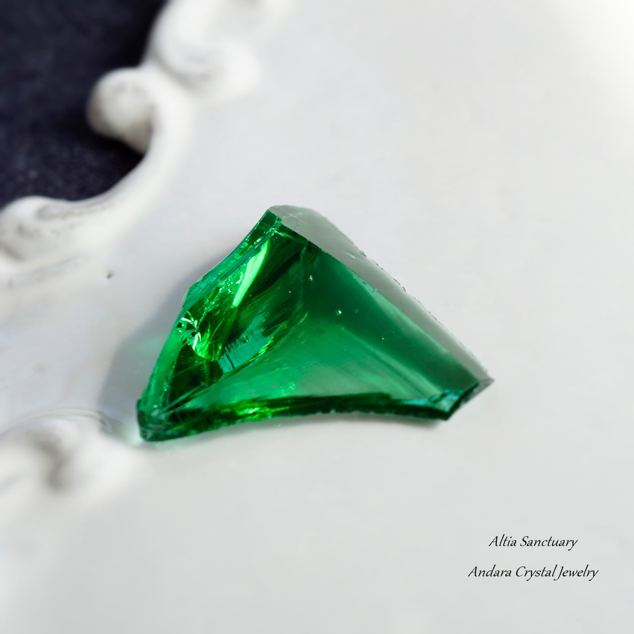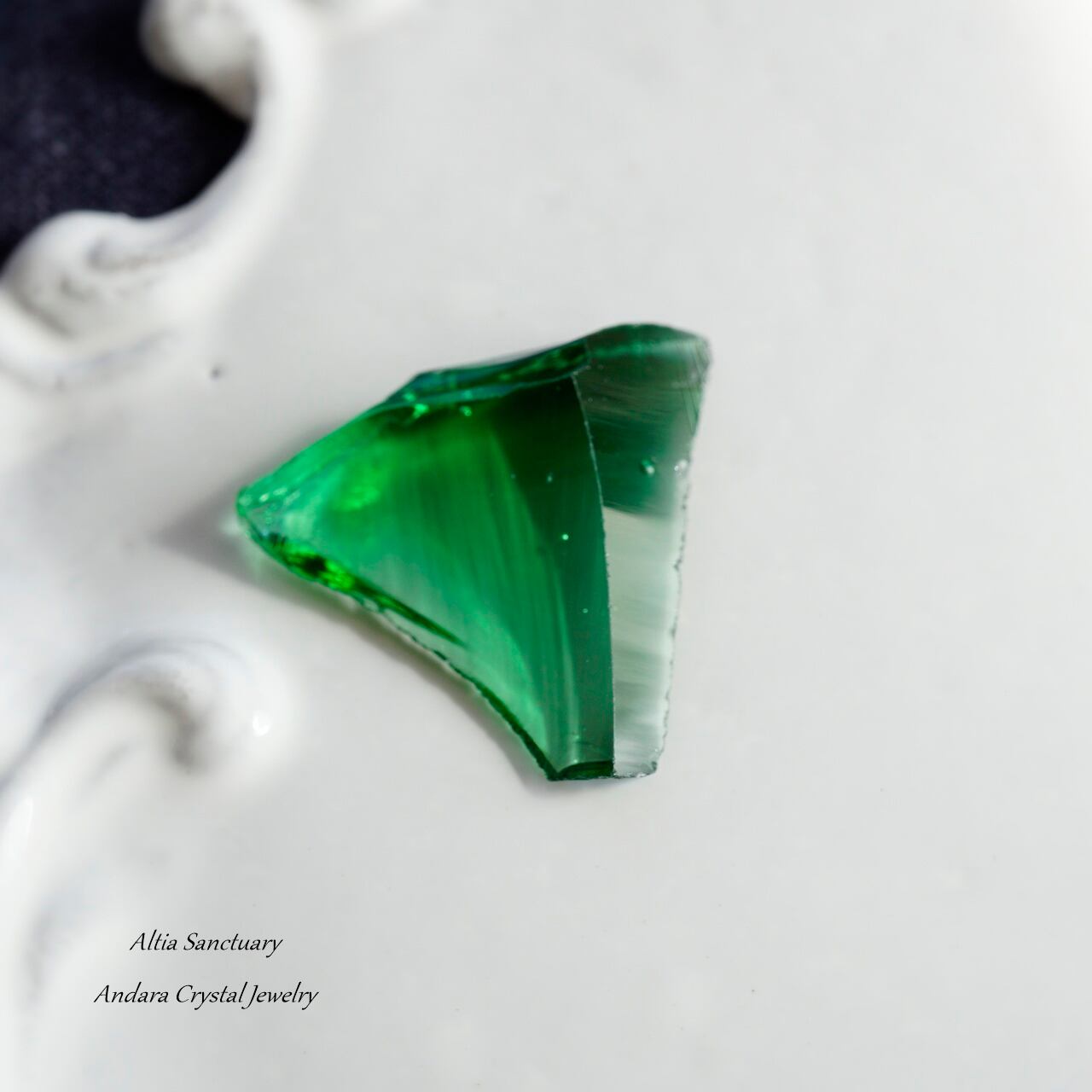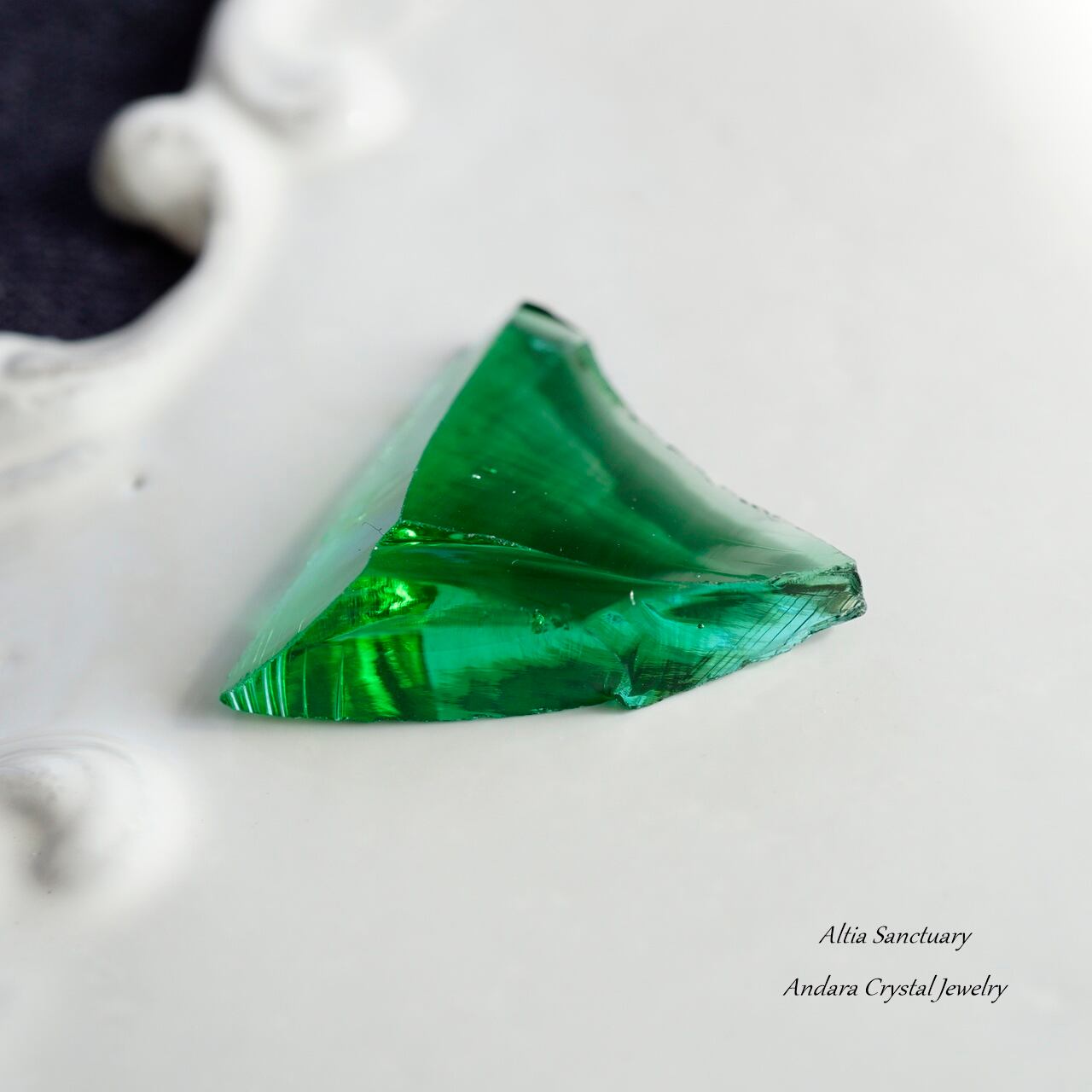 深いエメラルドグリーンが美しい「エメラルドシフト」です。三角形のかたちをした小粒ピースになります。