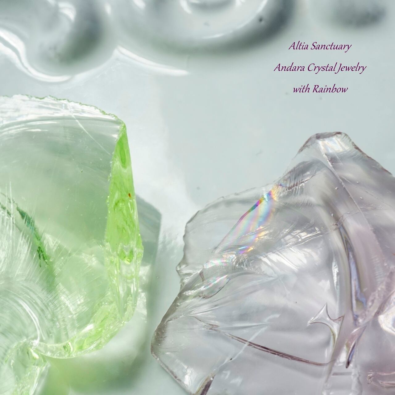 アンダラクリスタルは、黒曜石(オブシディアン)に似たガラス質で、ゴールド・シルバー・イリジウム・ロジウム・クロミニウム・プラチナなどの単原子成分が含まれており、レインボーの7色以上の美しいカラーを放つ魅力を持っています。